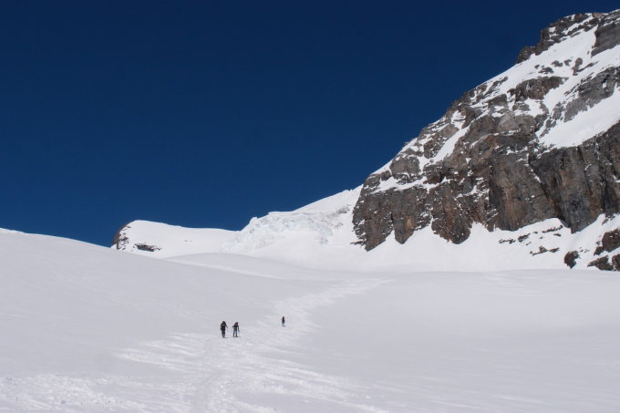 Am Dienstag hatten wir noch fast durchgehend Schnee ab der zweiten Brücke bei Sandwiti (1042 m). Start um 5:00 mit Velo in Tierfehd. Tragestellen in Vorder- und Hintersand. Abstrahlung nach Aufklarung in der zweiten Nachthälfte reichte aus für tragende Schneedecke im Tentiwang. Ab Gletscherbrüche lag etwas Neuschnee vom Vortag. Oberhalb 2800m stark klebend (Stollen). Gipfelhang war gut zu gehen (Harscheisen nicht notwendig).