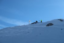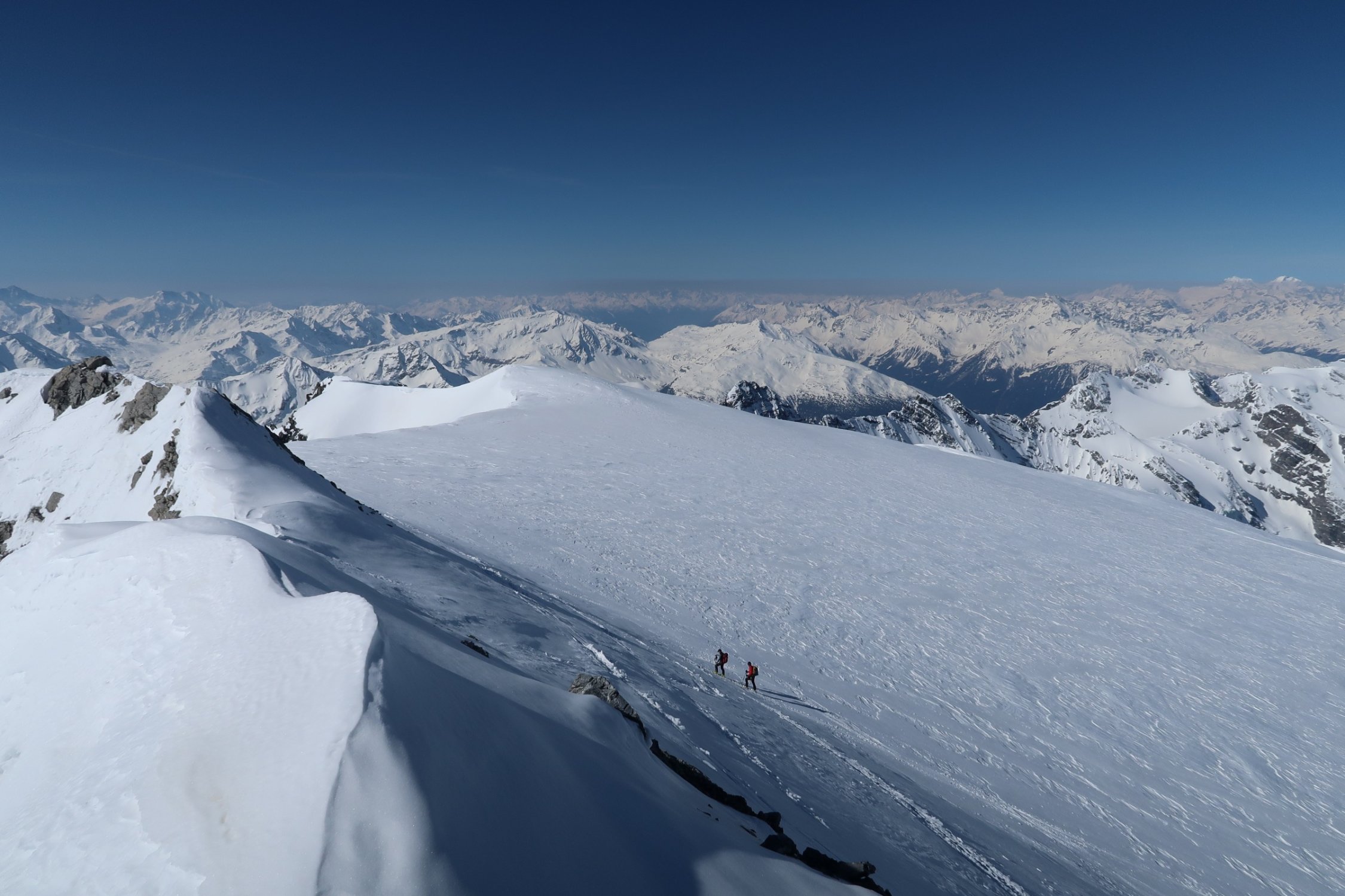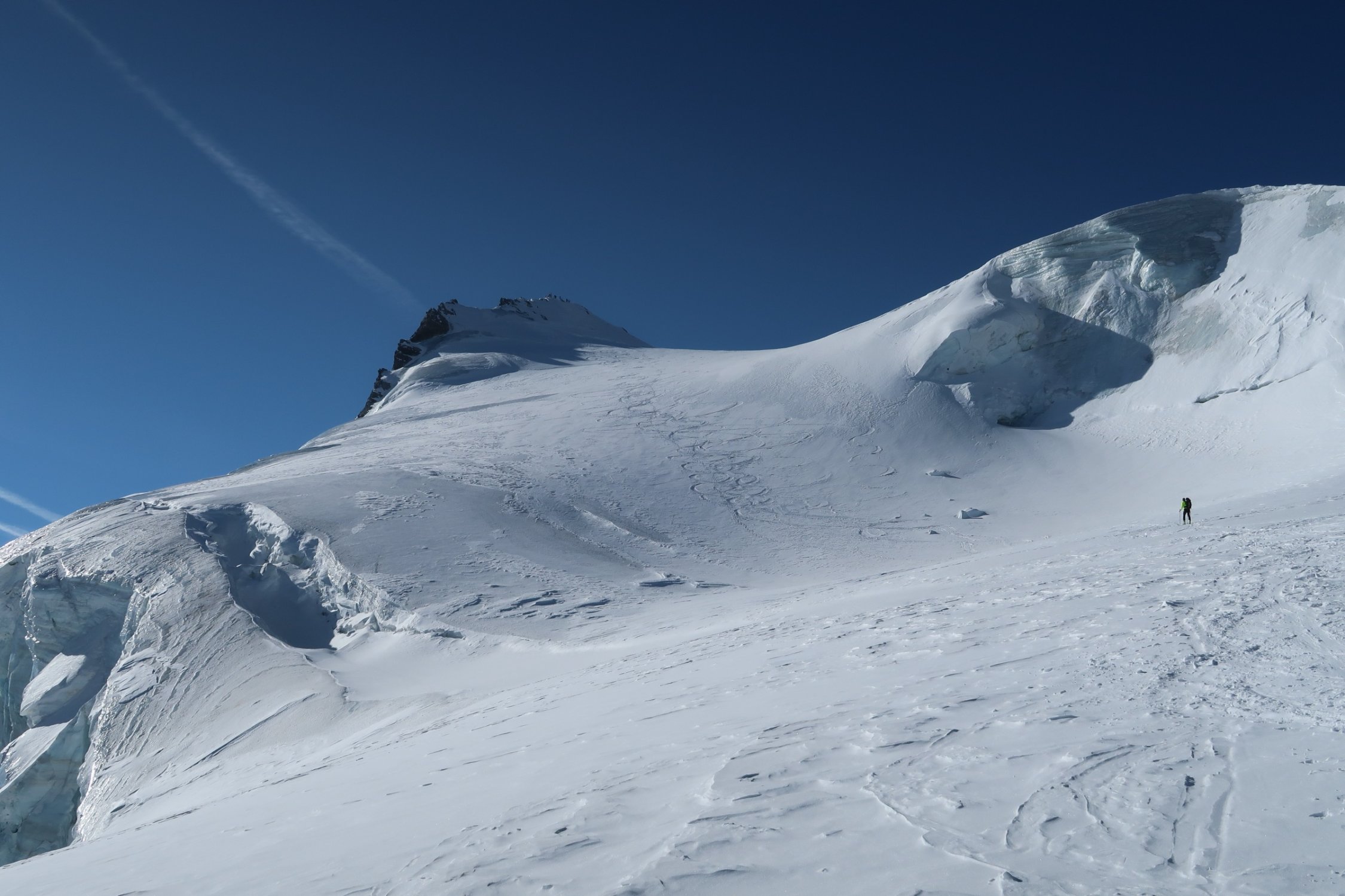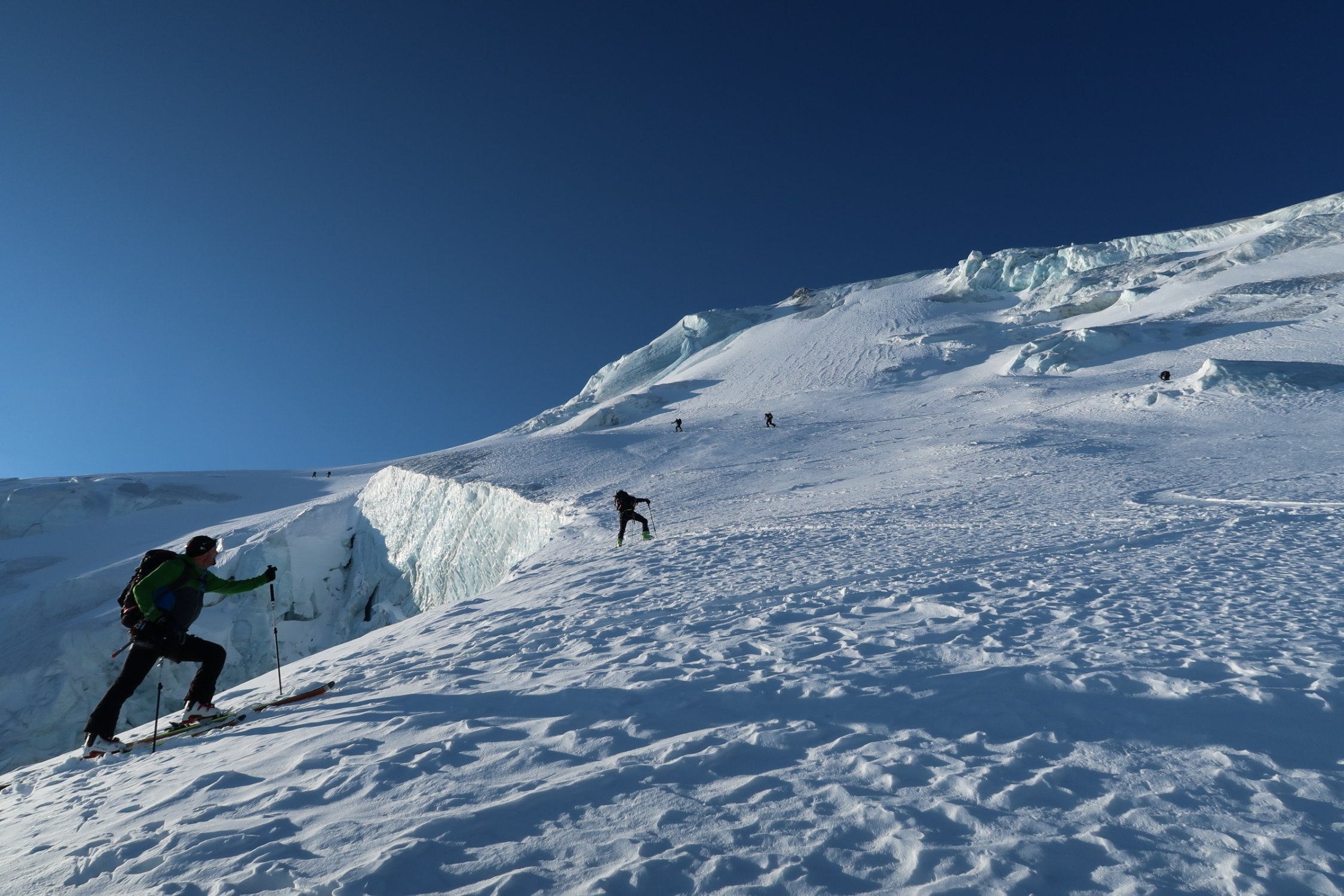 Viel Schnee am Ortler, Spalten sind fast alle zu. Sind mit Skiern von den Drei Brunnen bis zum Gipfel.