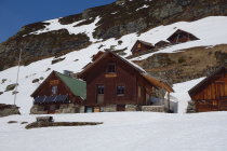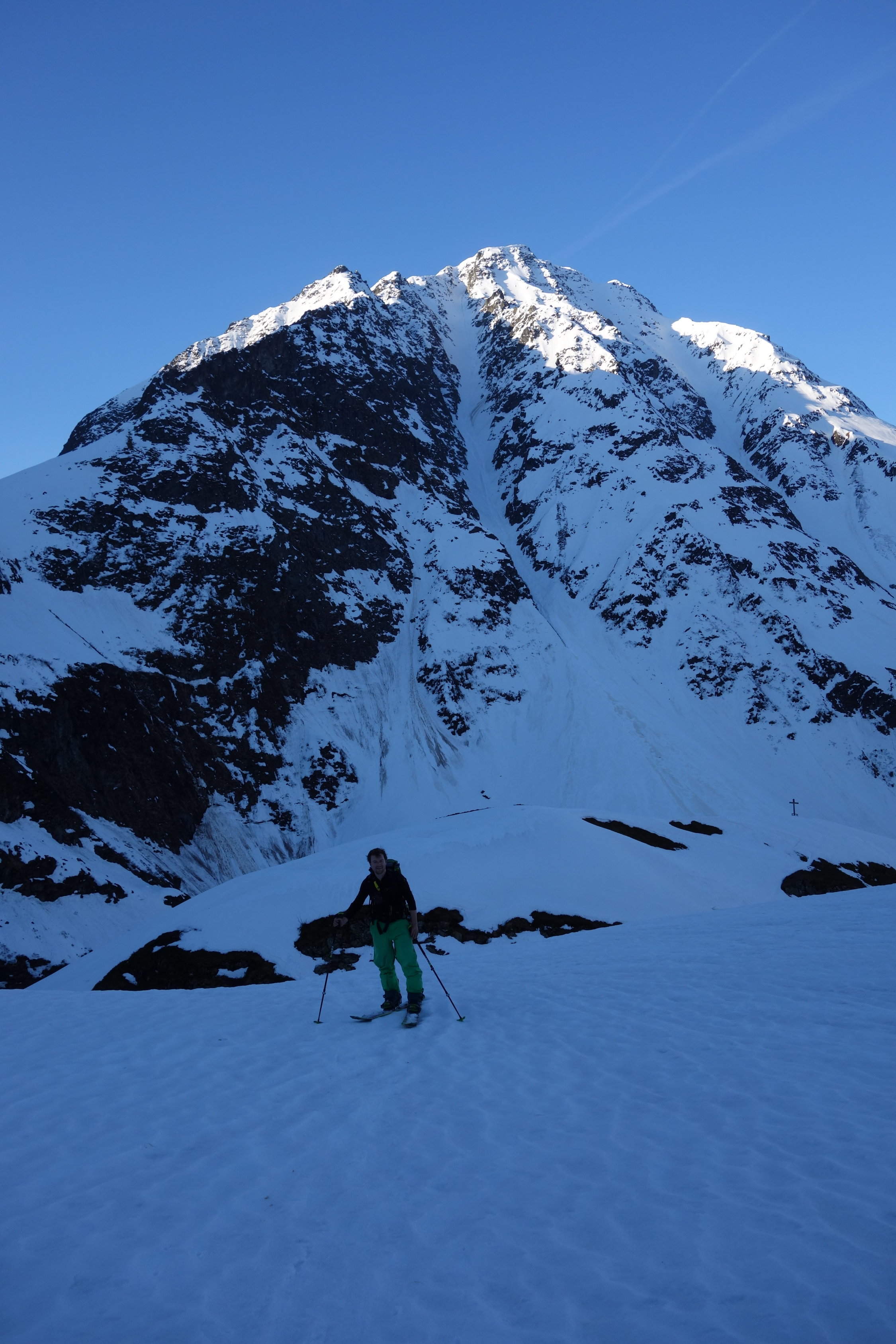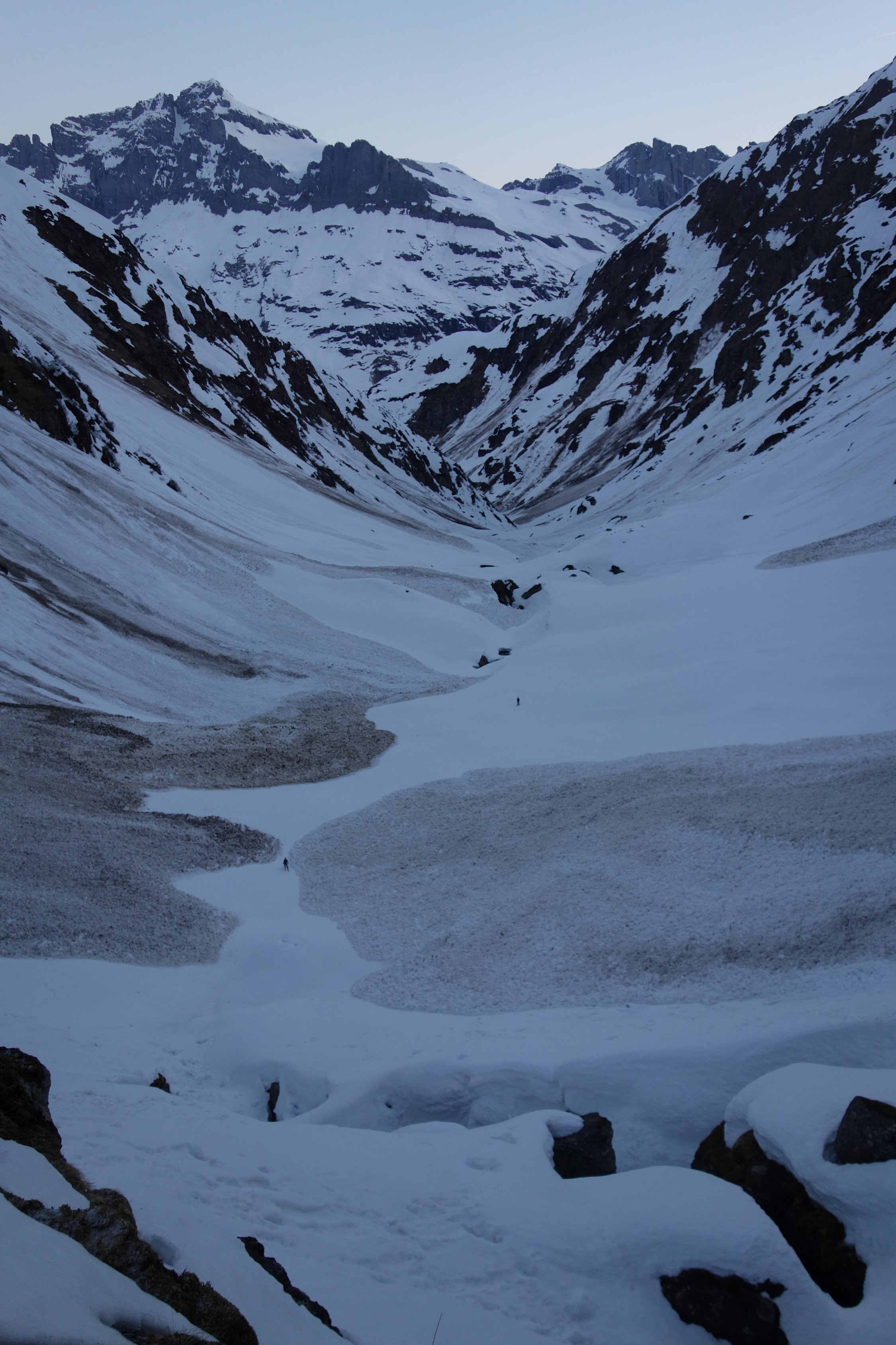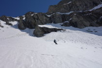 Um ca 5:45 Abfahrt Cavadiras Hütte zur Hinterbalmhütte. Schnee oben gefroren unten unverlässlicher Deckel. Tal hat noch viel Schnee aber Wegfindung sehr schwierig aufgrund von Lawinenkegeln, man muss daher ab und zu die Flussseite entgegen der Normalroute wechseln. Aufstieg ab Hinterbalm bis zum Couloir ging mit Harscheisen Problemlos. Da im Colouir relativ viel Schneebrocken waren, haben wir dort Skidepot gemacht und weiter mit Steigeisen. Im oberen Teil des Couloirs schauen schon ein paar Felsen raus, es wurde aber heute abgefahren.