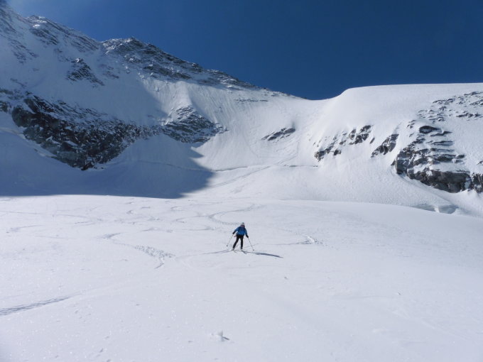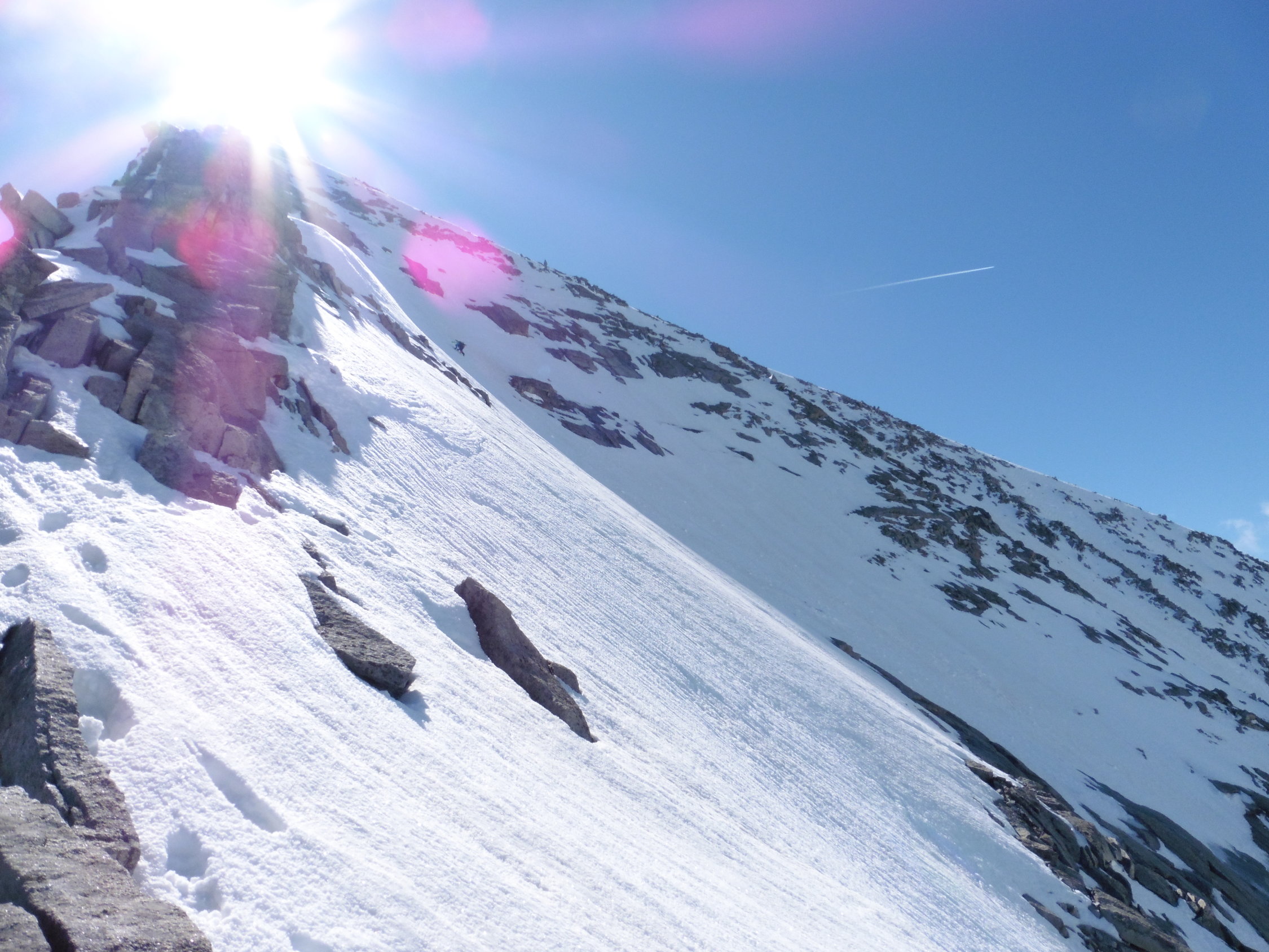 Von Rein in Taufers zur Kasseler Hütte (bewirtschaftet) Am nächsten Morgen unter die Hochgall-Nordwand bis zum Bergschrund mit Ski, dann durch die Wand zu Fuß. Pickel und 2 Eisgeräte hilfreich. Abstieg über die Westflanke bis zur Schulter. Dann Abfahrt bis zur Furtalm