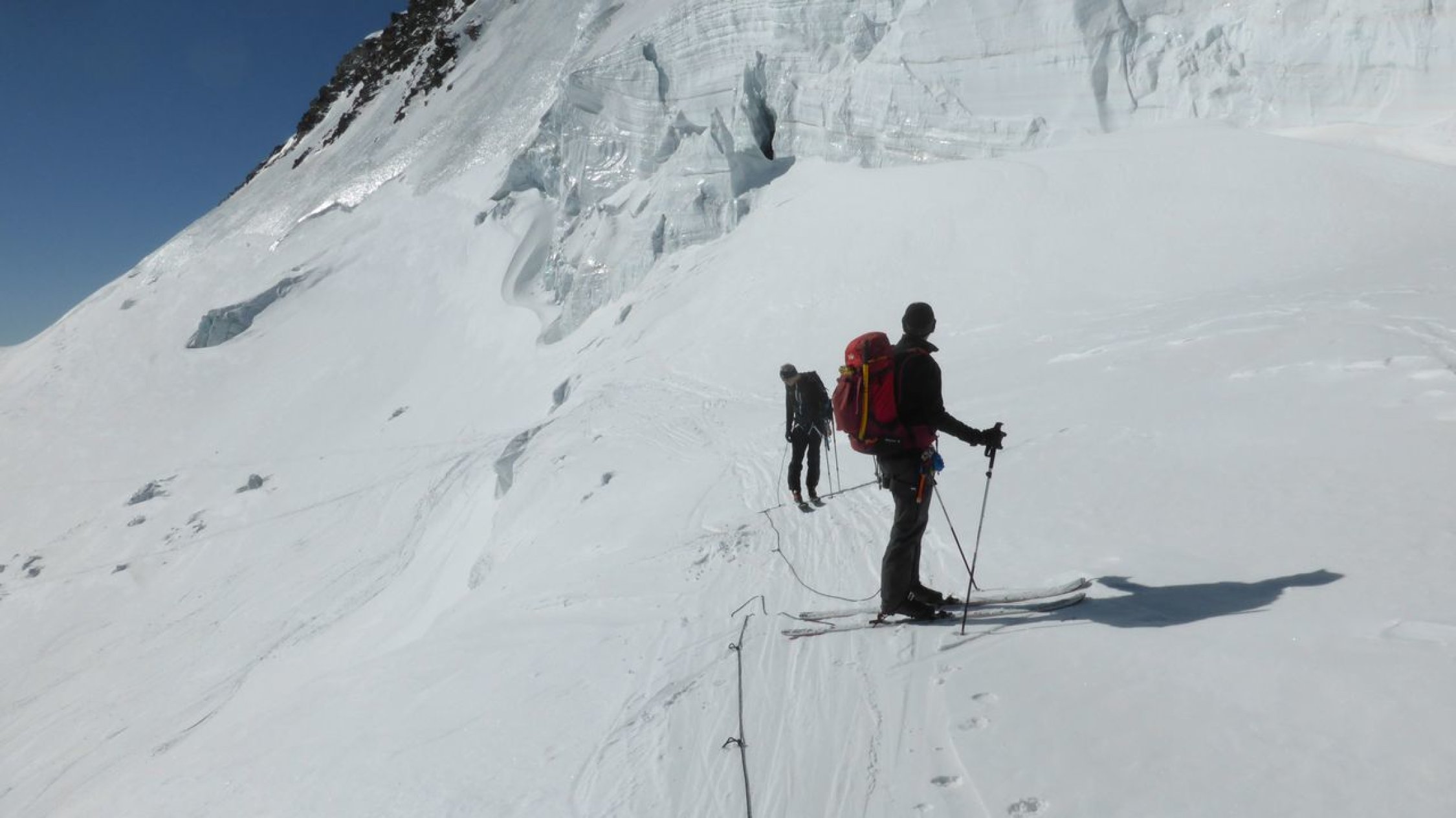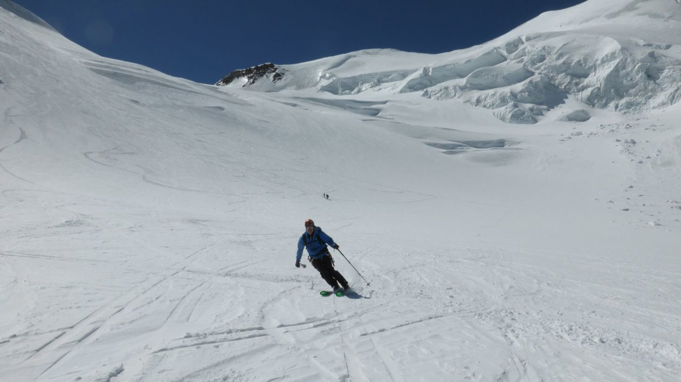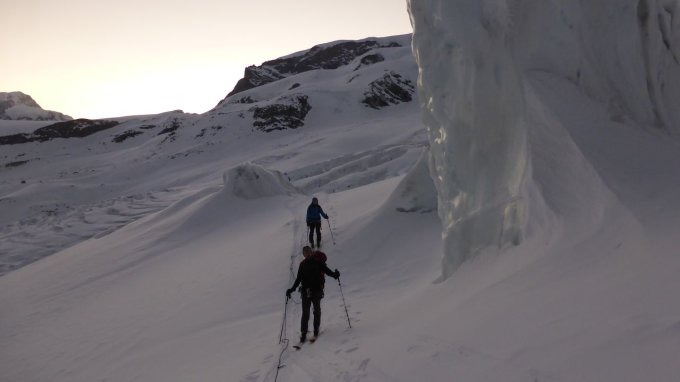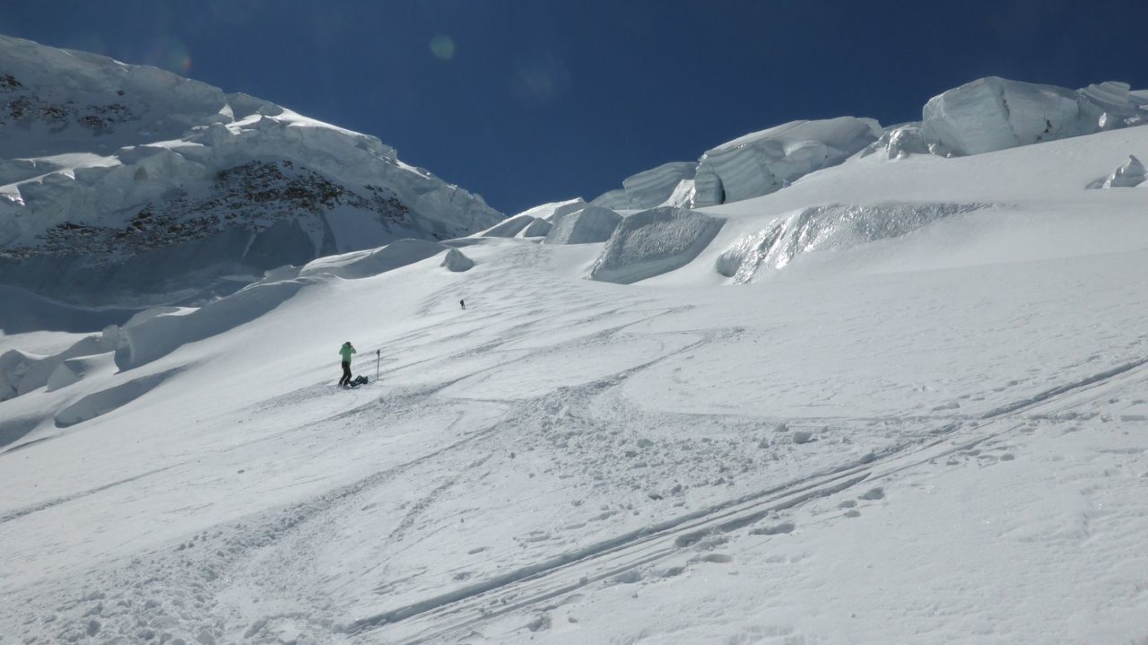 Wir fanden für die Tour beste Verhältnisse vor: klare Nacht, wolkenloser Tag, gut eingeschneiten Gletscher, ausgezeichnete Aufstiegsspur, welche die Orientierung um vieles erleichterte. Die Sérac-Zonen wurden geschickt umgangen. Lediglich der Sérac beim direkten Gipfelanstieg bereitete etwas Sorgen.