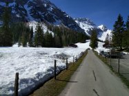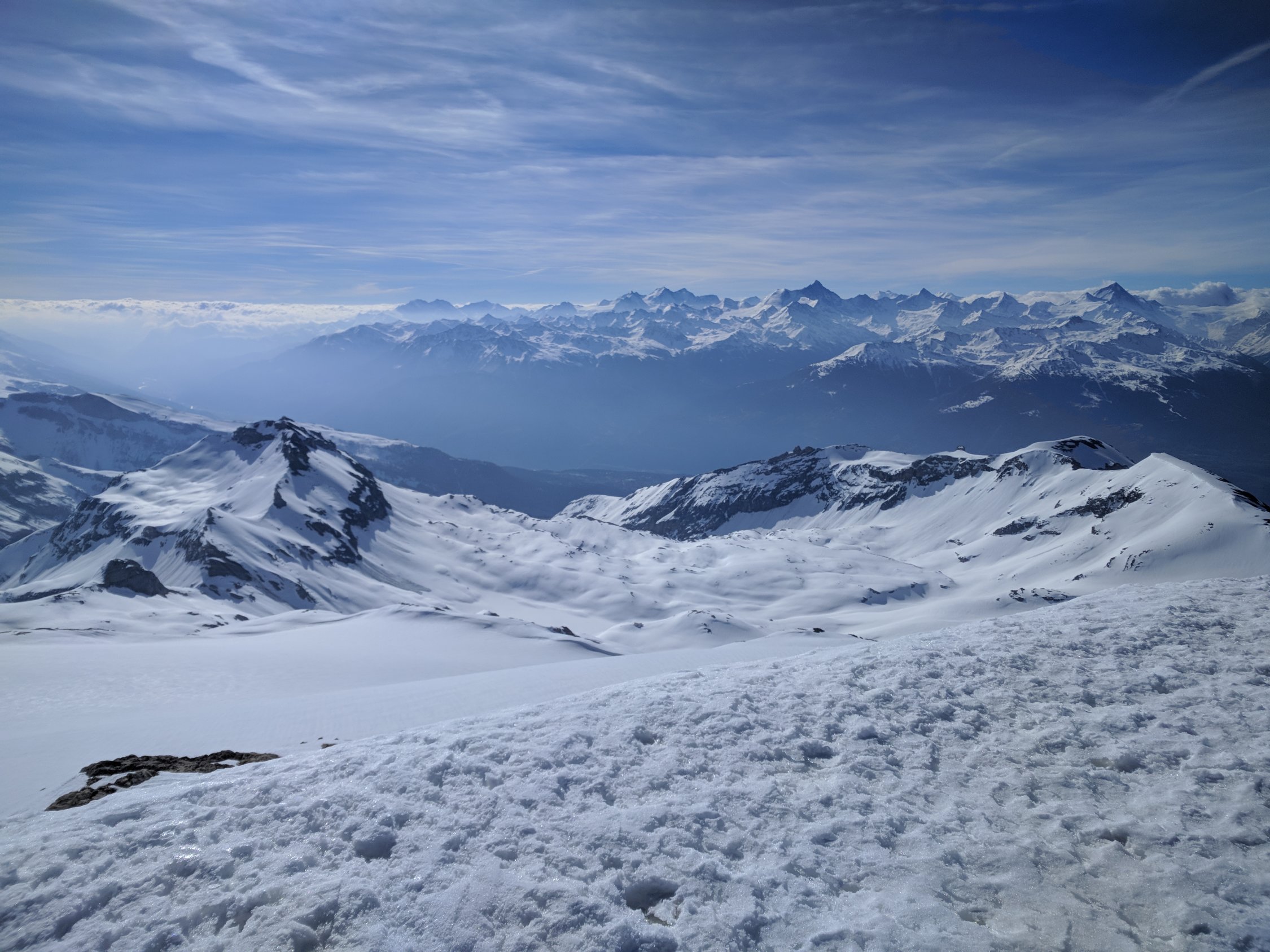 Bei der Abfahrt um 9:30, oben hart, ab 2900 aufgefirnt, ab 2600 in der Sonne Sulz. Unterhalb 2000 Nassschnee, bereits um 10 ziemlich schwer.