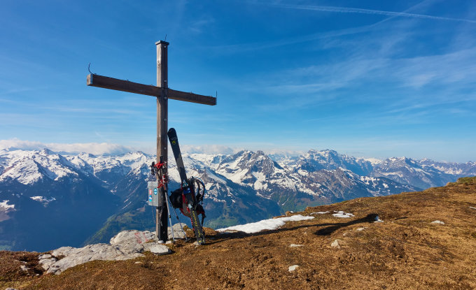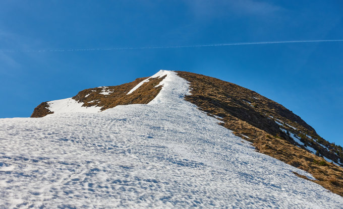 Ab Alp Looch hat es meistens Schnee. In der Nordwestflanke hat es kleine Fischmäuler. Auf dem Grat hat nur noch die Wächte Schnee und die ist z.T. sehr schmal.
