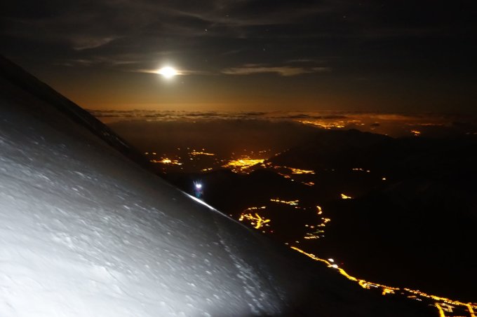 Taculflanke hat ein Bergführer am 24.4. fast komplett mit Ski begangen, wir sind der Spur grösstenteils zu Fuss gefolgt. Relativ fester, windgepresster Schnee. Mauditflanke ähnlich aber stellenweise vereist. Permanente Spindriftduschen durch windverfrachteten Eispartikel. Oben raus Flanke 70m 50° steil, 10cm fester Presspulver auf Blankeis. Fixseil bis 10m unter Ausstieg vorhanden. Zum Gipfel des Mt.Maudit angenehmer Trittschnee. Mur de la Brenva auf 10m 45° Blankeis, Eisgerät sehr nützlich, Einschrauben haben wenig halt da 2-3cm Blankeis auf Pulver.