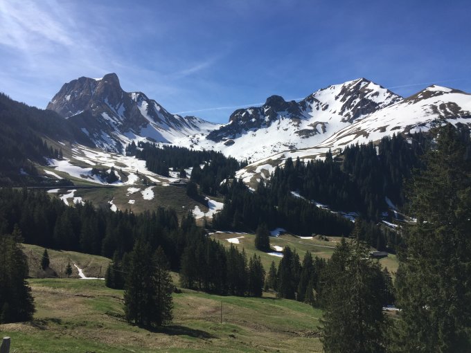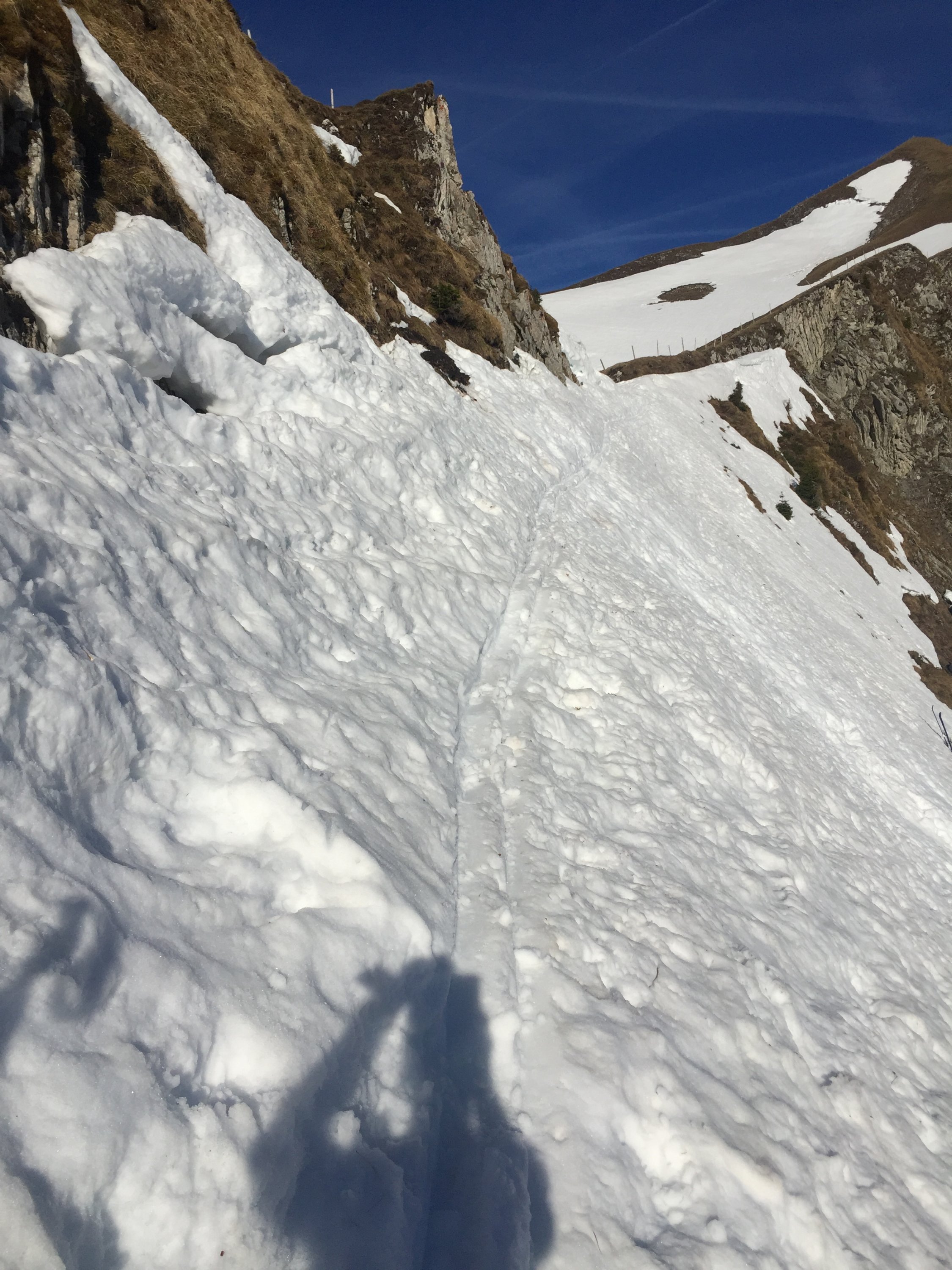 Start um 07:30, durchwegs gefrorene Unterlage. Statt auf dem Bergweg, ab Pt. 1613 / Oberi Gantrischhütte durch die Mulde Richtung Chummlihütte. Morgetepass wie erwartet pickelhart, aber auf guter Spur machbar.