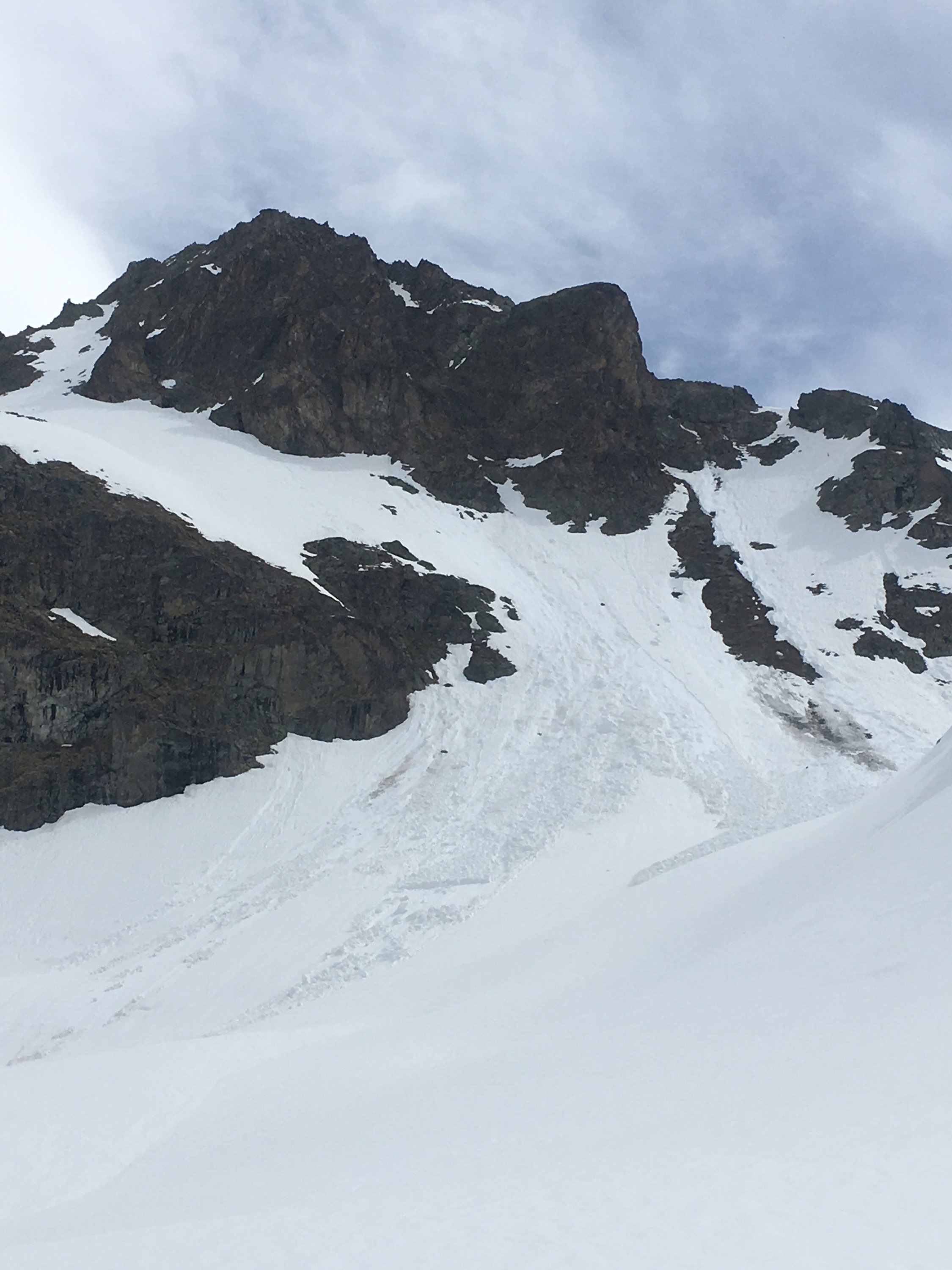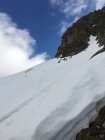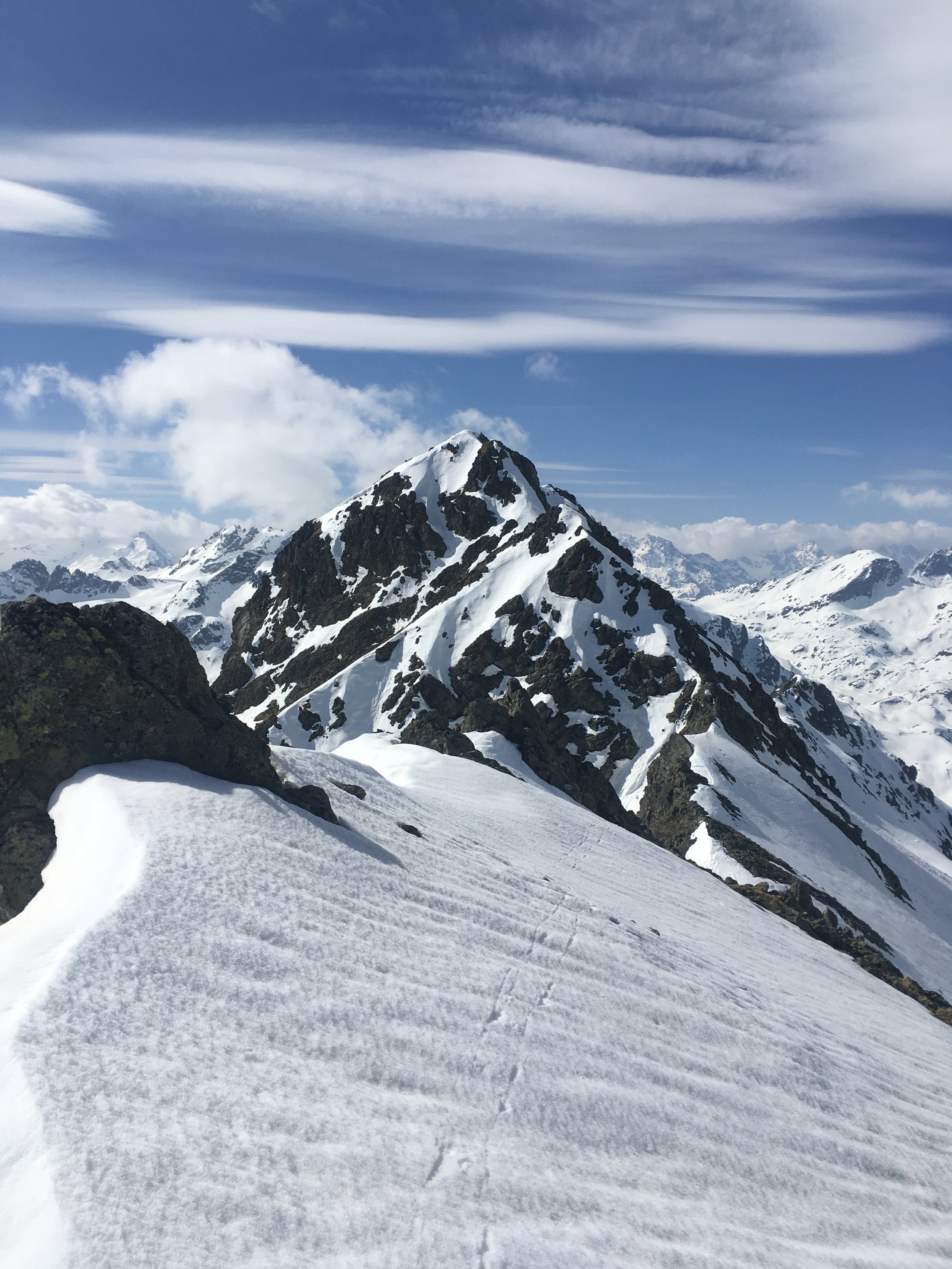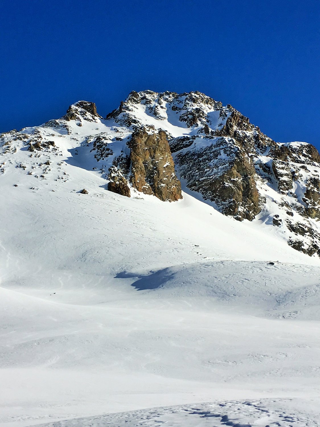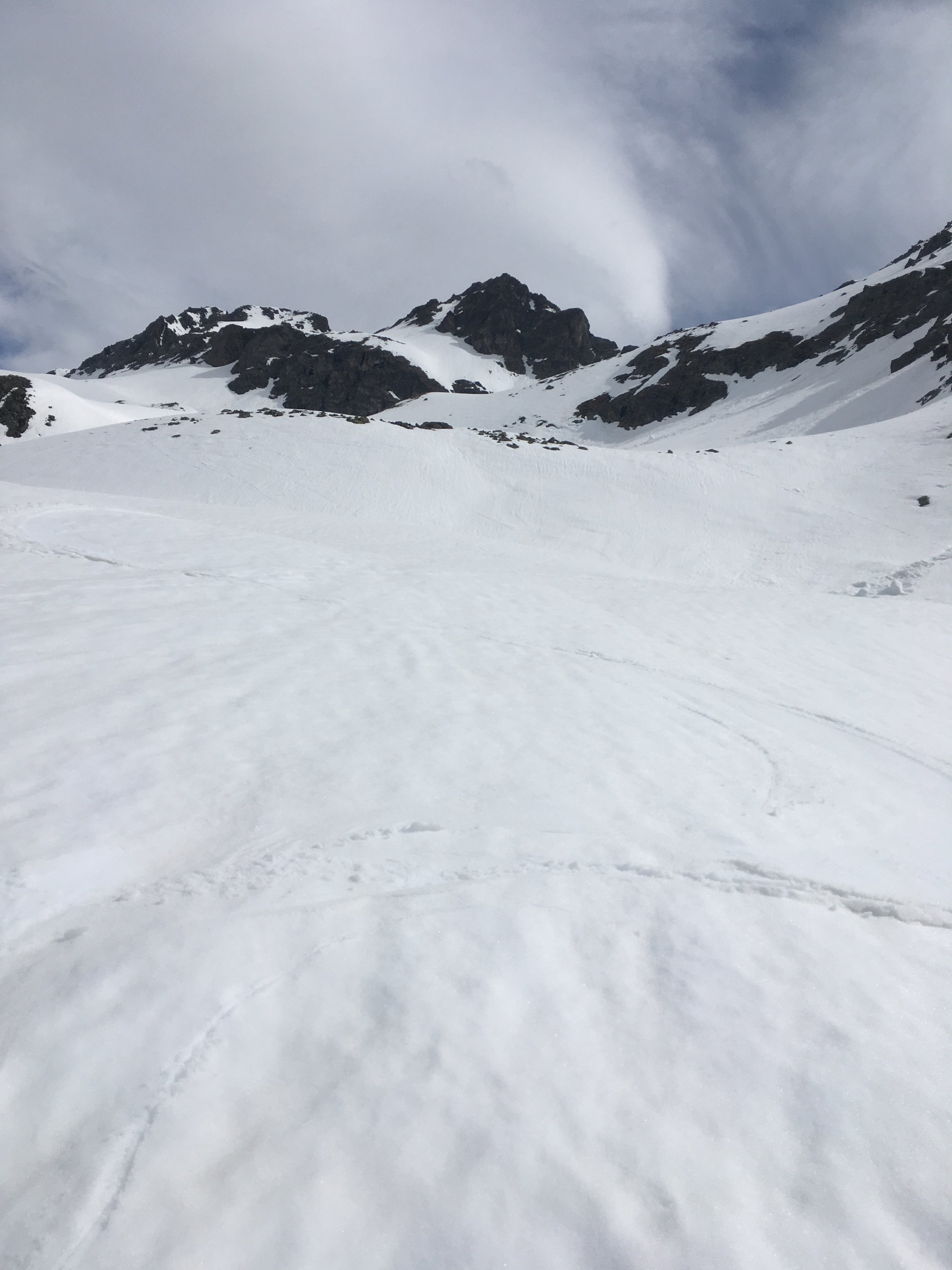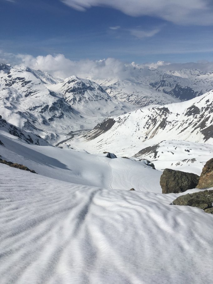 Start um 6 Uhr. 1 Grad, windstill. Perfekte Firnverhältnisse im Aufstieg. Bei der Schlüsselstelle auf Höhe 2800 m hat mich der Mut verlassen, die steile Traverse zu begehen (Absturzgefahr). Bin auf Grat geklettert ohne Ski zu Sattel südlich P. 2917. Zurück auf 2700 m habe ich dann das schöne Couloir westlich P. 2917 entdeckt und bin dort auf das Plateau hochgestiegen, ca. 45 Grad steil. Das Couloir befindet sich genau beim Doppel ll (Valletta) in der Karte. Nun weiter bis zum Sattel westlich P. 2903. Das hat mir gereich für heute. Fussaufstieg zum Gipfel via Vorgipfel oder zuerst Traverse Richtung P. 2903 und weiter auf Gipfel. Der Schnee auf Südseite des Sattels war aber schon feucht und nicht durchgehend. Auf der Karte sieht der Gipfelbereich einfacher aus.