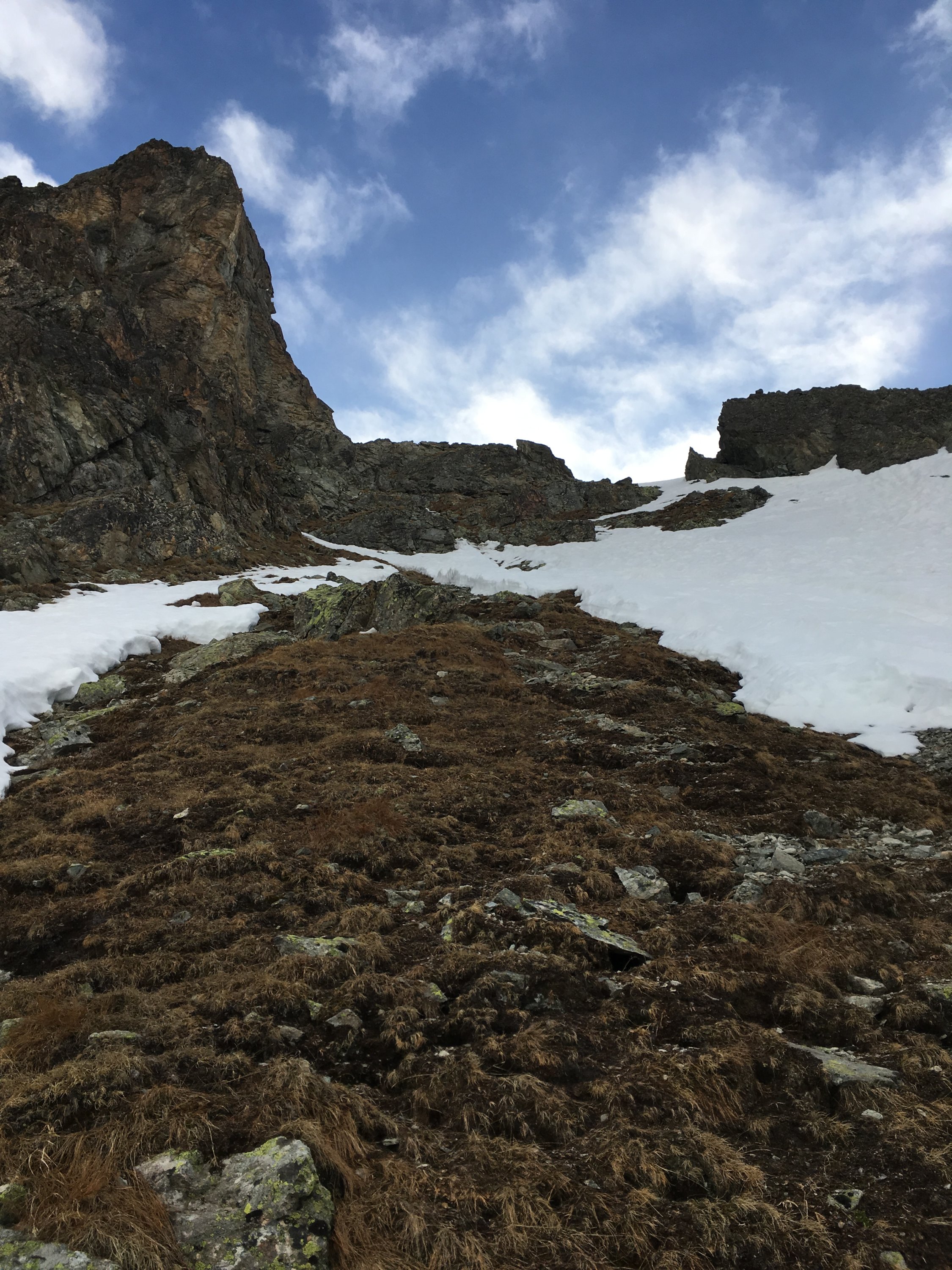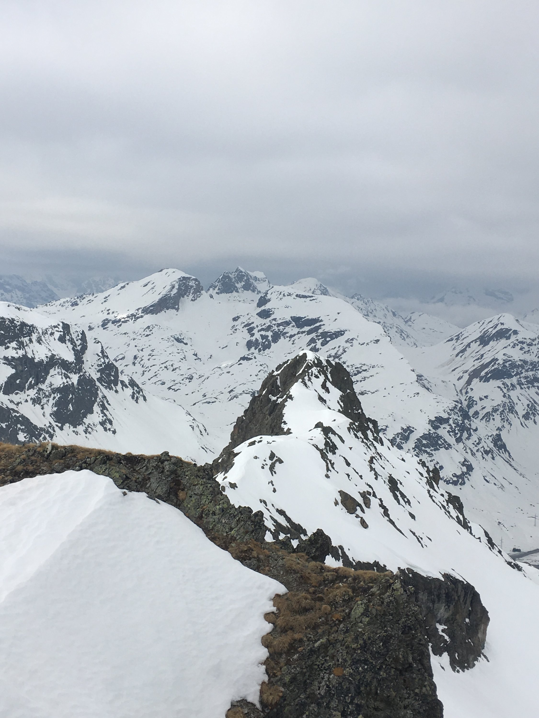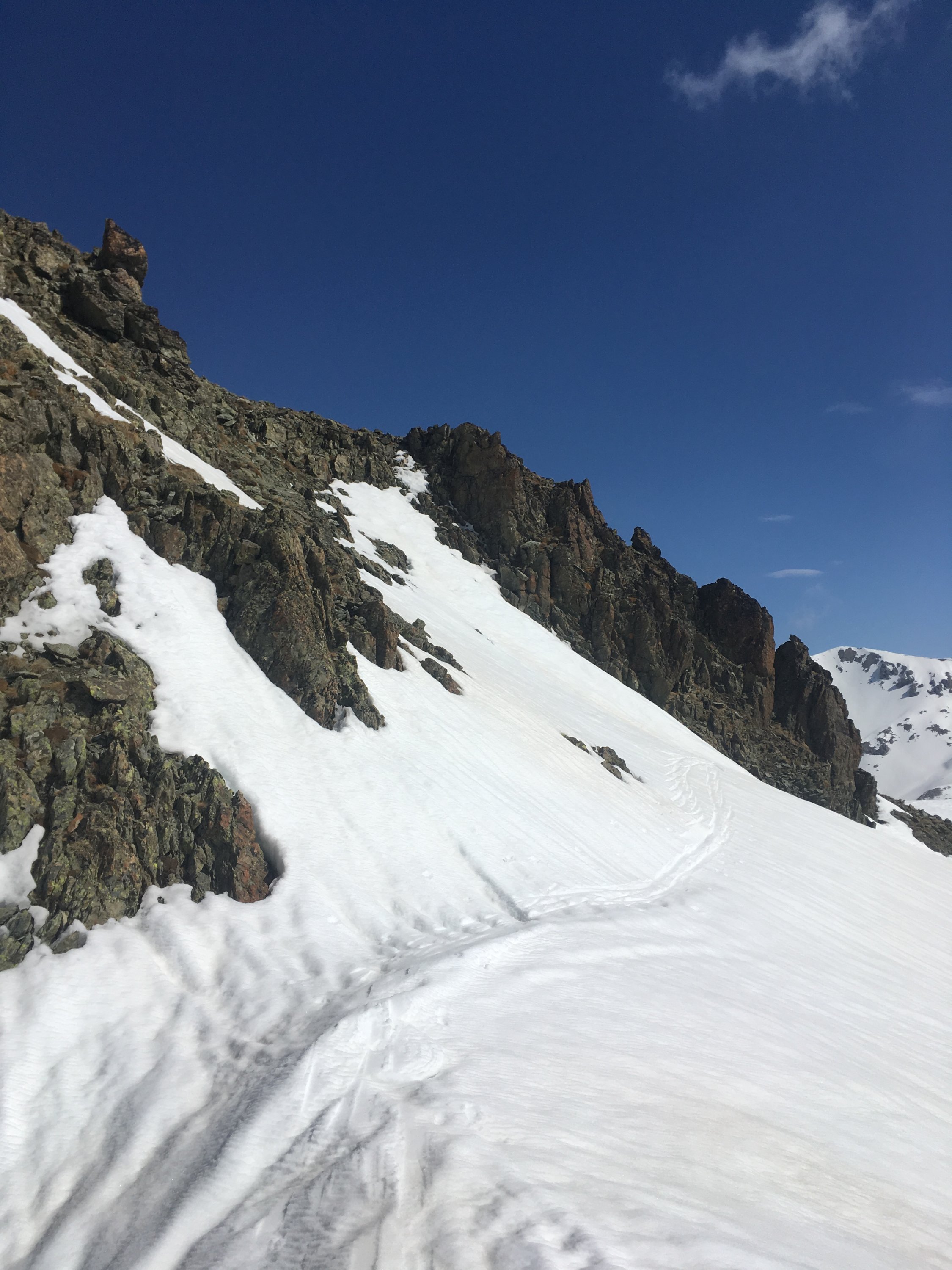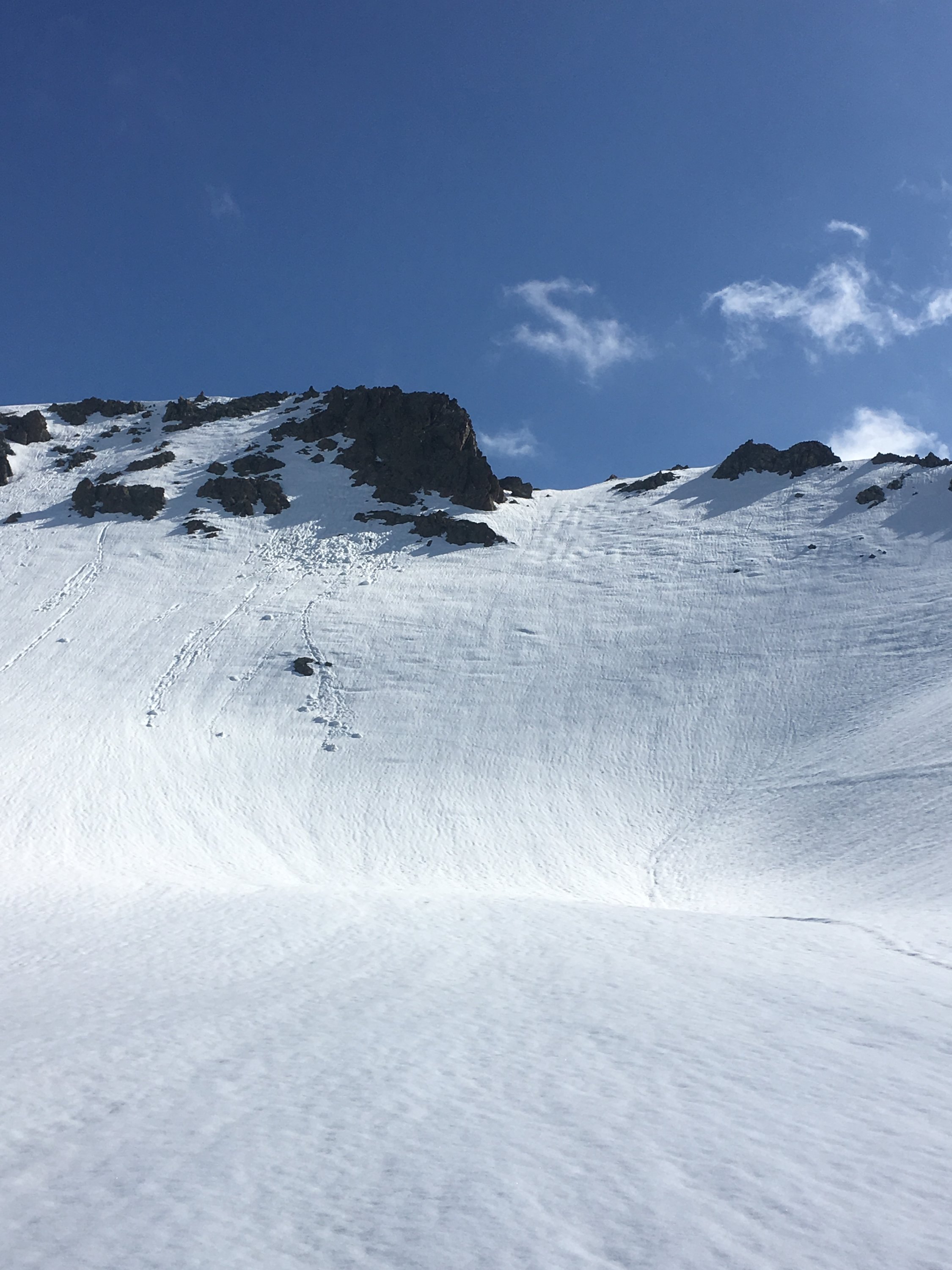 Start um 6 Uhr. 1 Grad, windstill. Perfekte Firnverhältnisse im Aufstieg. Bei der Schlüsselstelle auf Höhe 2800 m hat mich der Mut verlassen, die steile Traverse zu begehen (Absturzgefahr). Bin auf Grat geklettert ohne Ski zu Sattel südlich P. 2917. Zurück auf 2700 m habe ich dann das schöne Couloir westlich P. 2917 entdeckt und bin dort auf das Plateau hochgestiegen, ca. 45 Grad steil. Das Couloir befindet sich genau beim Doppel ll (Valletta) in der Karte. Nun weiter bis zum Sattel westlich P. 2903. Das hat mir gereich für heute. Fussaufstieg zum Gipfel via Vorgipfel oder zuerst Traverse Richtung P. 2903 und weiter auf Gipfel. Der Schnee auf Südseite des Sattels war aber schon feucht und nicht durchgehend. Auf der Karte sieht der Gipfelbereich einfacher aus.