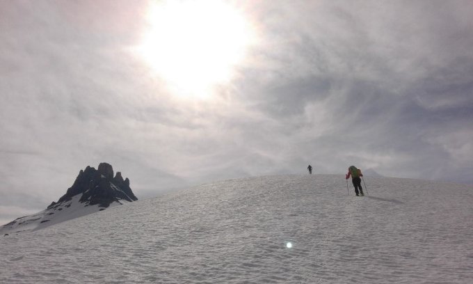 Der Aufstieg haben wir zu Fuss, mit Schneeschuhen und mit Tourenski gemacht. Alles ging gut, aber wenn der Schnee warm wird ist man froh Schneeschuhen oder Ski dabei zu haben. Wir machten uns sorgen um den nassen Schneemassen die noch in der Südwestflanke zu sehen waren, aber sie sind gut im T4-Gelände rechts zu umgehen. Die Risse zum Gipfel sind alle trocken und gut mit Bohrhaken abgesichert. Es sind noch viele schöne Sulzschneeabfahrten bzw. Abstiege zu machen.