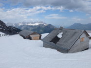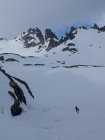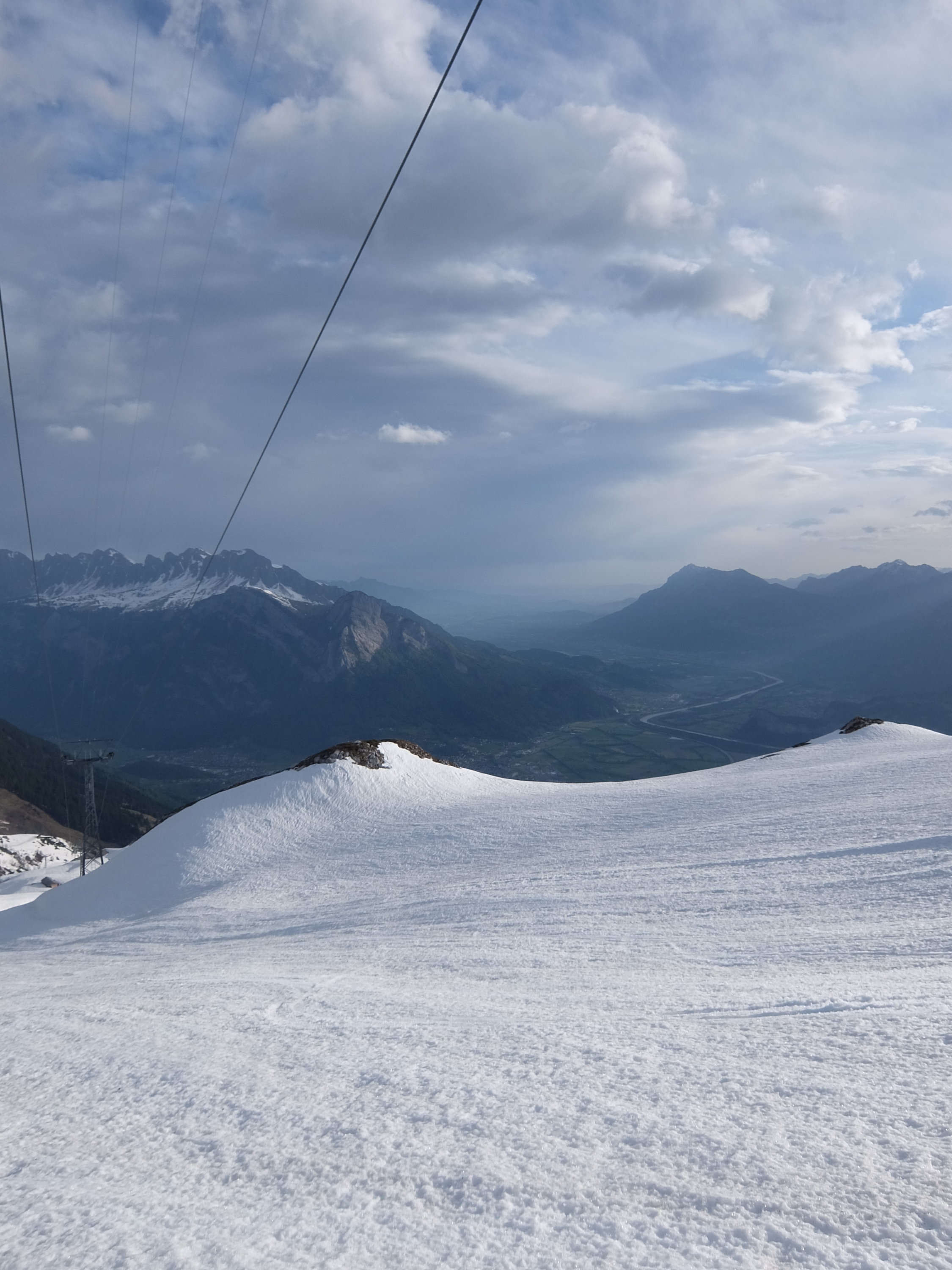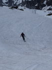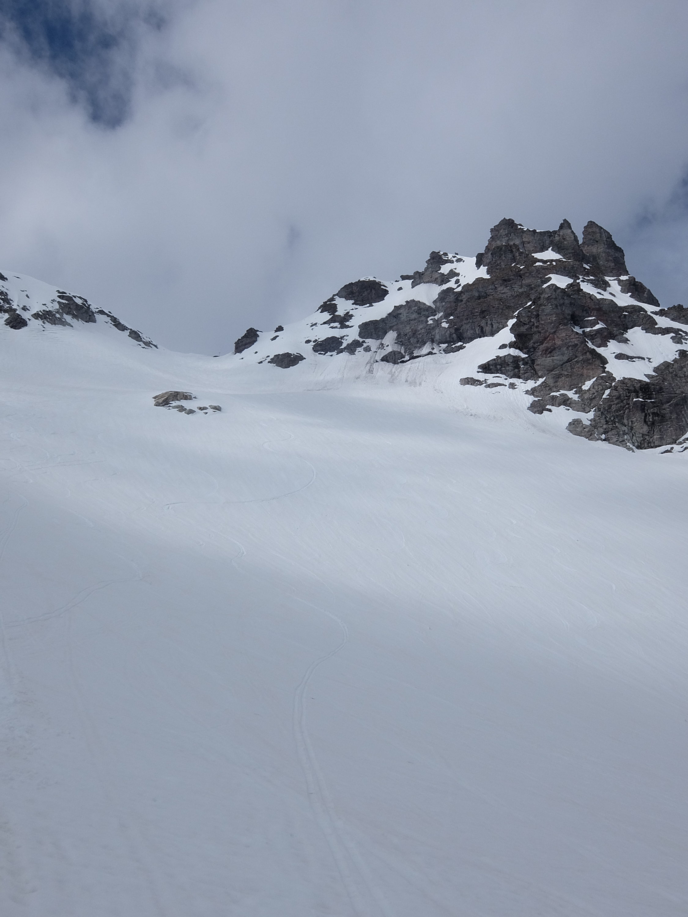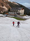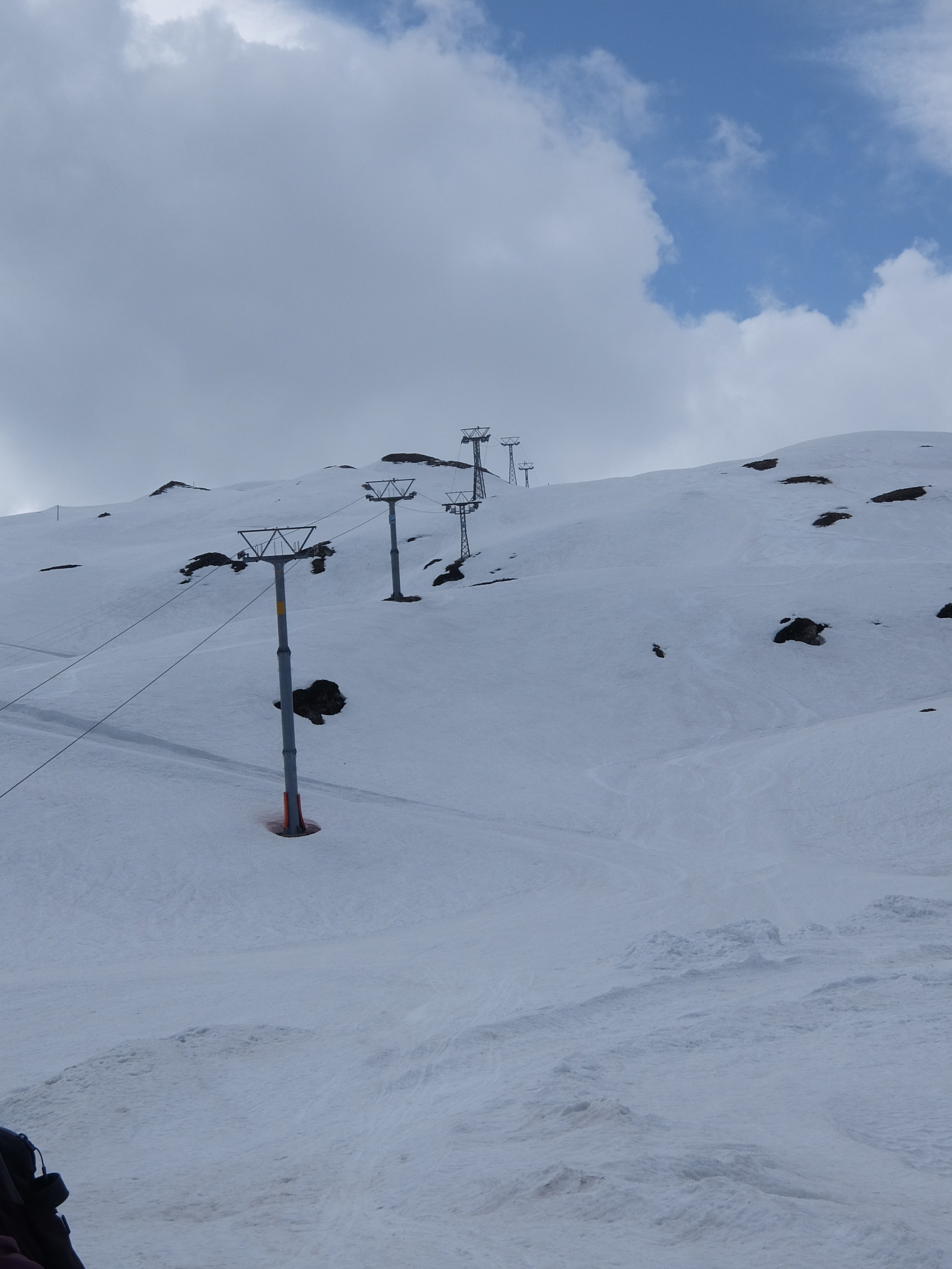 Der Föhnsturm brachte um 10 Uhr schon etwas Nebel mit so dass der Schnee in der Abfahrt gleich nass war, unten im flachen eher schon bremsend. Unterhalb der Wildseeluggen durch die Steilheit besser fahrbar. Am besten ging es auf der härteren Piste unterhalb von der Pizolhütte.