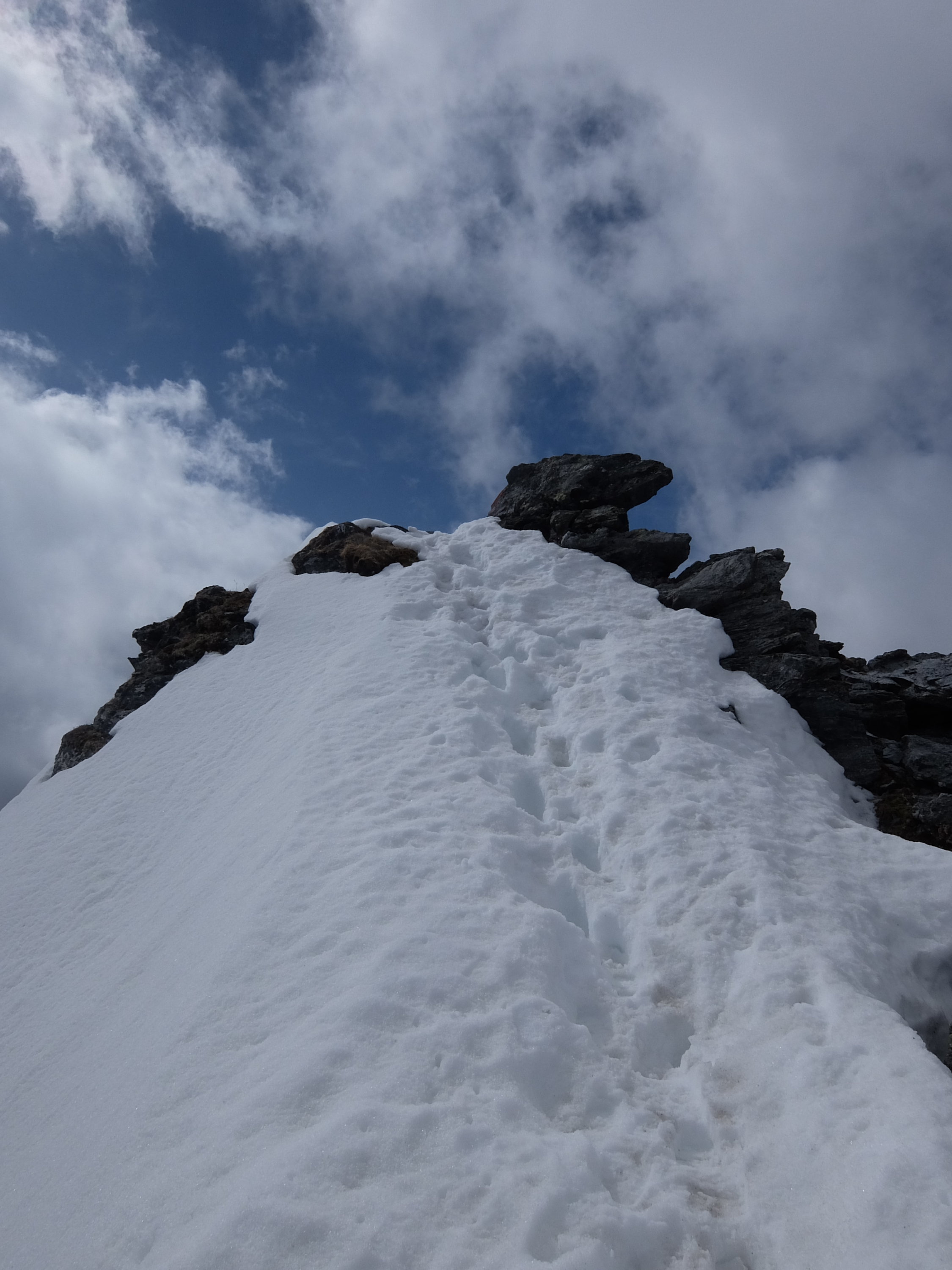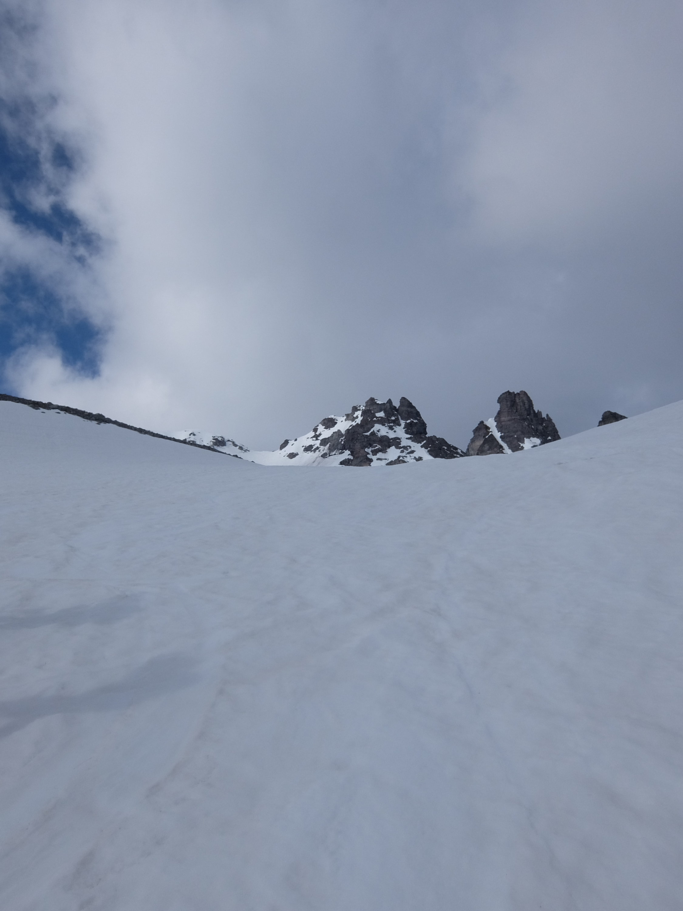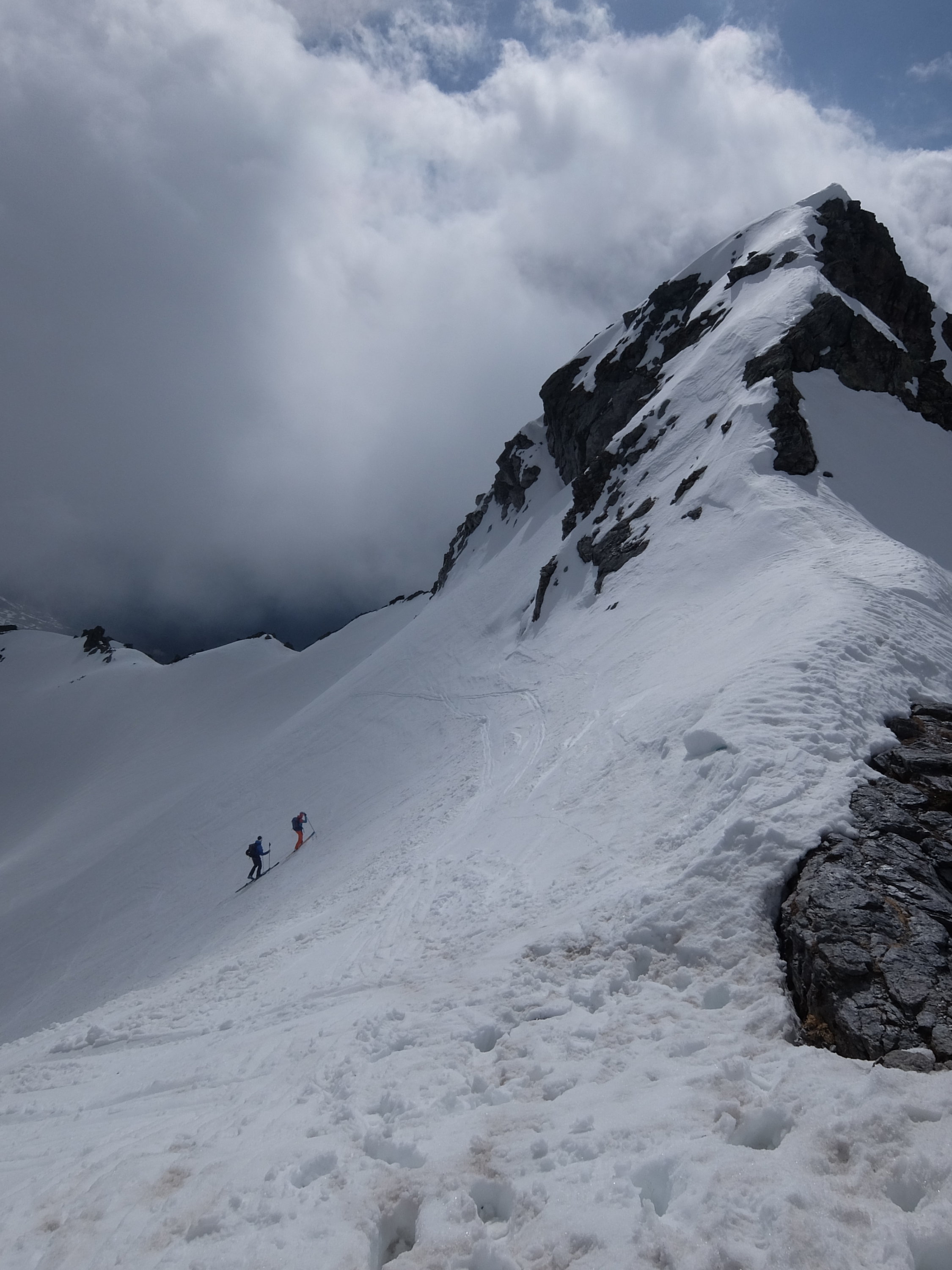 Ab Furt gleich mit Skis los. Die Pizolhütte ausgelassen, gleich rechts durch das Täli gequert. Wildseeluggen einige Meter aper, zu Fuß abgestiegen dann etwas mit Fellen abgerutscht. Auf schon weichem Schnee ohne Harscheisen zum Pizolsattel, zu Fuß auf meist trockenen Felsen zum Gipfel. Das Fixseil ist meist frei, nur in einer Rinne muss man auf Schnee queren. Ansonsten geht es auch direkt über den Grat (Spuren vorhanden, habe beides probiert).