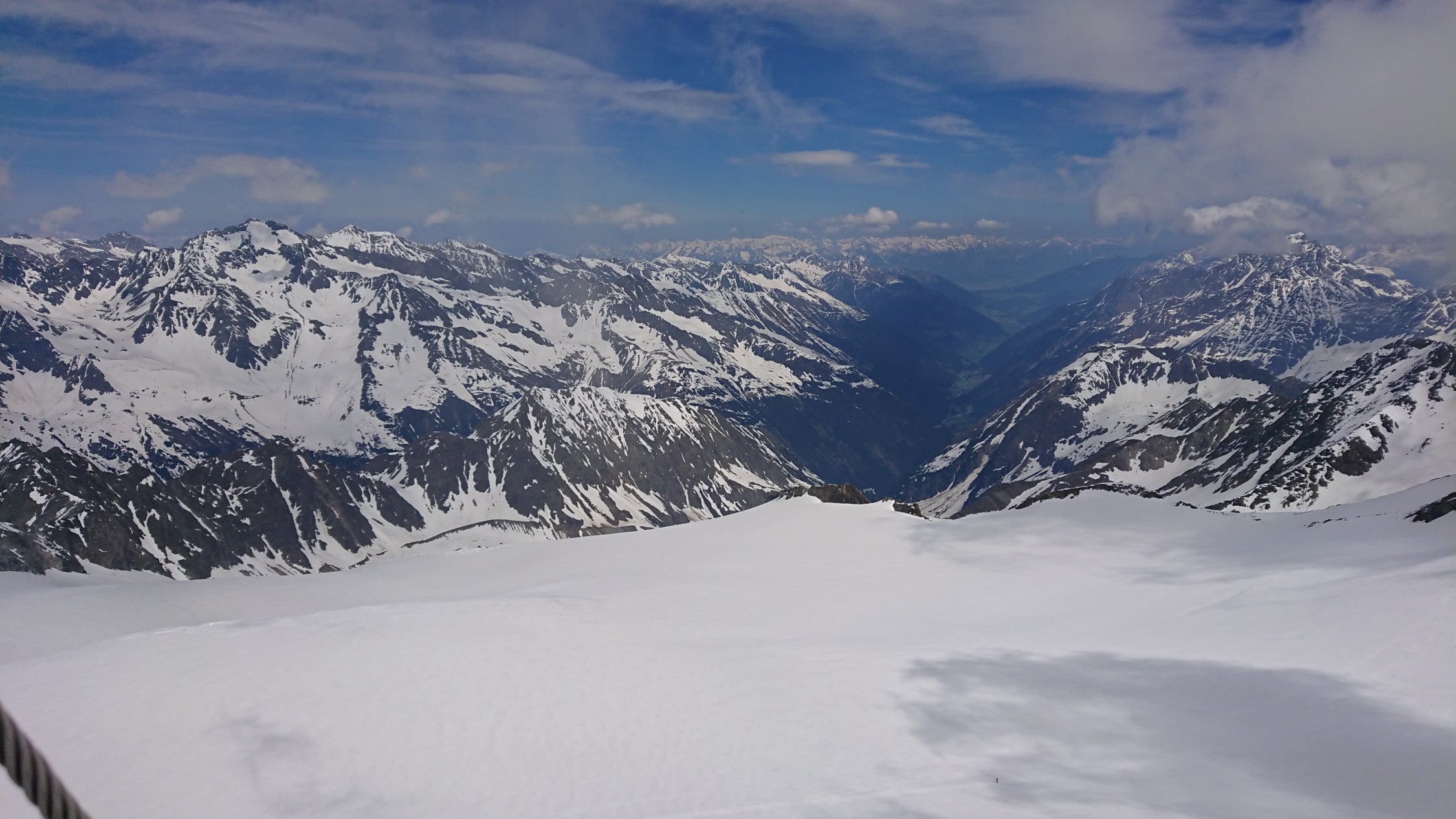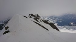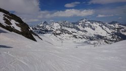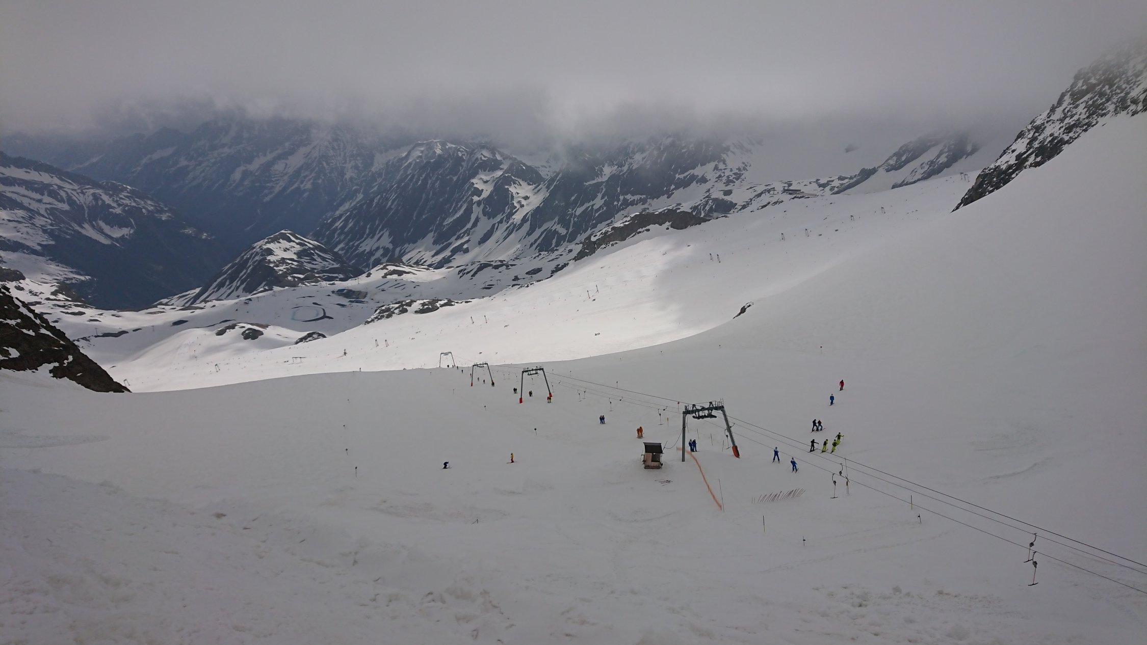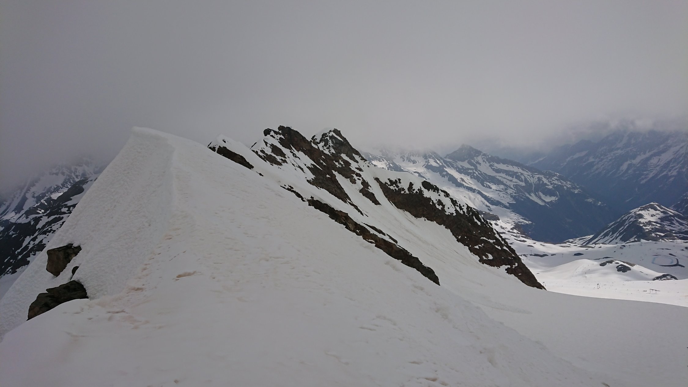 Von der Dresdner Hütte auf der Piste zum Eisjoch. Südseitige Abfahrt war schon sulzig. Auf dem Gletscher hat es dann zugezogen. Ab der Hochfläche unter dem Zuckerhütl wieder gute Sicht. Problemloser Aufstieg mit Steigeisen. Immer wieder stärkerer Wind. Kurze Abfahrt, dann noch den Wilden Pfaff dran gehängt.
