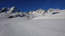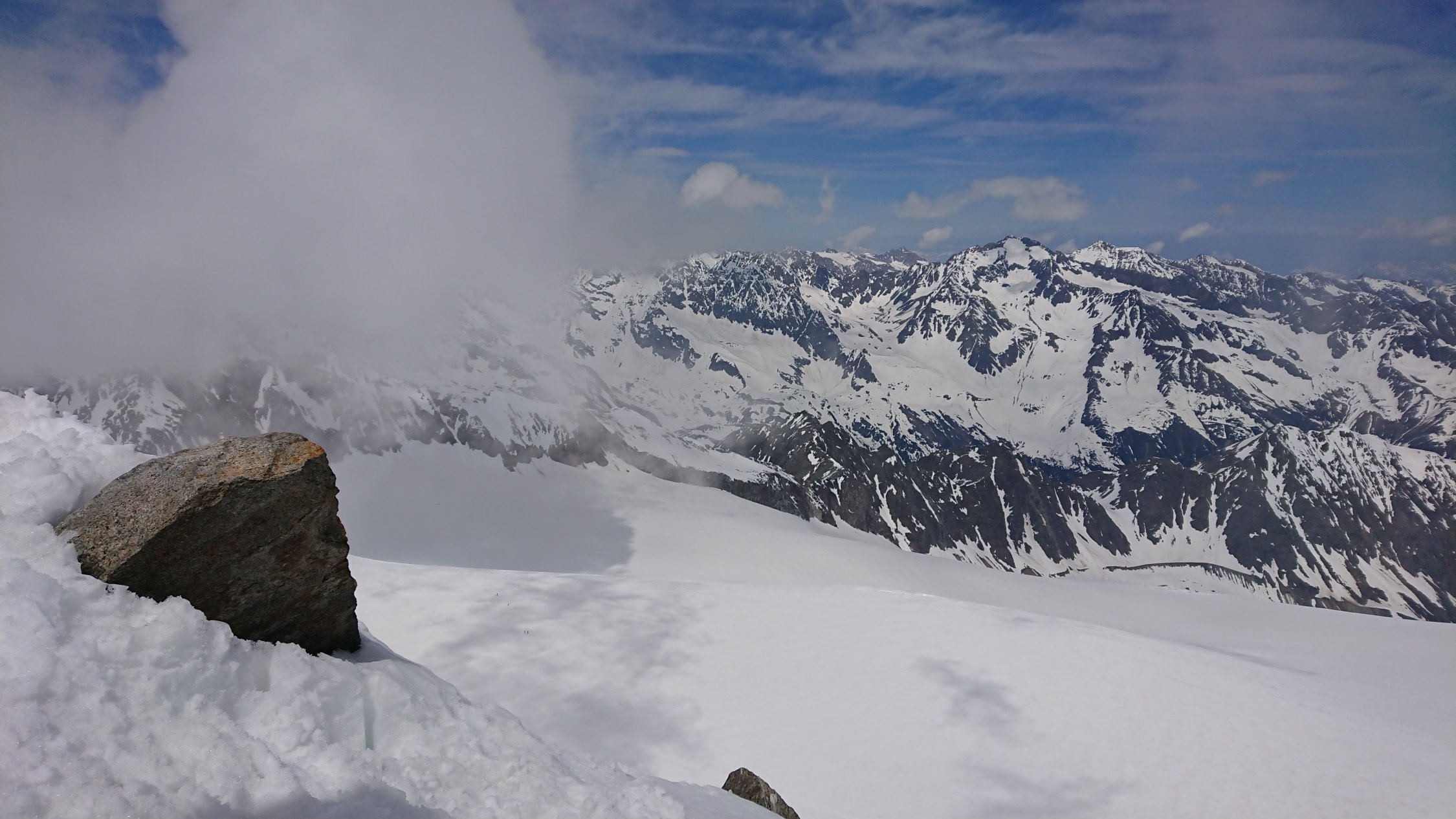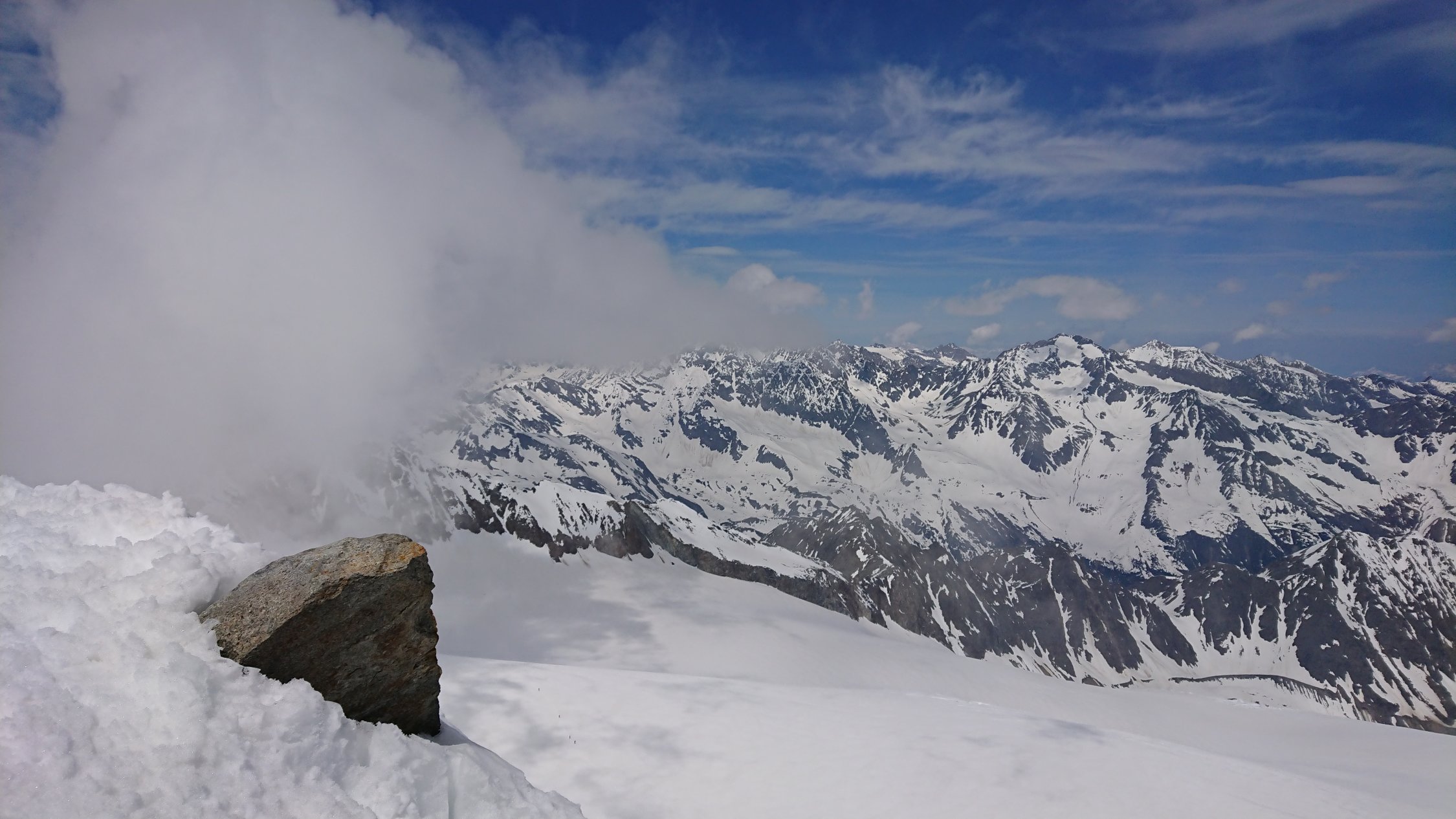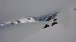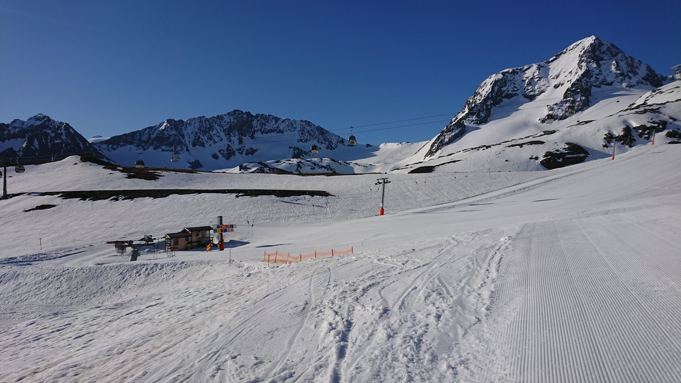 Von der Dresdner Hütte auf der Piste zum Eisjoch. Südseitige Abfahrt war schon sulzig. Auf dem Gletscher hat es dann zugezogen. Ab der Hochfläche unter dem Zuckerhütl wieder gute Sicht. Problemloser Aufstieg mit Steigeisen. Immer wieder stärkerer Wind. Kurze Abfahrt, dann noch den Wilden Pfaff dran gehängt.