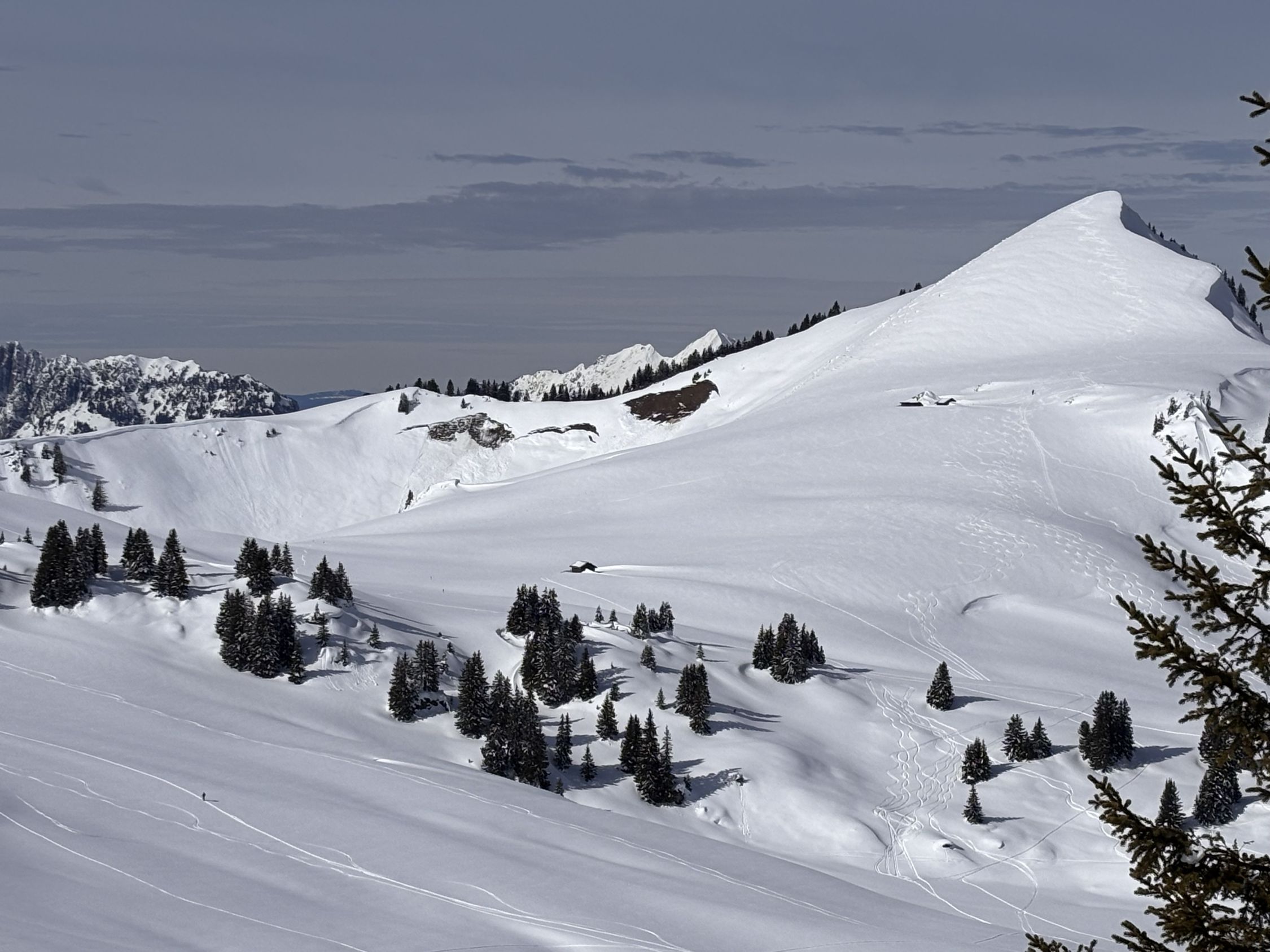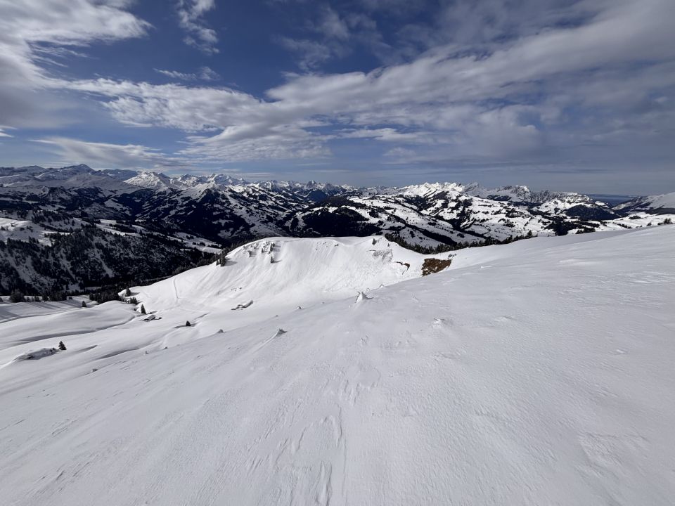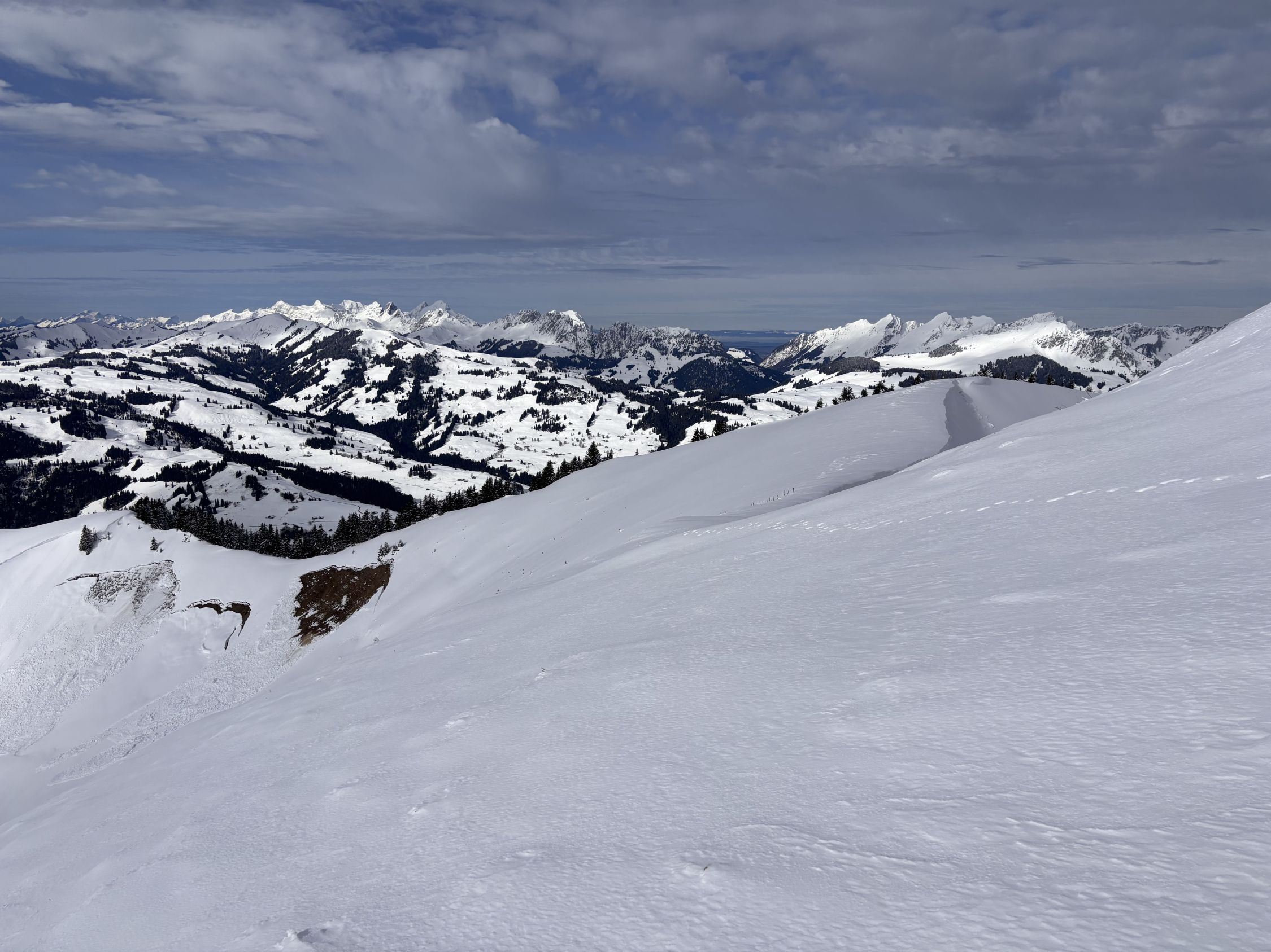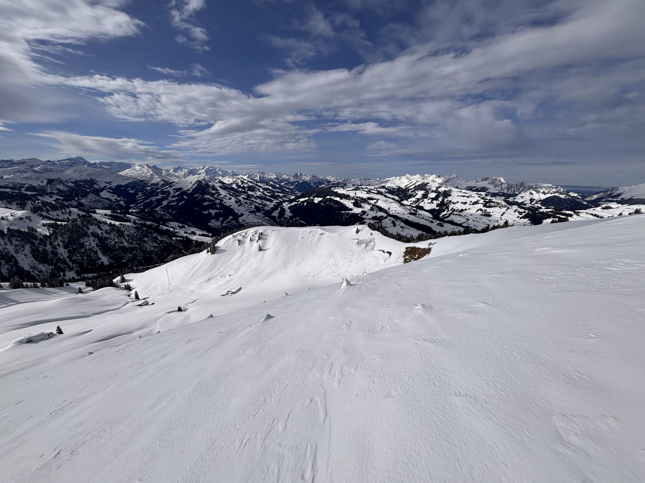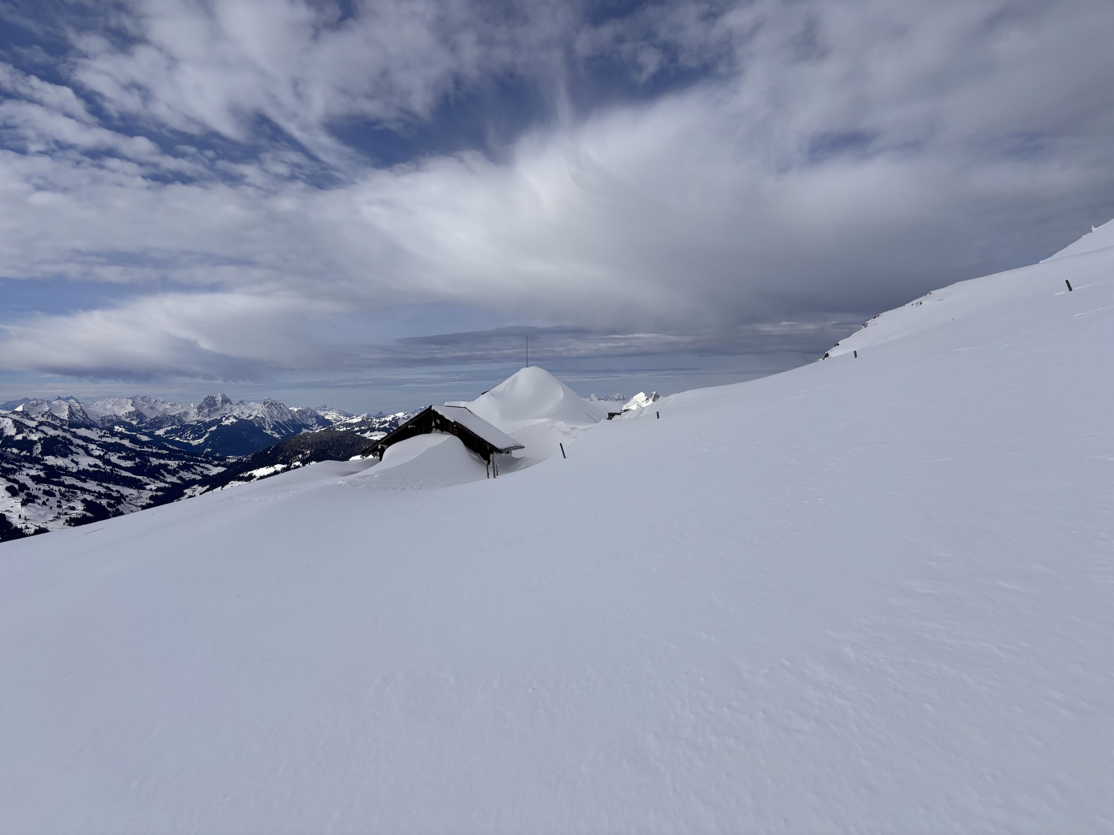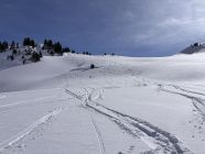 Das Gebiet ist deutlich besser eingeschneit als noch vor zwei Wochen. Allerdings sind die Schneeverwehungen überall sichtbar. Der Wind war heute immer noch am Werk: Unsere Aufstiegsspuren waren bei der Abfahrt teilweise vom heutigen Westwind fast schon wieder gefüllt mit Triebschnee... Unterhalb von ca. 1'600m wurde der Schnee bereits am Mittag schwer und nass. Wir gingen anschliessend noch auf den Puur, wo es noch Pulver gab.