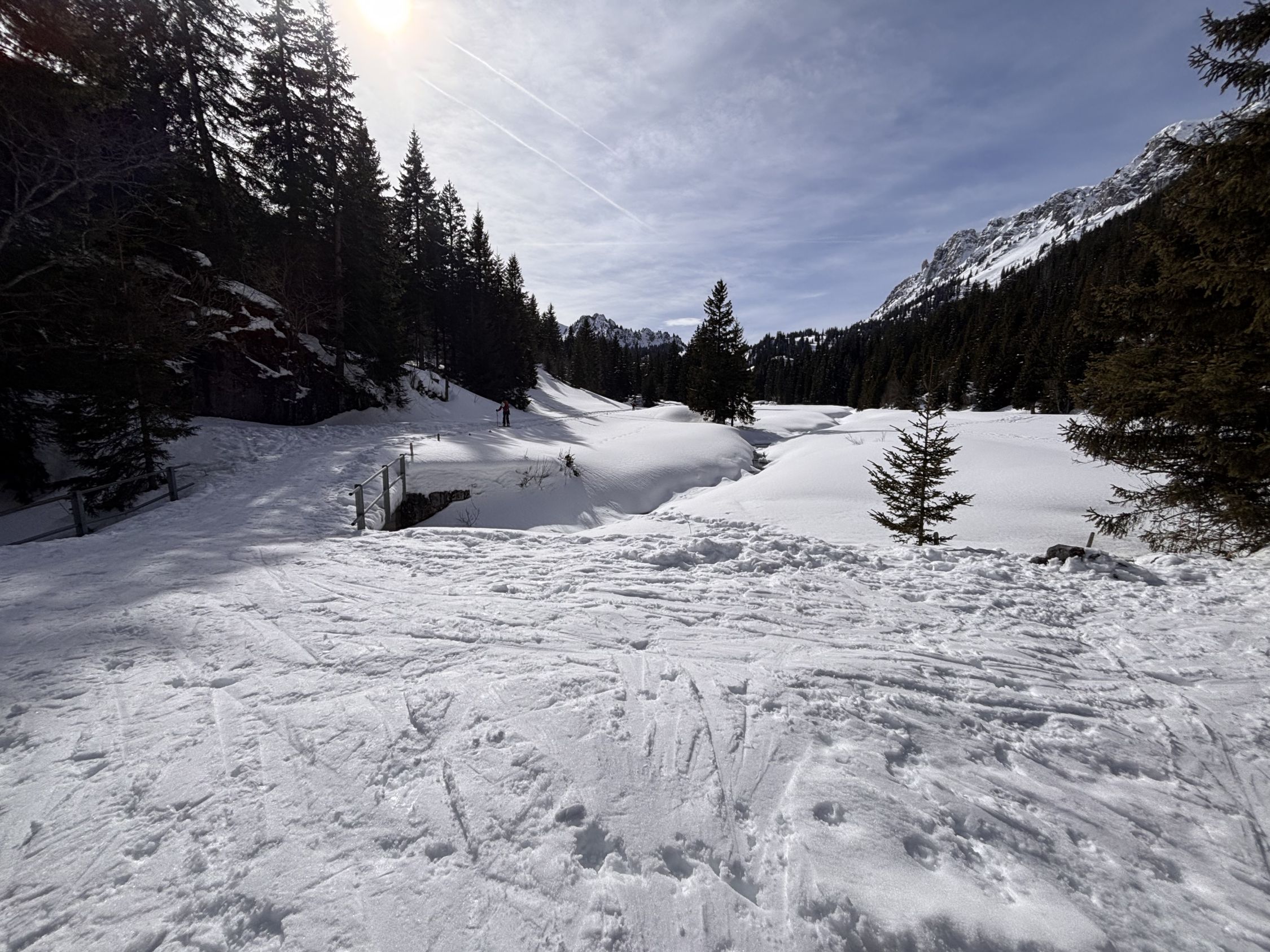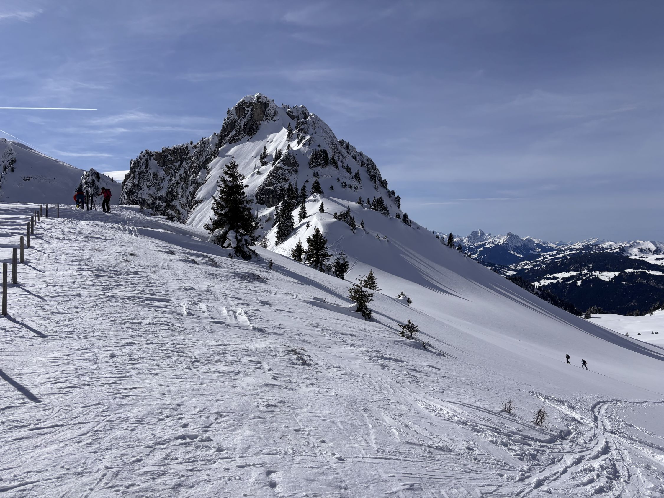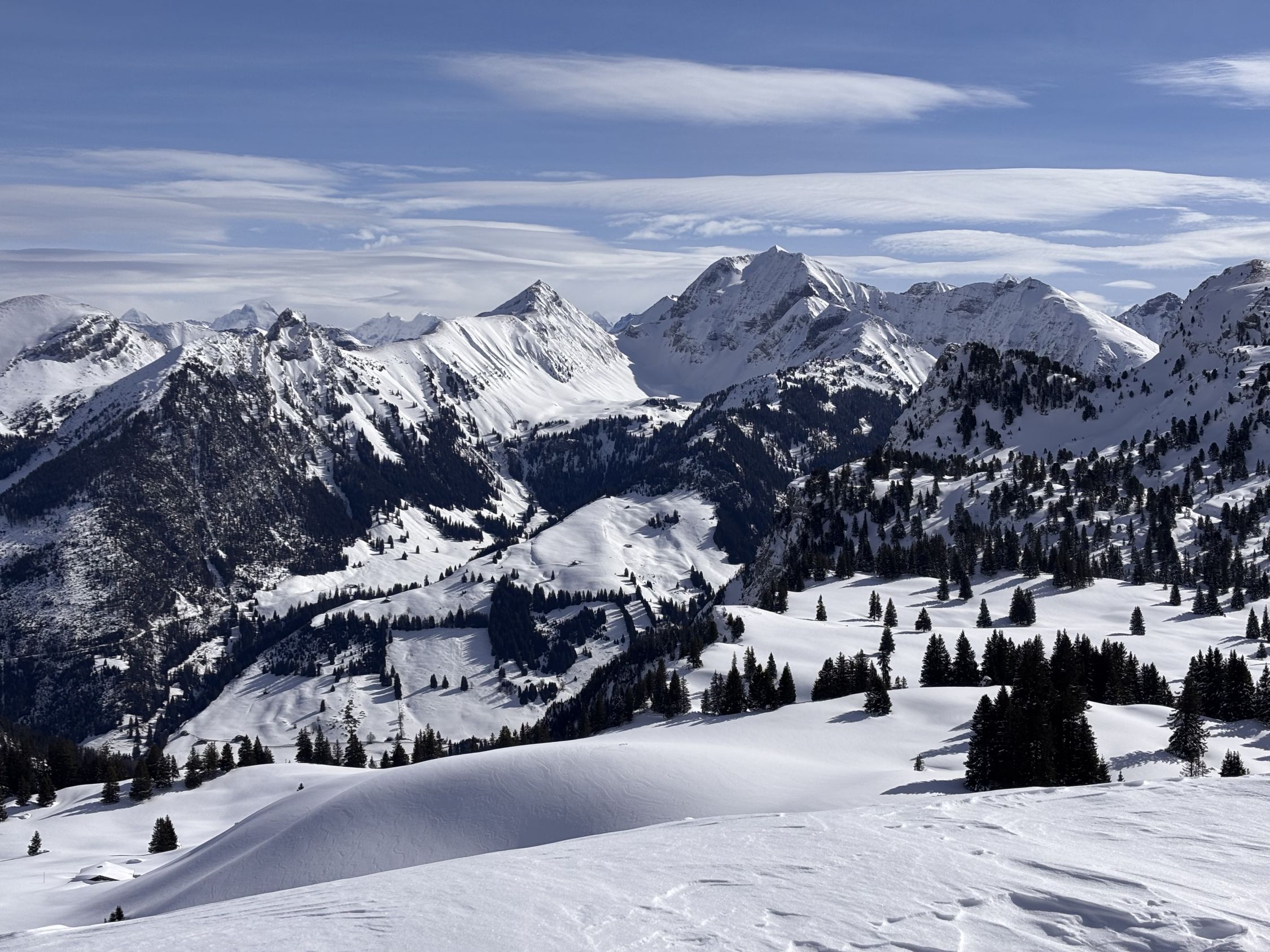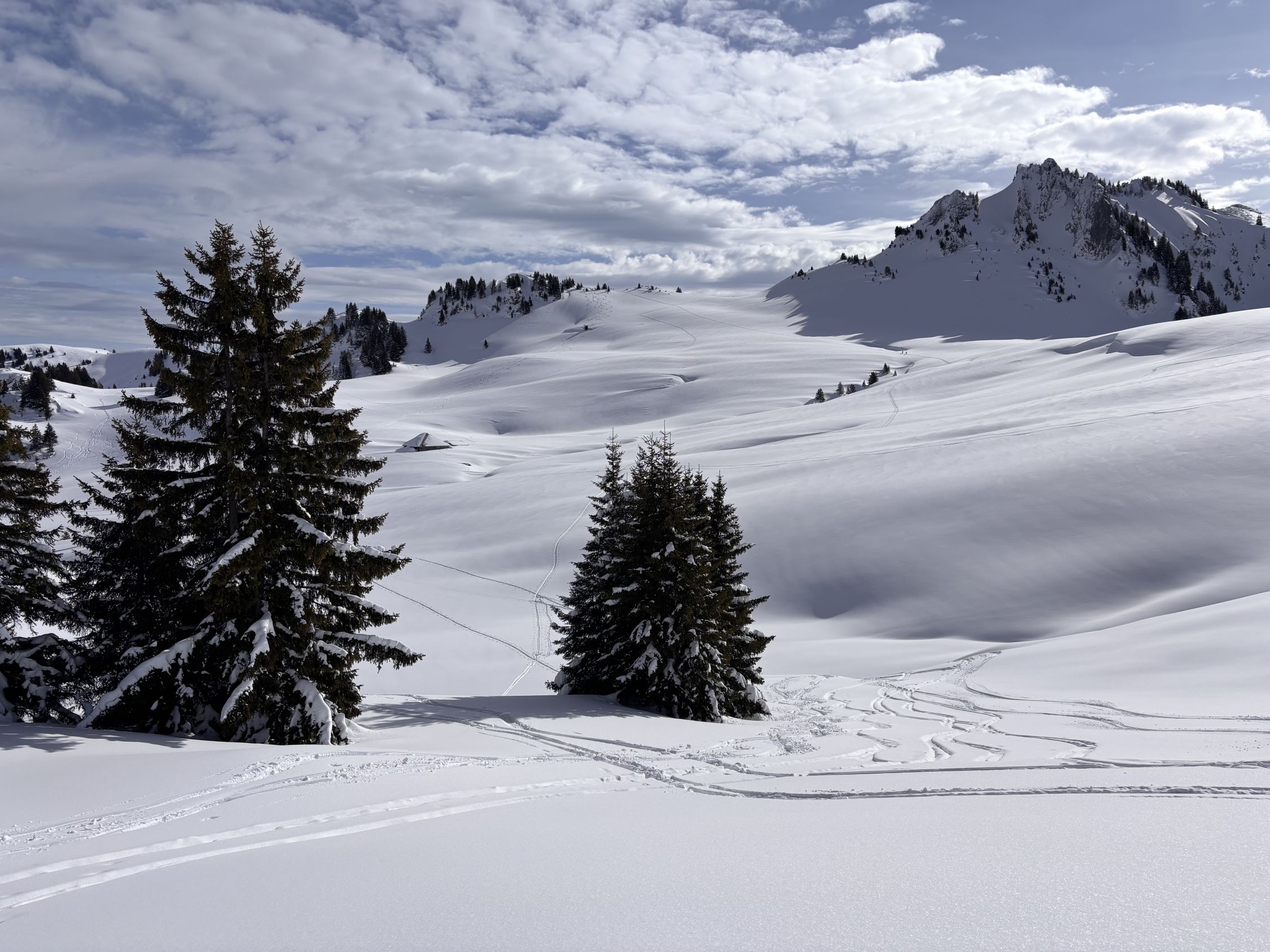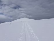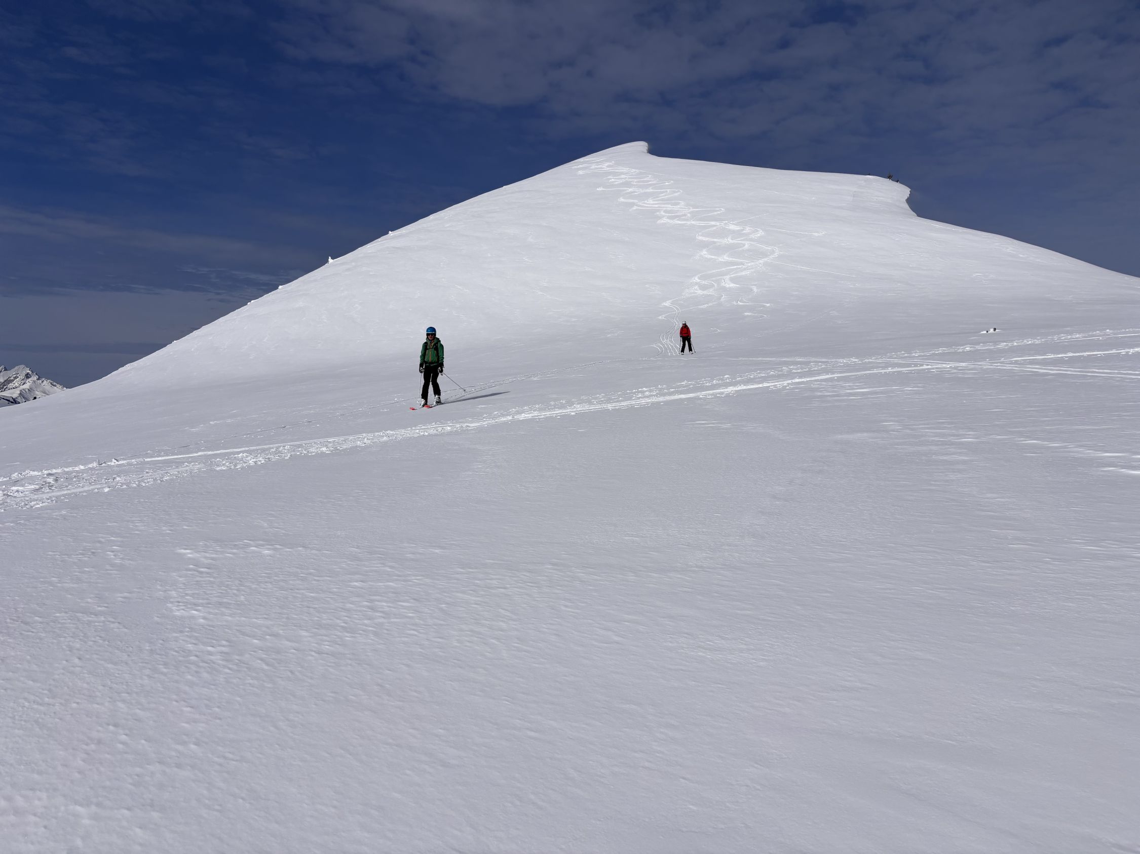 Das Gebiet ist deutlich besser eingeschneit als noch vor zwei Wochen. Allerdings sind die Schneeverwehungen überall sichtbar. Der Wind war heute immer noch am Werk: Unsere Aufstiegsspuren waren bei der Abfahrt teilweise vom heutigen Westwind fast schon wieder gefüllt mit Triebschnee... Unterhalb von ca. 1'600m wurde der Schnee bereits am Mittag schwer und nass. Wir gingen anschliessend noch auf den Puur, wo es noch Pulver gab.