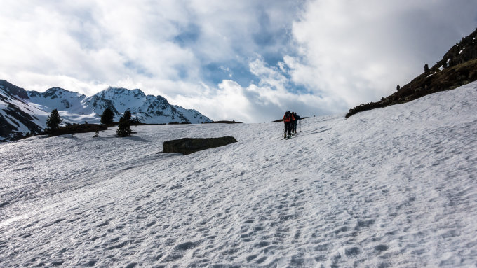 Start um 8.30 Uhr bei +2°, sonnig mit Wolkenfelder. Schneedecke hart gefroren. Wir hatten eigentlich das Radüner Rothorn geplant, dort war aber am Morgen alles wolkenverhangen. Also spontane Planänderung. Einfacher Aufstieg zum Skidepot, von dort kurzer Fussmarsch und einfache Blockkletterei auf den Hauptgipfel. Erste Abfahrt um 11 Uhr, nochmals Aufstieg und zweite Abfahrt um 12 Uhr. Perfekte Sulzverhältnisse bis hinunter zum Parkplatz.