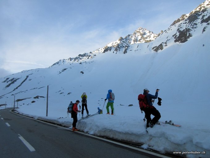 Start um 7 Uhr auf der Passhöhe bei +5°C. Nebel lag auf der Südseite des Passes. Da war der Schnee nicht überall gefroren, ab der Mitte dann schon. Es hat durchgehend Schnee. Die Steilstufe hat harten Schnee drin, anspruchsvoll, Harscheisen empfehlenswert.