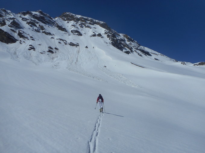 Wetter: Gutes Tourenwetter, aber für die Jahreszeit viel zu warm. Nicht jammern, wir müssen das akzeptieren, und der Mensch muss lernen, das die Natur ihm den Weg aufzeigt. Es war föhnig, und die Schneedecke hat`s bis zum Frühstücksplatz nicht gefroren. Auf dem Wildstrubel Gipfel windstill und mild.