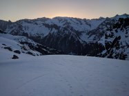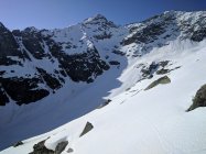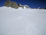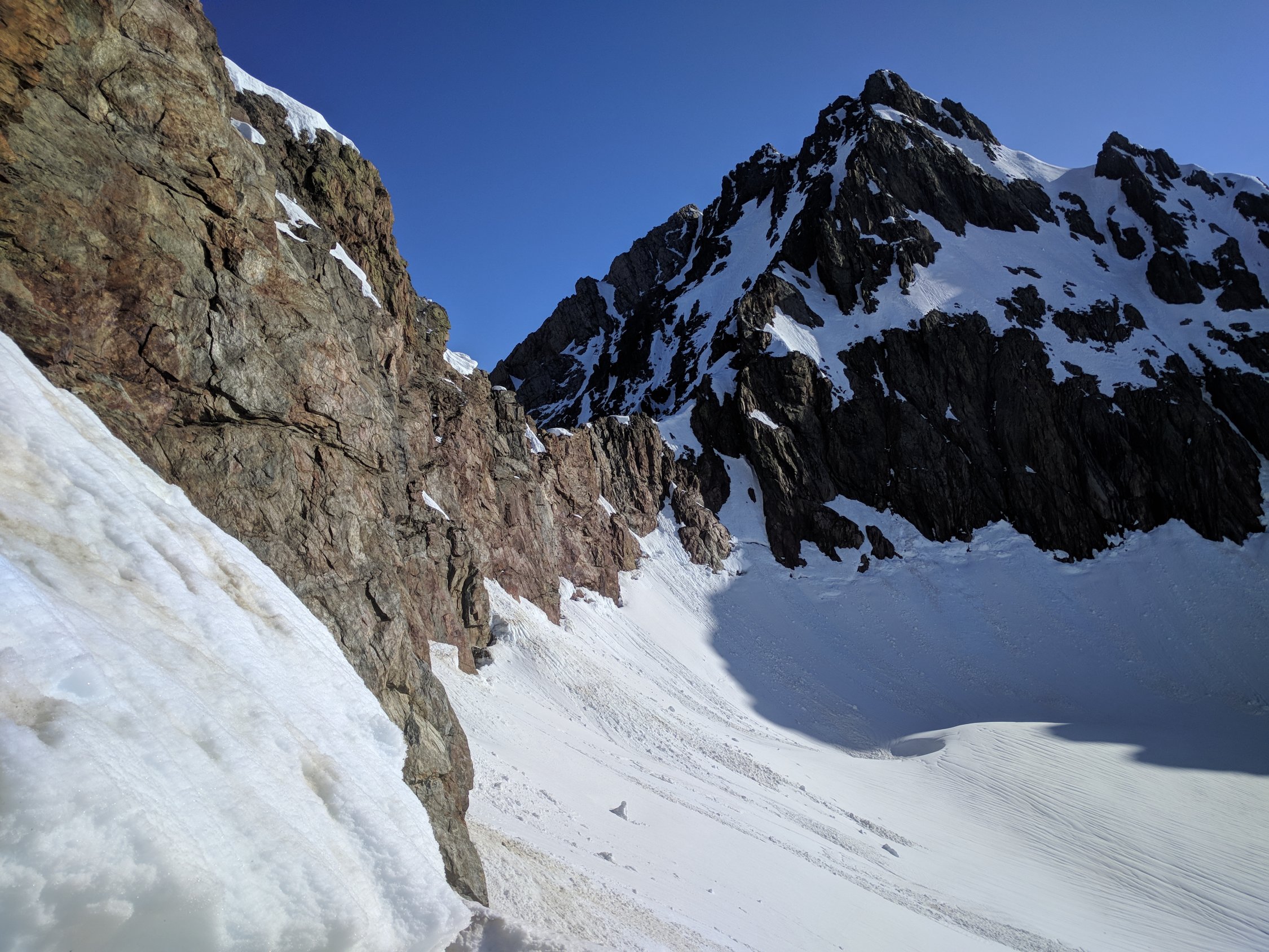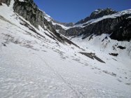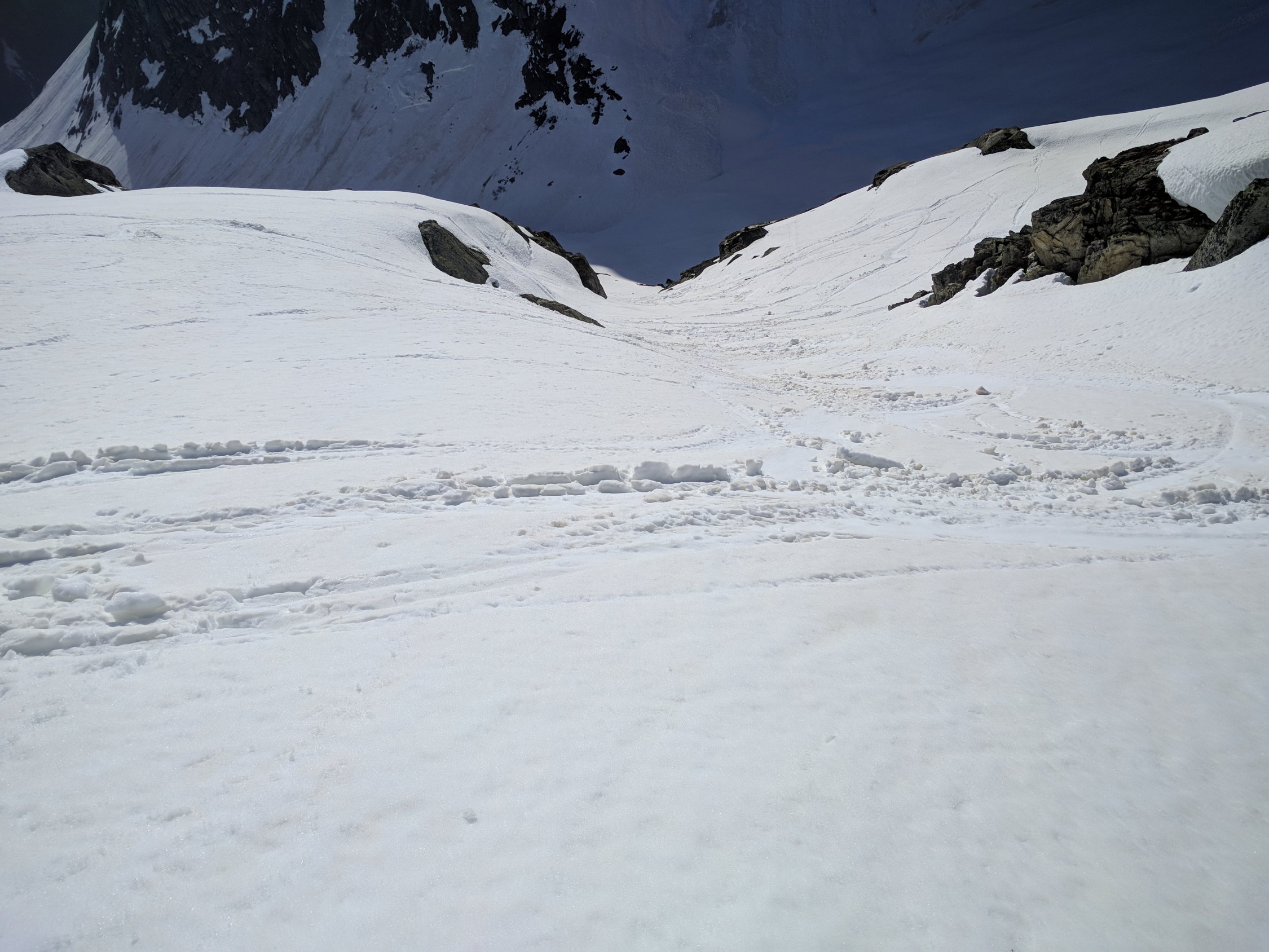 Aufstieg bis 2940, nachdem ich unterhalb des Gipfelcoulis dreimal hüfttief eingebrochen bin (es bildet sich langsam ein Bergschrund) habe ich dann auf den Gipfel verzichtet.