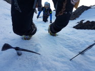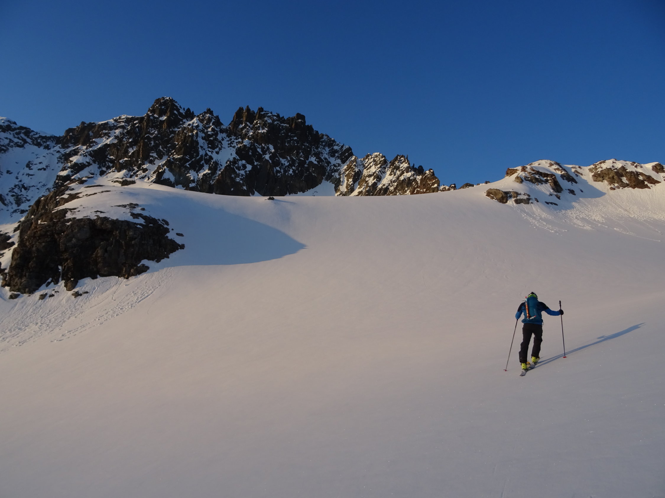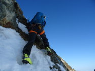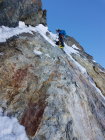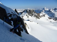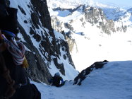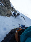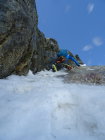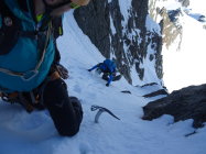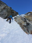 rechtes Couloir Trittschnee, teils etwas faul aber das wühlen hält sich in Grenzen. Das 50m Seil reichte heute nicht bis an den Bergschrund, wesshalb wir nochmals eine Schlinge platzieren mussten.
