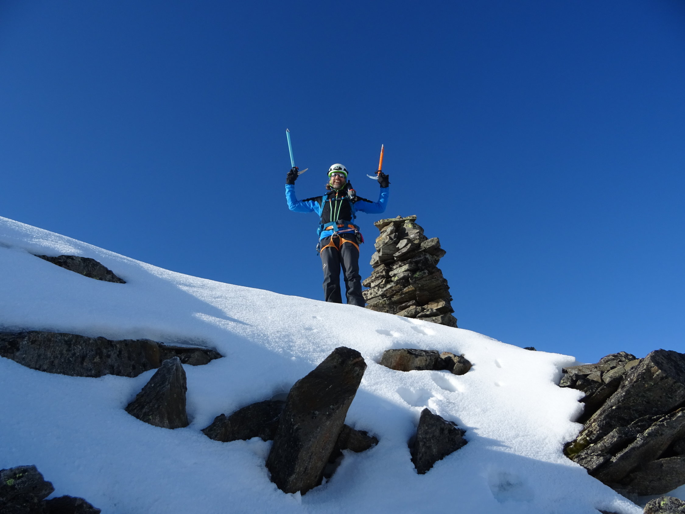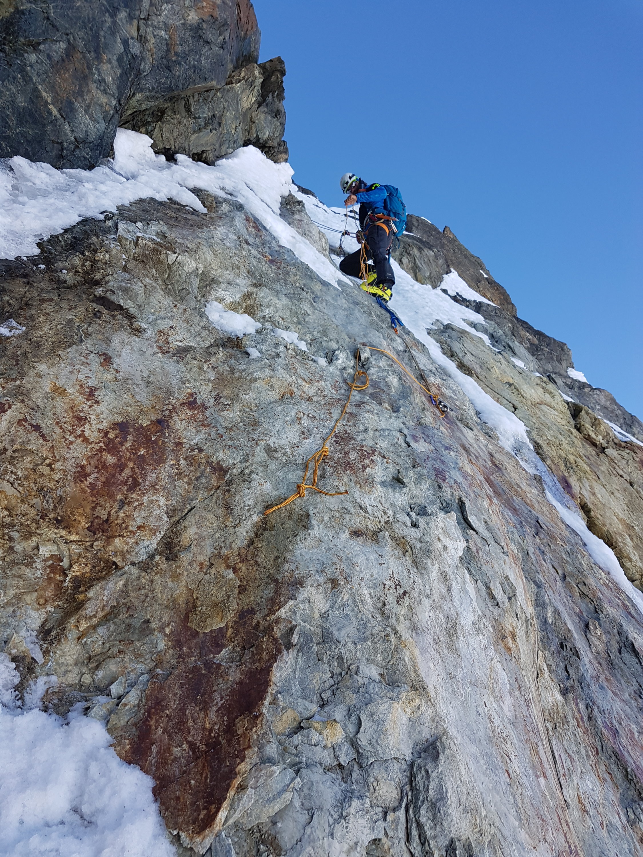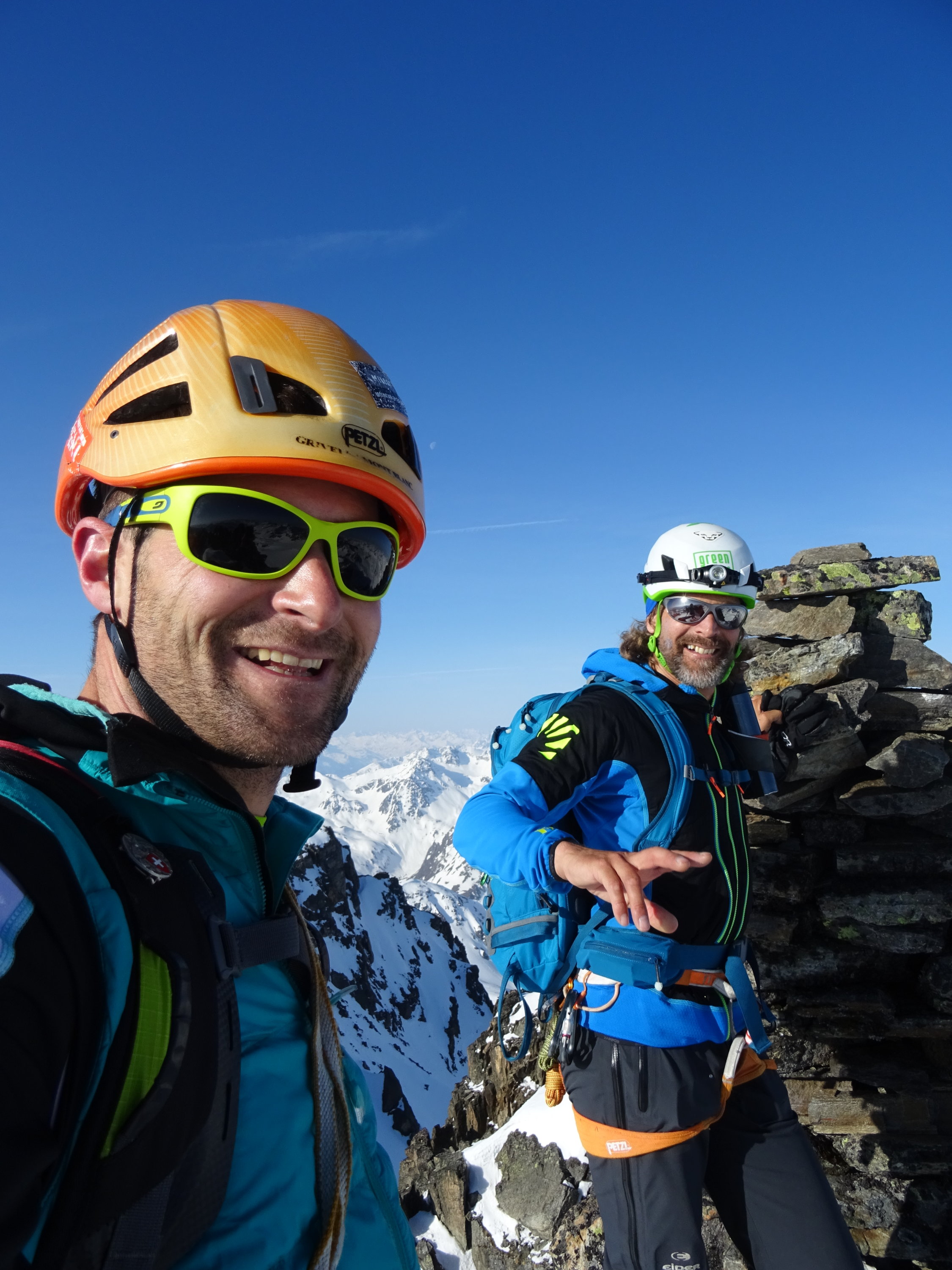 Start 4.15 Dürrboden - Gipfel 8.15. Ziemlich optimal bei diesen Temperaturen. (20min Route auswählen inkl.) Das zu kurze Seil hat uns leider nochmals 15min gekostet. Abfahrt Scaletta-Nord 10.40Uhr, was eigentlich ok war.