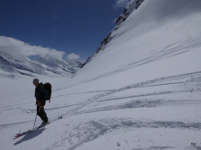 Ab Jungfraujoch bis Mönchsjoch und weiter bis zum Anfellpunkt auf dem Ewigschneefäld bei ca. 3400m guter, fast pulvriger Schnee. Im Aufstieg bis zum Skidepot auf 3720m leicht sulziger Schnee. Abfahrt über die Südhänge (rechter Hand des grossen Felsriegels 3200m-3400m in der Mitte), entgegen den Verhältnissen des Aufstieges, sehr weich und schwer. Es wurden einige kleine Nassschneerutsche von der Vorgängergruppe ausgelöst.