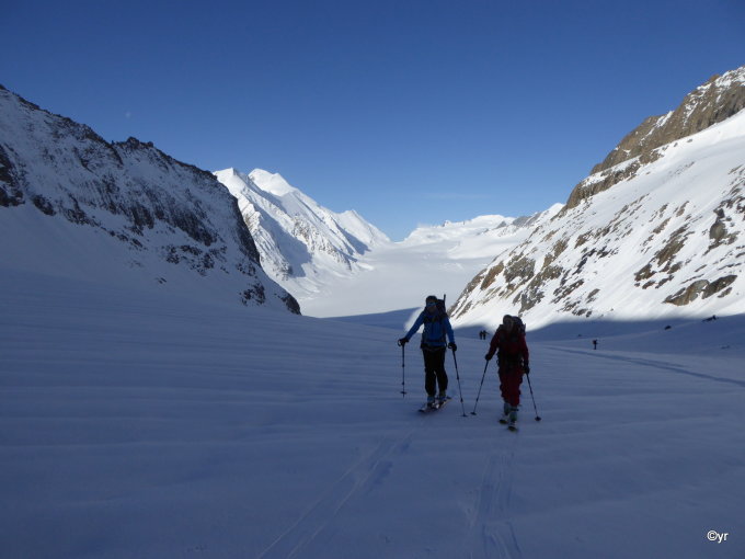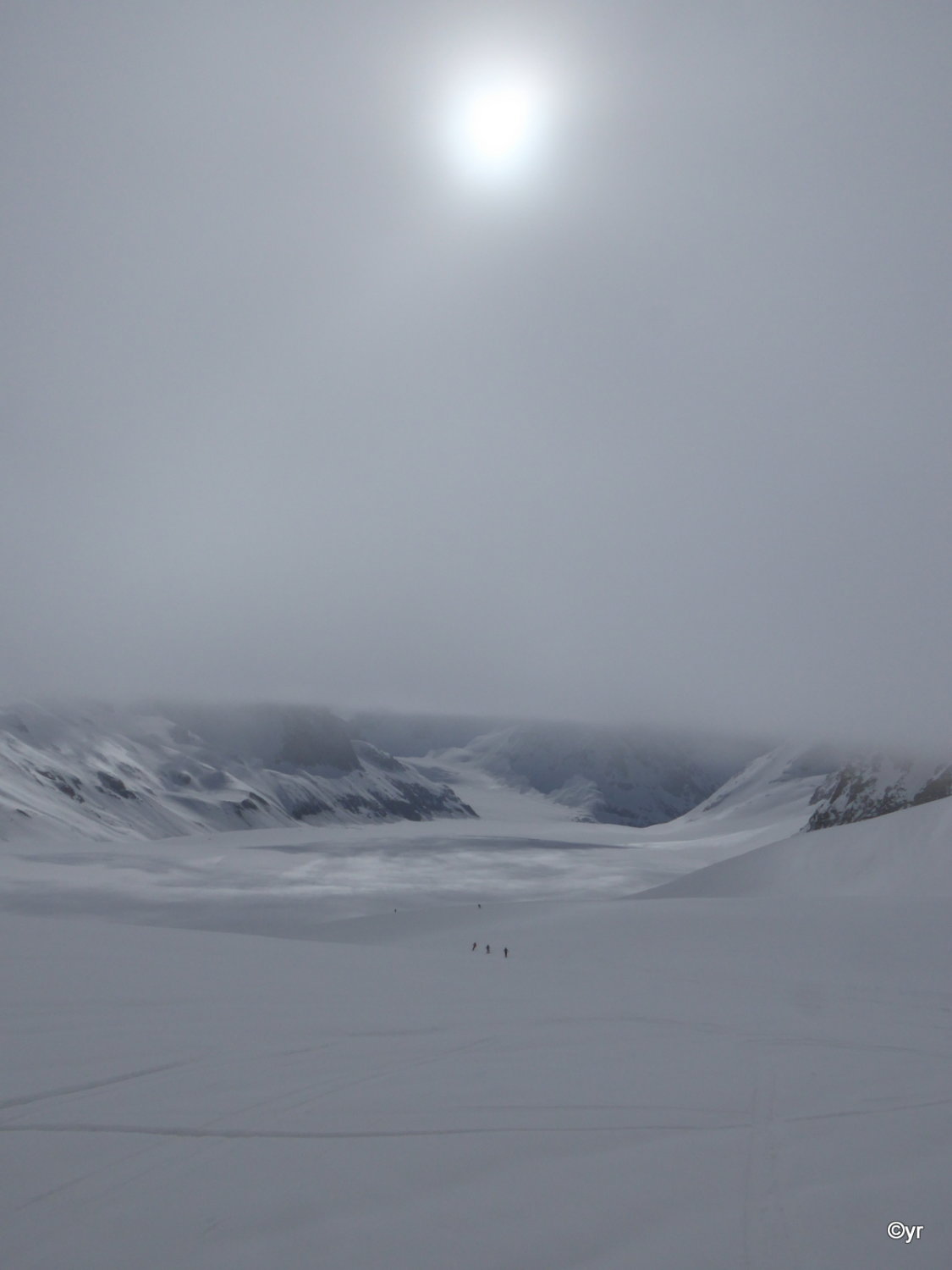 Von der Konkordiahütte über die Grünhornlücke her kommend. Top Verhältnissen! Aufstieg bis Grünhornlücke hart, Abfahrt bis zum Anfellplatz in einem seidenfeinen Sülzchen! Aufstieg bis auf den Gipfel in leichtem Sulz. Abfahrt wie Aufstieg. Querung zur Finsteraarhornhütte in etwas nasserem Sulz.