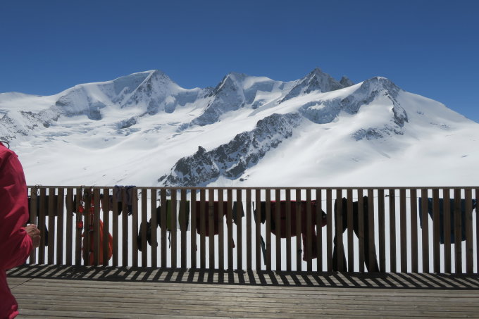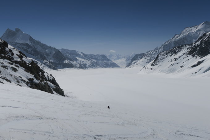 Abfahrt Gipfelhang noch hart. Nun auffellen Grünhornlücke retour über Kondkordiplatz und Lötschenlücke - Abfahrt zur Fafleralp - von hier mit Bus und Zug retour nach Grindelwald
