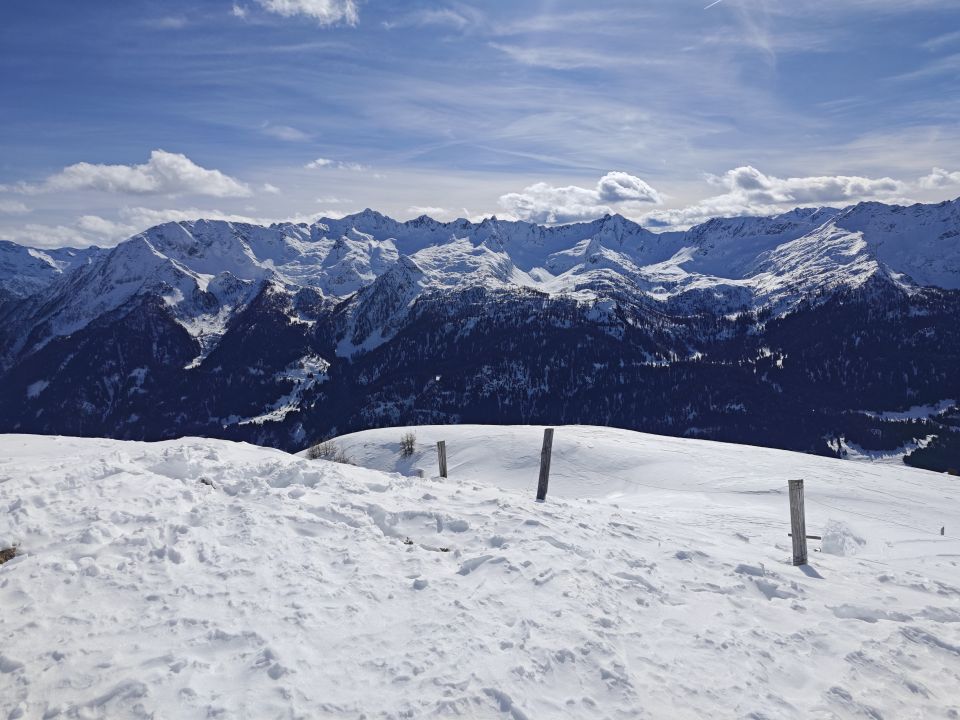 Das Lawinenbulletin für heute lautete für viele Regionen „zwischen Skylla und Charybdis“: oberhalb von 1800 m trockene Lawinen, unterhalb von 2000 m Gleitschneelawinen. Für den Start der Tour muss man zuerst nach Madrano laufen und sich von dort aus im steilen Wald auf die Suche nach Schnee begeben. Dabei ist es nötig, die Ski ab und zu auszuziehen. Auf einer Höhe von 1600 m befinden sich ein paar Häuser; ab dort herrscht kein Schneemangel mehr, aber der Schnee ist bis etwa 2000 m ziemlich nass.
