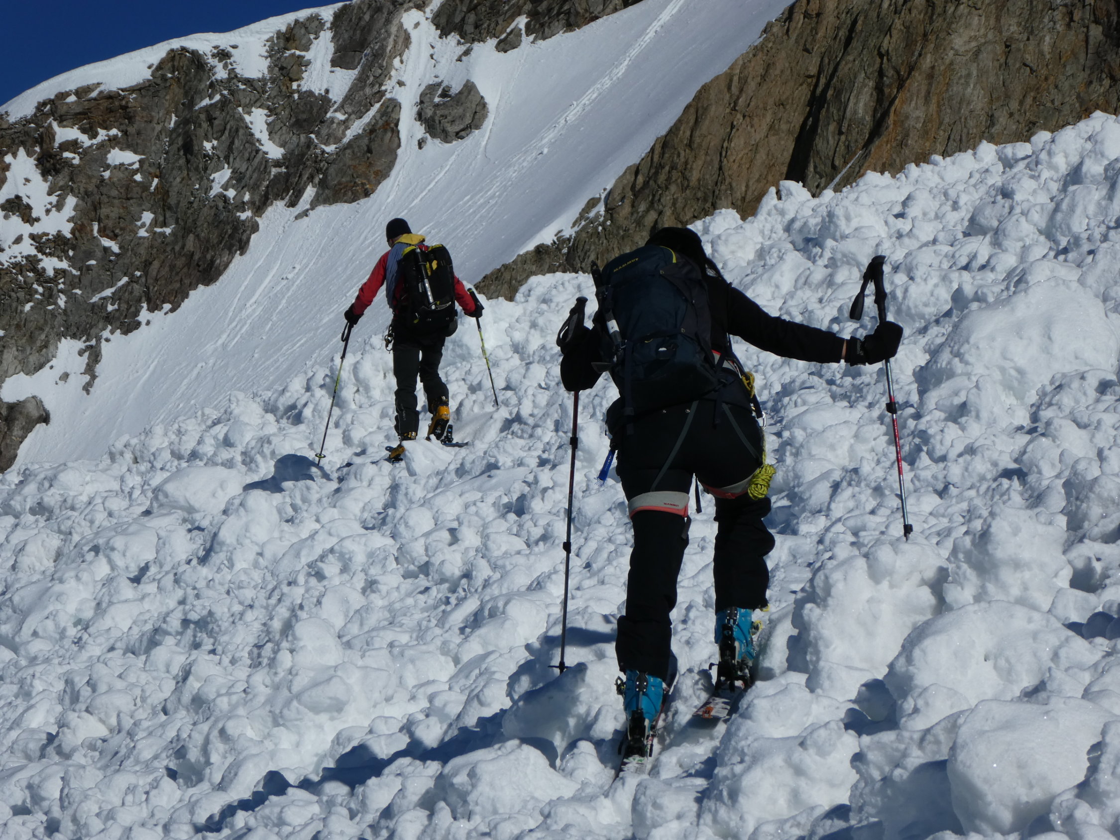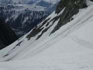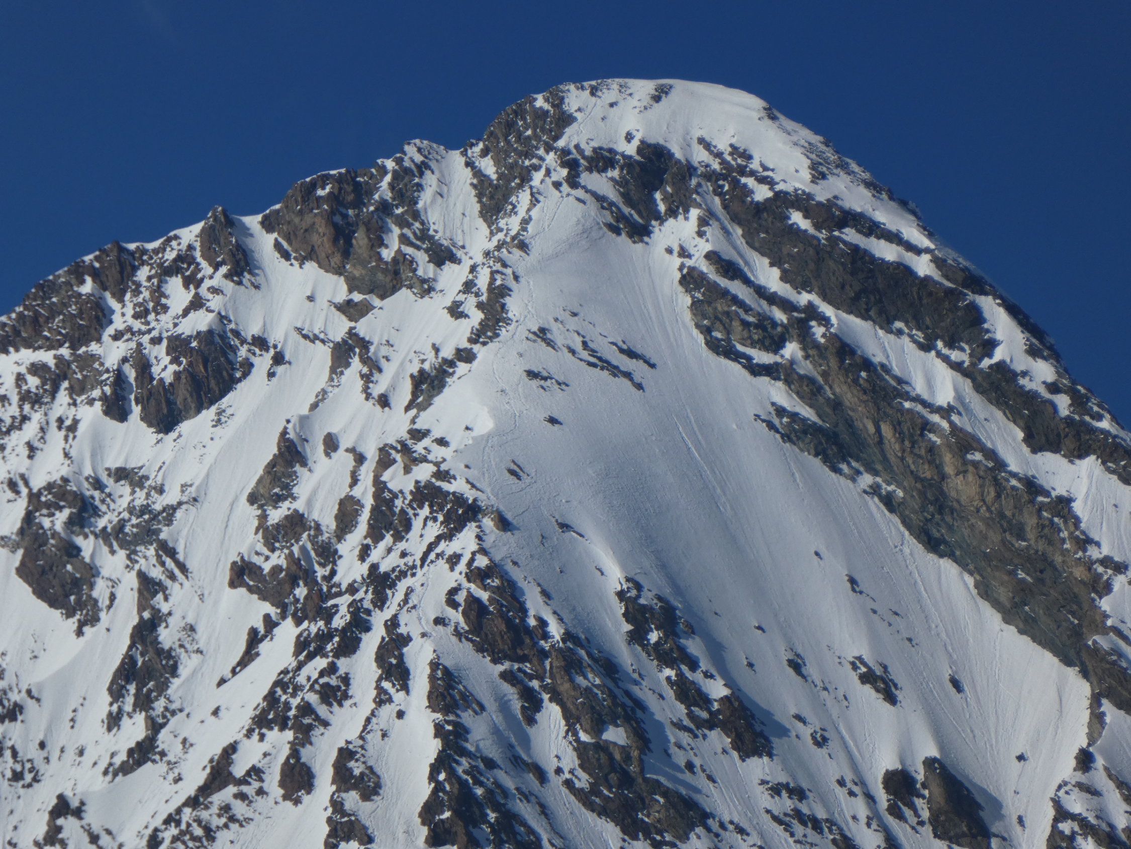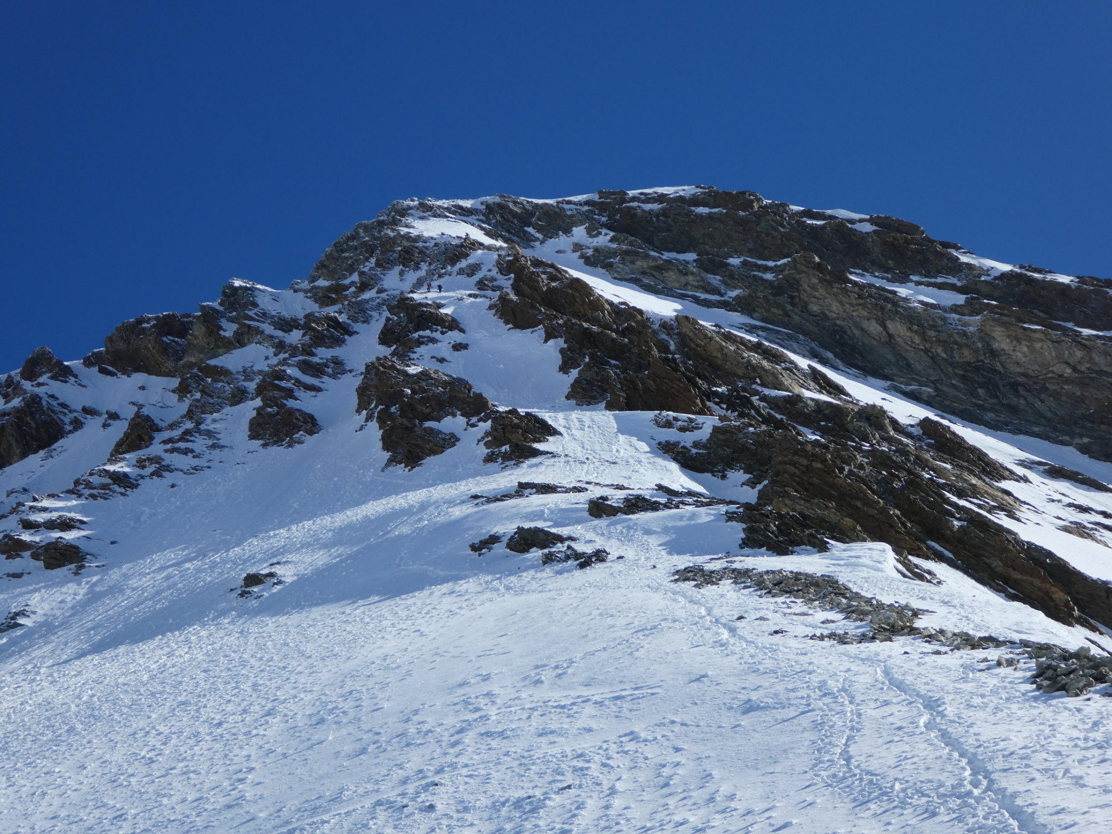 Auf 3600m (über dem Gletscherbruch) haben wir die Skis aufgebunden und sind für ca. 200 m zu Fuss aufgestiegen. Bei der Querung zur Südwestrippe muss viel Lawienenschnee gequert werden. Skidepot auf ca. 3700m. Von hier ist der weitere Verlauf zum Gipfel gut einsehbar. Die letzten 500 m sind streng. Schnee mit leichtem Deckel. Immer wieder durchgebrochen aber gut zu gehen. Der Grat ist gut mit Stangen gesichert.