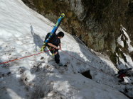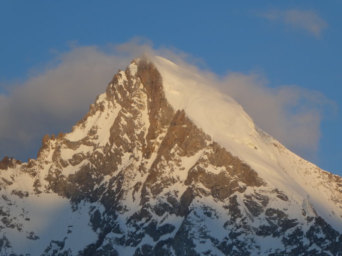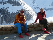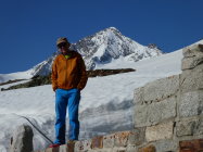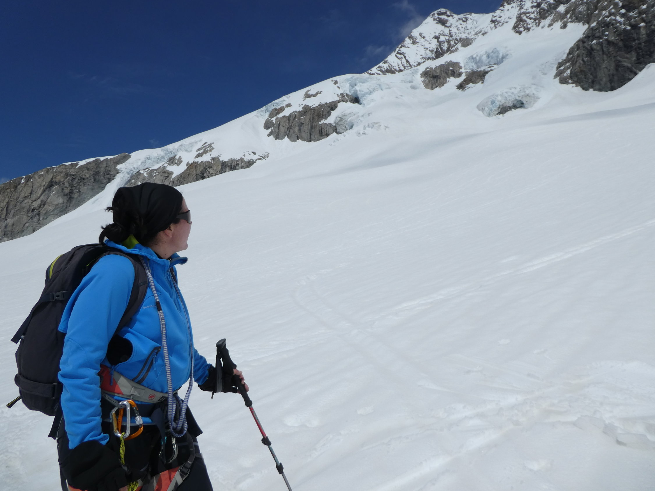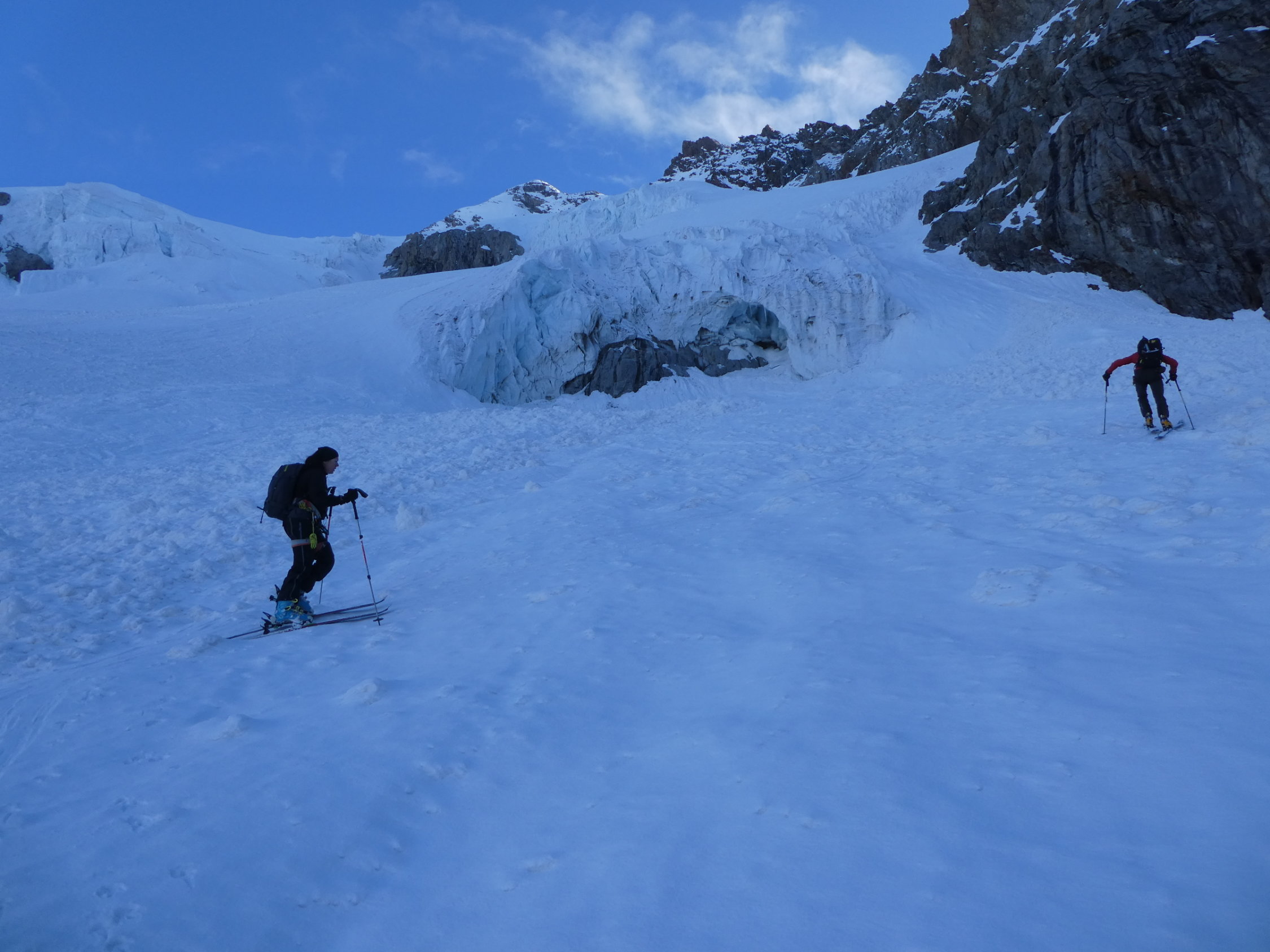 Auf 3600m (über dem Gletscherbruch) haben wir die Skis aufgebunden und sind für ca. 200 m zu Fuss aufgestiegen. Bei der Querung zur Südwestrippe muss viel Lawienenschnee gequert werden. Skidepot auf ca. 3700m. Von hier ist der weitere Verlauf zum Gipfel gut einsehbar. Die letzten 500 m sind streng. Schnee mit leichtem Deckel. Immer wieder durchgebrochen aber gut zu gehen. Der Grat ist gut mit Stangen gesichert.