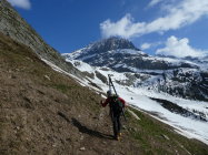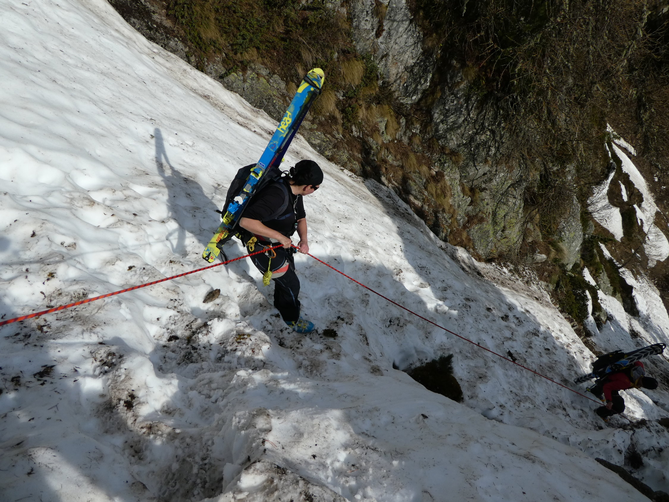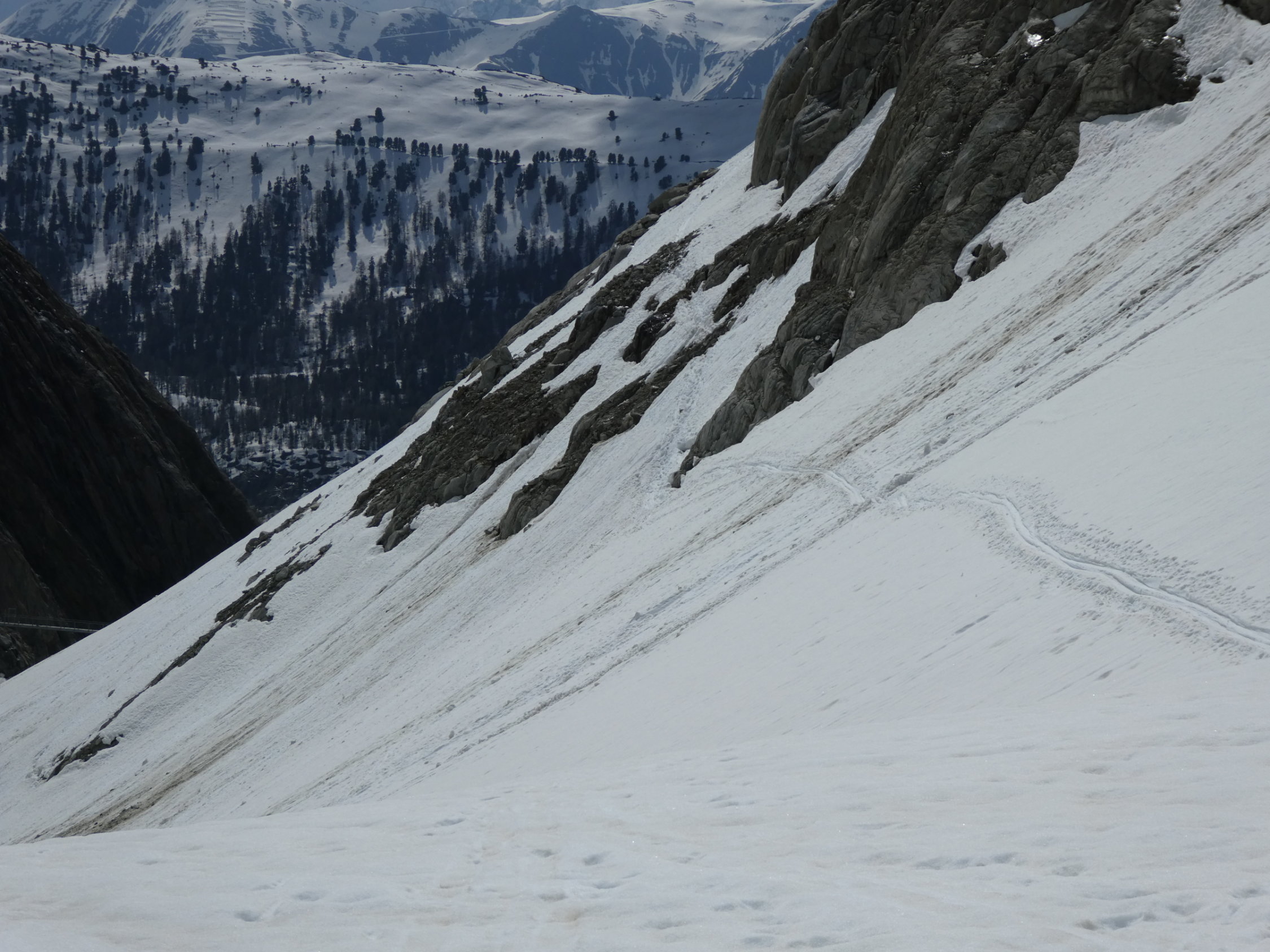 Auf dem Weg zum Hotel Belalp liegt noch genügend Schnee. Von dort noch etwas abgehfahren. Von hier dürfen die Skis für ca. 50 Min. getragen werden. Durch das steile Couloir beim Hirmi helfen fixe Seile. Weiter über den Sommerweg nach Walkern. Immer wieder werden Schneefelder gequert. Viel Dreck vorhanden. Die Querung zum Gletscher hatte am Montag noch genügend Schnee. Am Mittwoch bereits Fussaufstieg. Auch bei der Abfahrt mussten die Ski bereits 2 x abgeschnallt werden.
