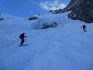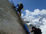 Weiter über den flachen Gletscher zum Skidepot bei ca. 2460m. Sehr gut gesicherter "Klettersteig" führt zur Hütte.