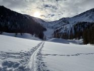 Start um 8:20 Uhr in Les Toules 1305m bei 5 Grad plus. Zunächst im Waldcouloir oberhalb Les Fasses bis gegen 1500 m aufgestiegen, dann mühsame Querung durch den Wald zur Normalspur. Diese dann auch wesentlich besser als das steile Couloir. Bis gegen 1700 m noch Tauwetter, dann zunehmend pulvrig. Ab La Giète dann mehrheitlich Pulver, nur stellenweise harschig/gedeckelt. Auf schöner Spur weiter bis zur Pointe Ronde, 2700 m.