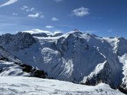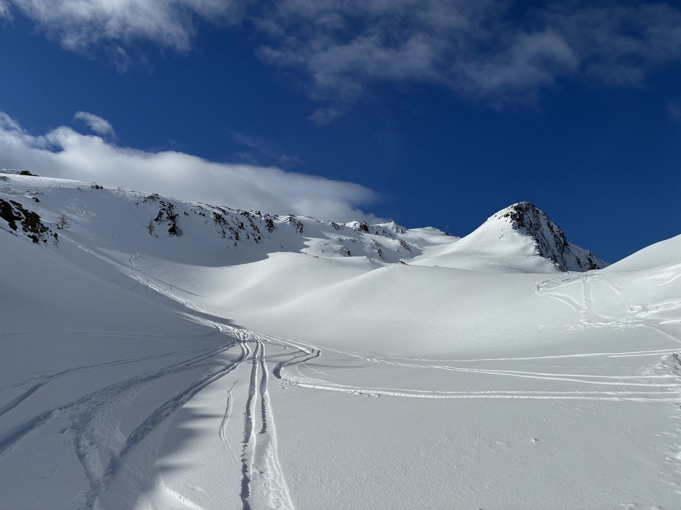 Teils seidenweicher Pow in der Abfahrt, in Anbetracht der Wärme fast schon ein hervorragend. Waldabfahrt unterhalb La Giète sehr speziell, Couloir dann absoluter Murks - halbgefrorener Schnee, Lawinenbollen, Gestrüpp. Nicht empfehlenswert. Gesamthaft aber lohnend.
