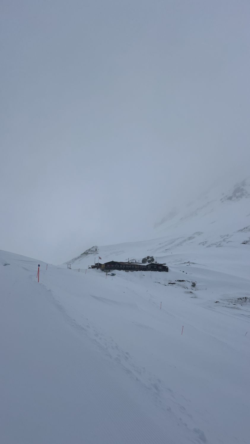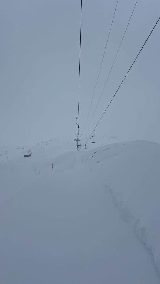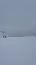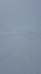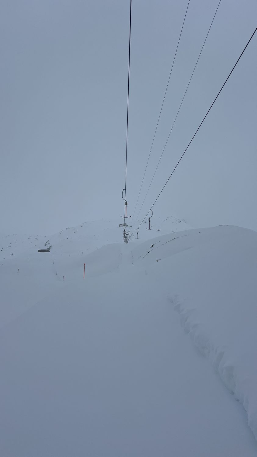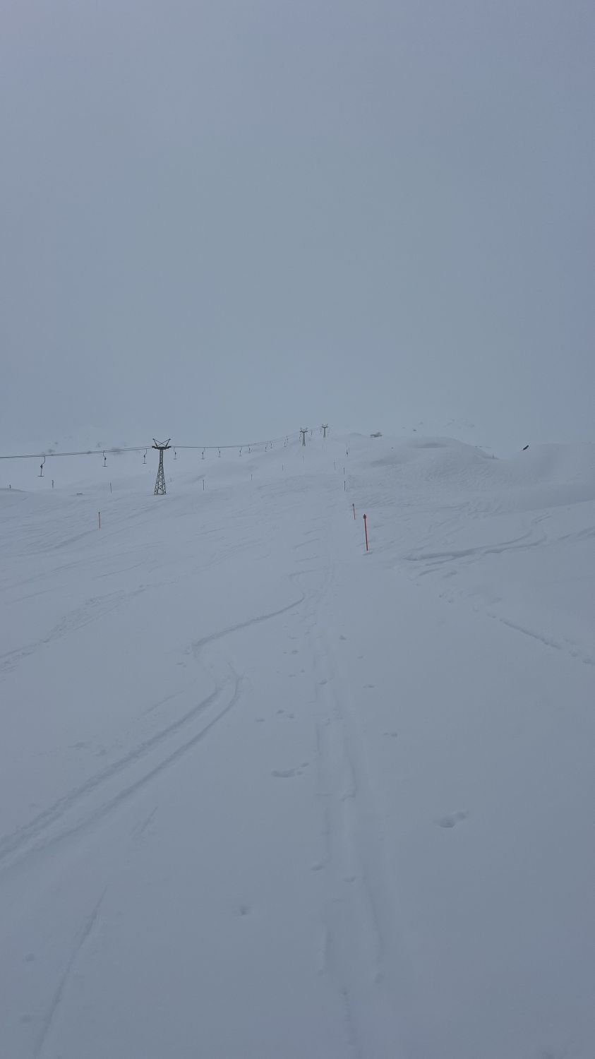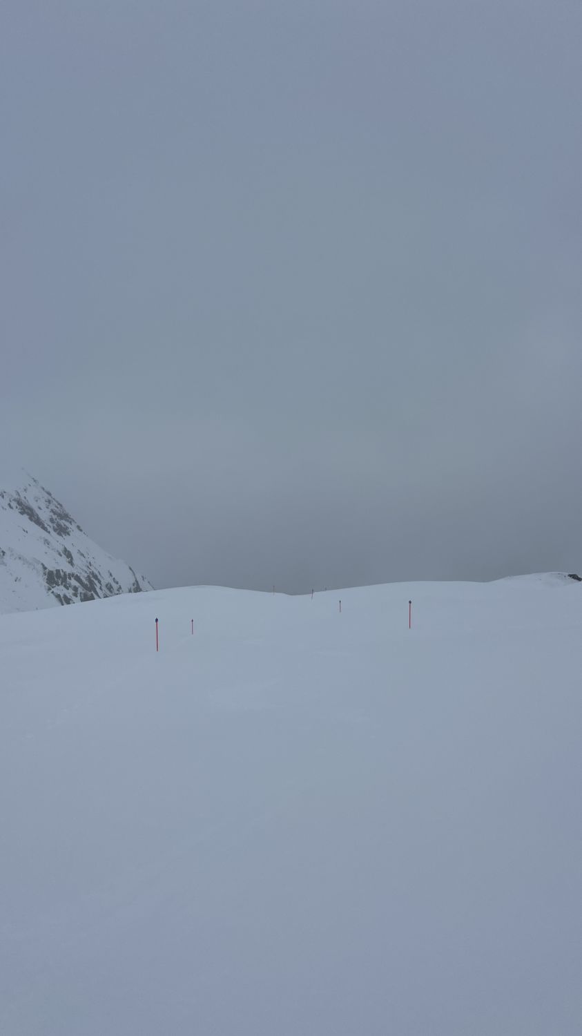 Nasschnee bis zur Passhöhe, Plustemperaturen. Dennoch ein Gut, weil der Schnee auf der frisch eingeschneiten Piste sich „sidefiin“ fahren lässt, ähnlich wie Sulzskifahren. Wer neben der Piste fährt eher „machbar“, da der nasse Schnee gehörig bremst.