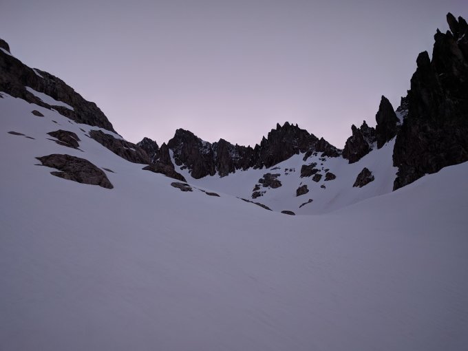 Beim Start um 4:00 war der Schnee noch nass, so dass es einfacher war, die Ski bis zur Querung der Strasse zu tragen. Danach weiche Deckschicht bis ca. 2400, ab da ein Schäumchen Neuschnee.