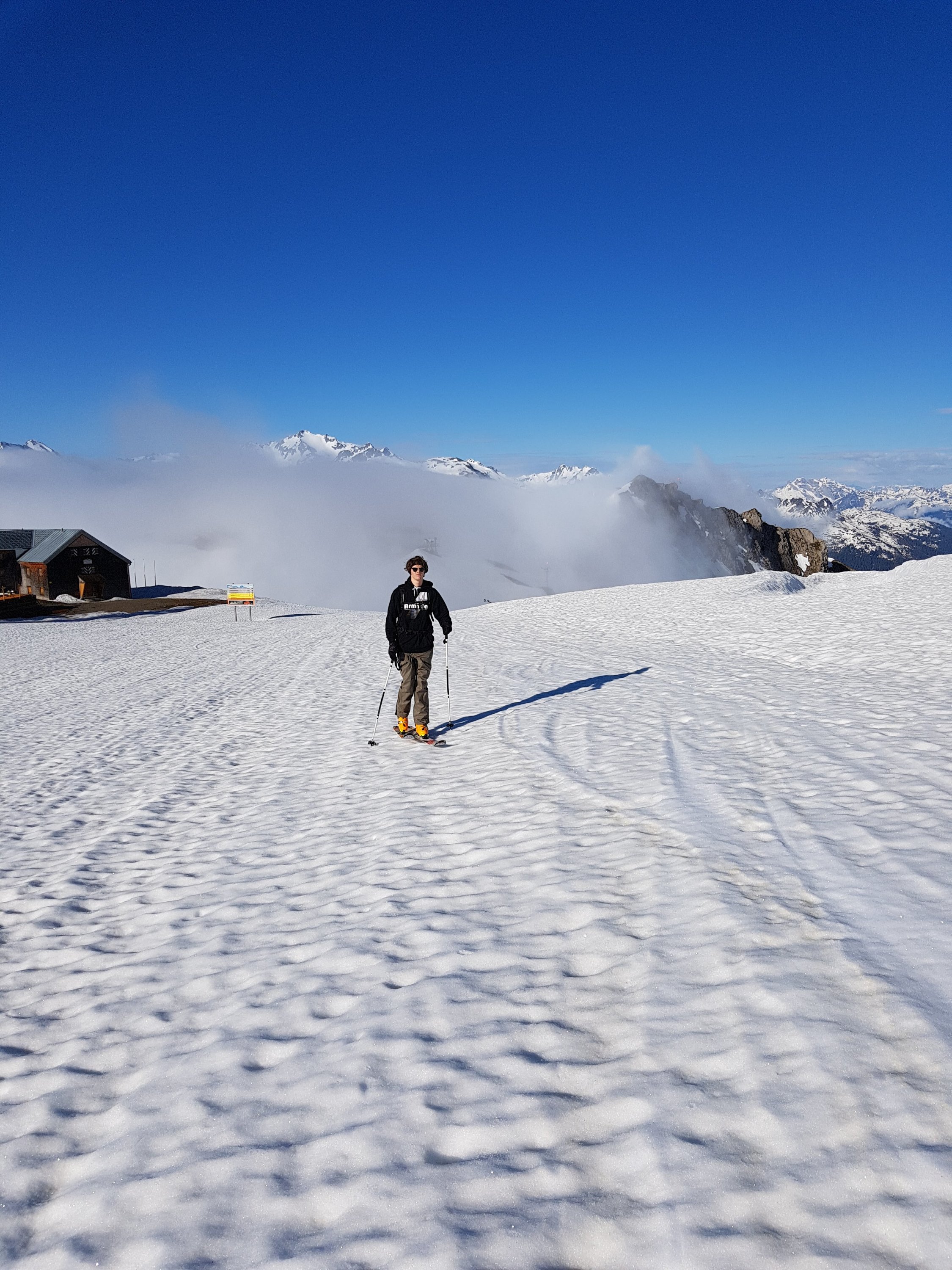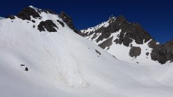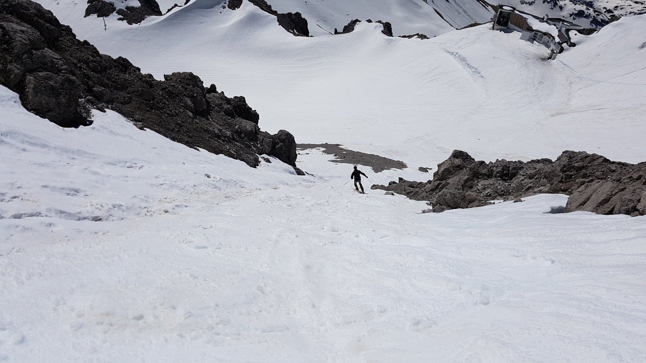 Auffellen war auf ca. 1700m möglich. Von Mittelstation Vallugabahn bis Gipfelstation sehr sehr weich, sodass wir zu Fuß hochklettern musst. Drahtseil meist schneefrei. Abfahrt durch die einzige Schneeverbindung durch die Felsen (breitere Rinne)nach unten ging gut.