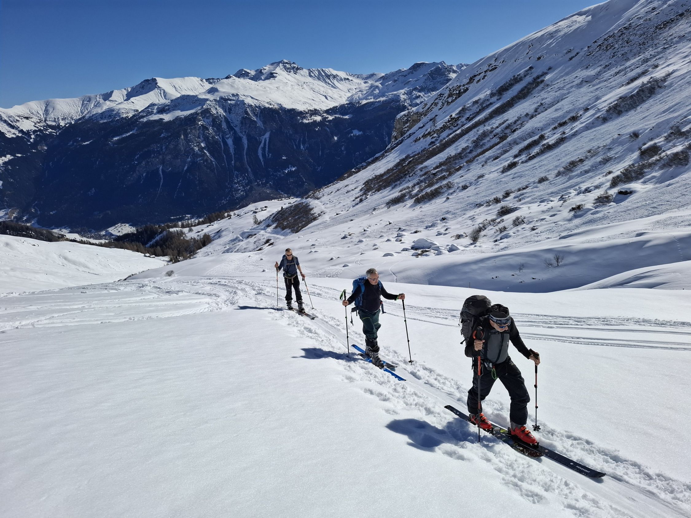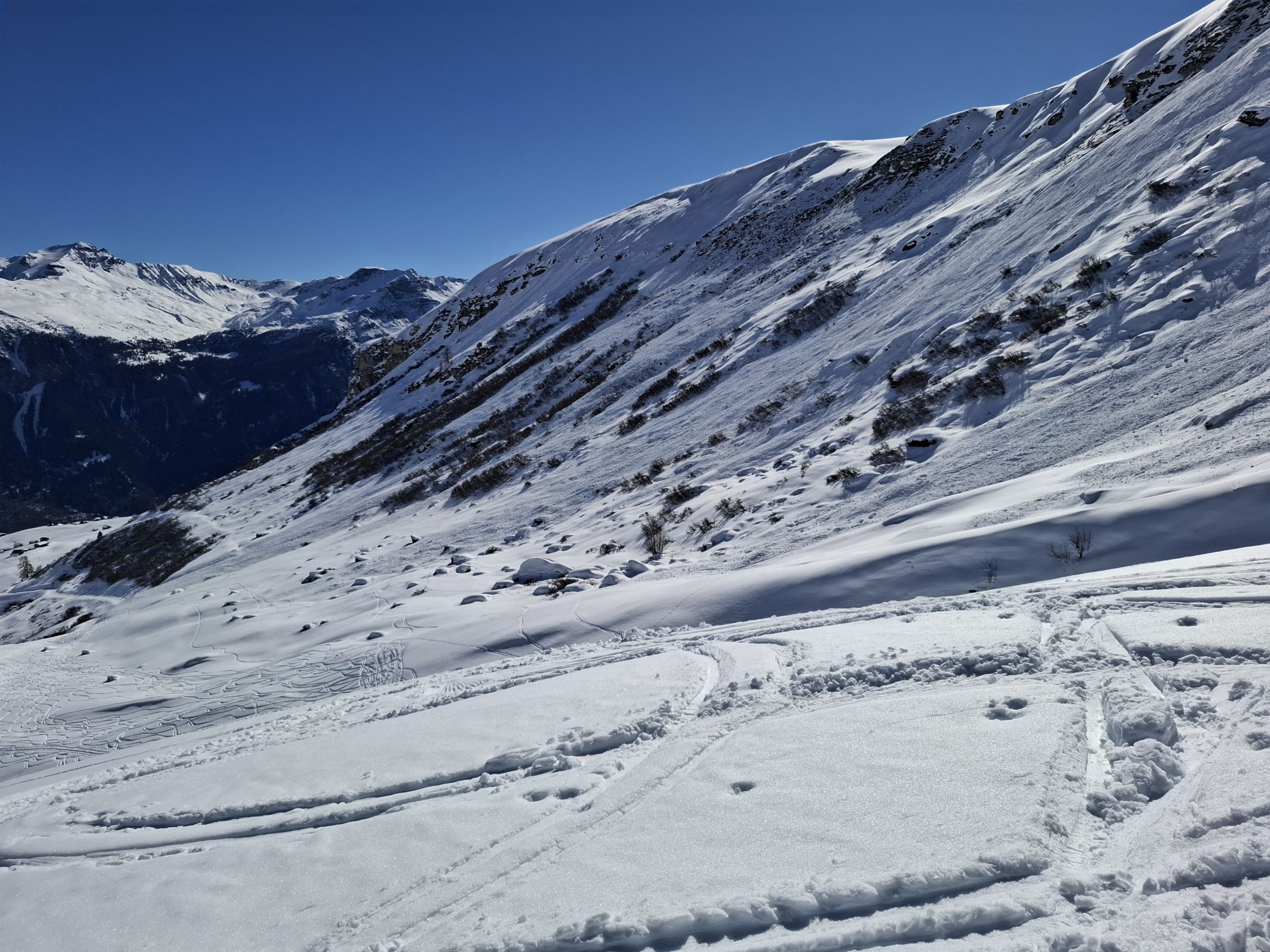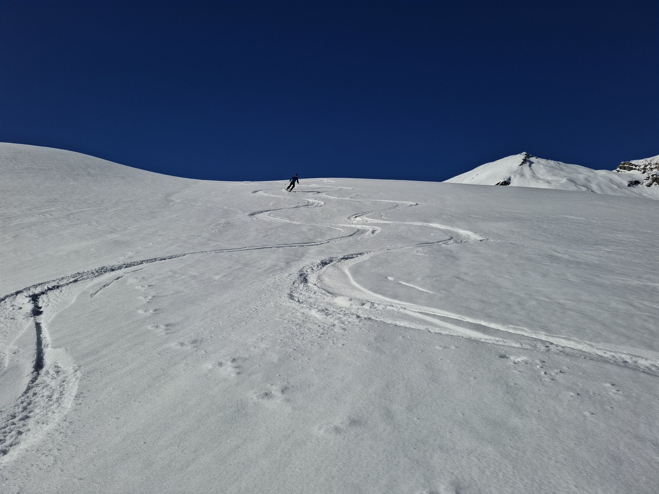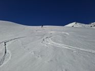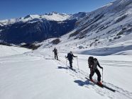 aufgrund der nächlichen Abstrahlung war die Spur hart aber gut griffig. Die Schneeoberfläche war beim Aufstieg noch gefroren, sulzte jedoch bald auf. Bei der Abfahrt, um ca. 13 Uhr, hatten wir meist herrlichen Sulz. Nur Ostexpositionen hatten schon einen leichten Deckel. Fanden wir oben noch unbefahrene Hänge, waren die Hänge unten schon ziemlich verspurt, was aber im weichen Schnee nicht gross störte.