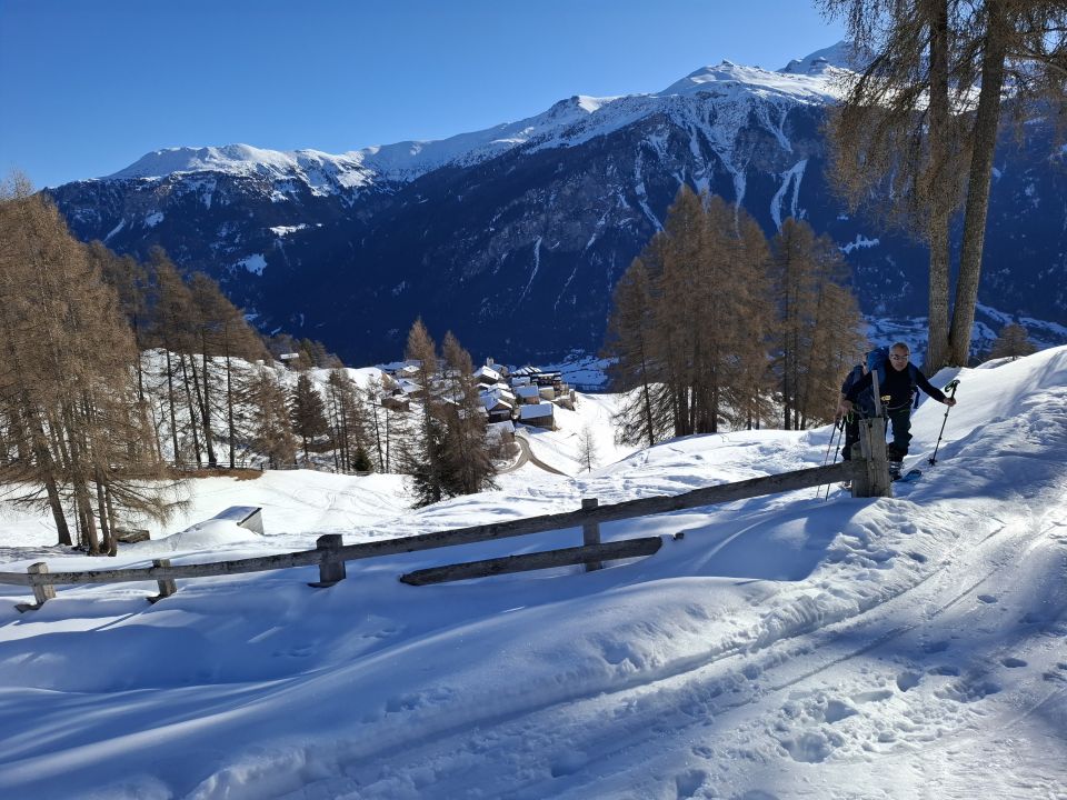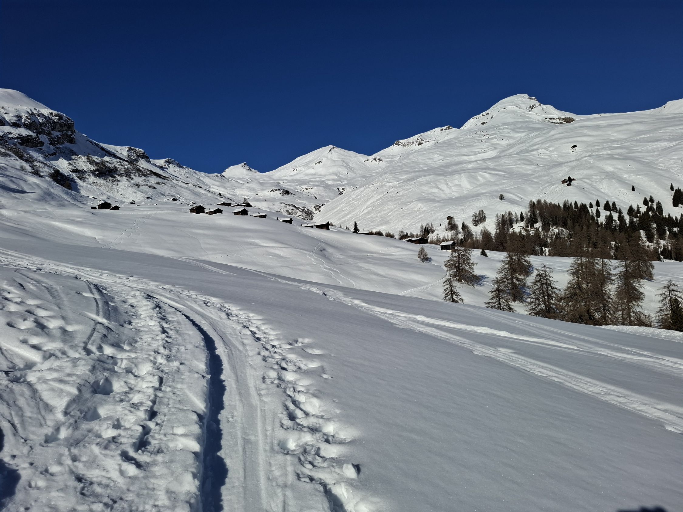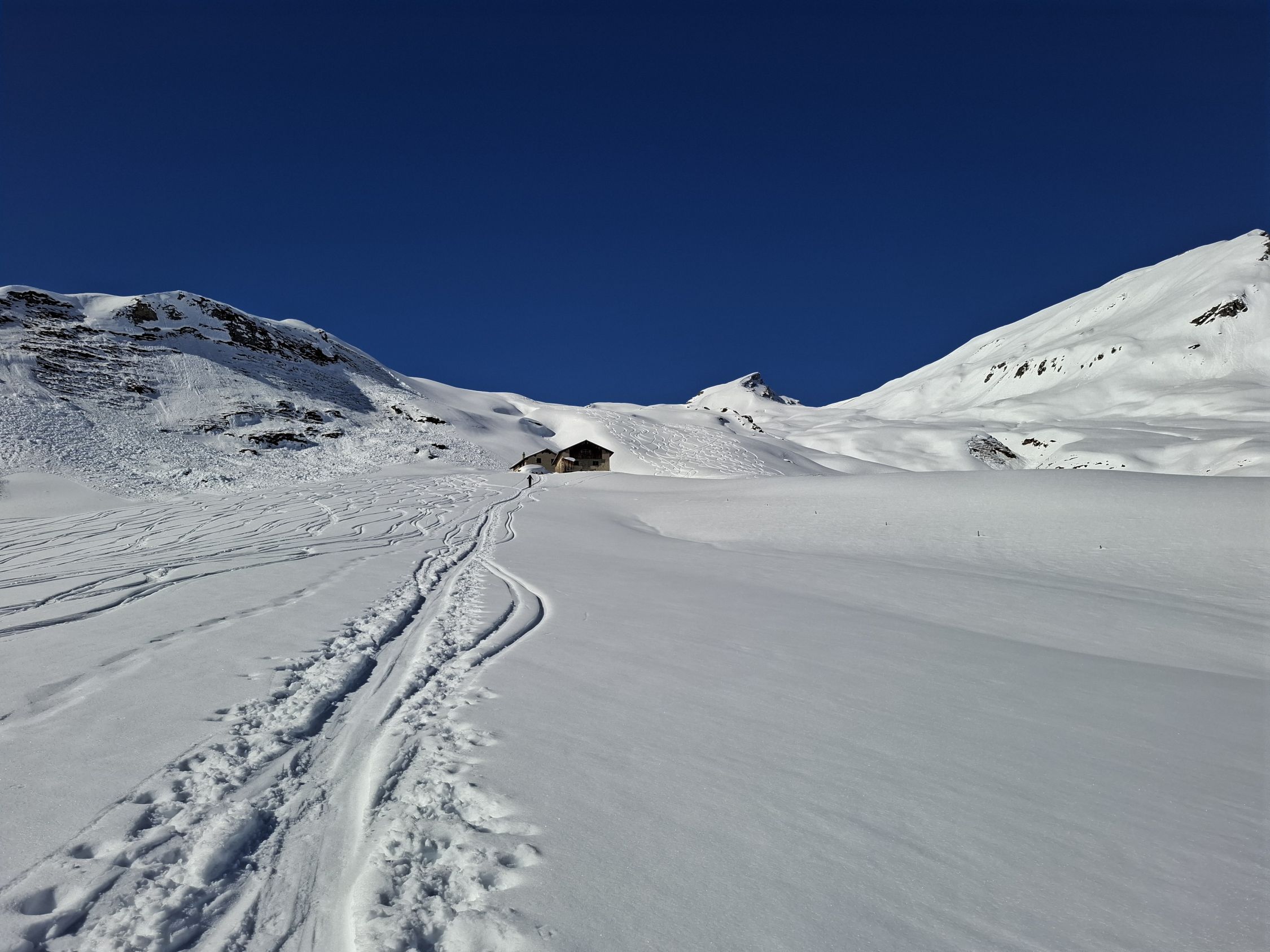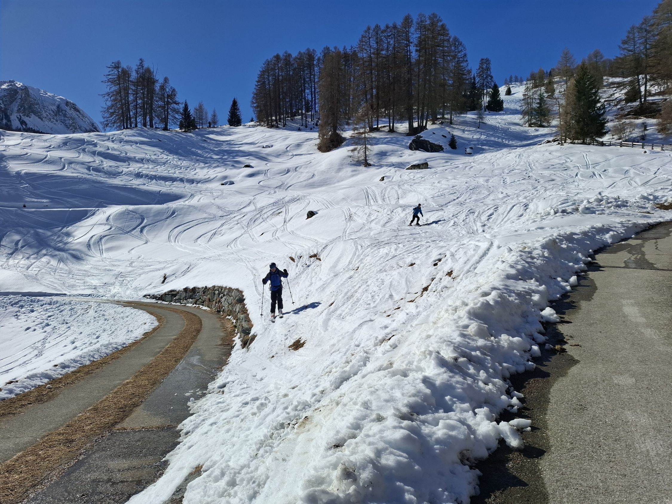 aufgrund der nächlichen Abstrahlung war die Spur hart aber gut griffig. Die Schneeoberfläche war beim Aufstieg noch gefroren, sulzte jedoch bald auf. Bei der Abfahrt, um ca. 13 Uhr, hatten wir meist herrlichen Sulz. Nur Ostexpositionen hatten schon einen leichten Deckel. Fanden wir oben noch unbefahrene Hänge, waren die Hänge unten schon ziemlich verspurt, was aber im weichen Schnee nicht gross störte.