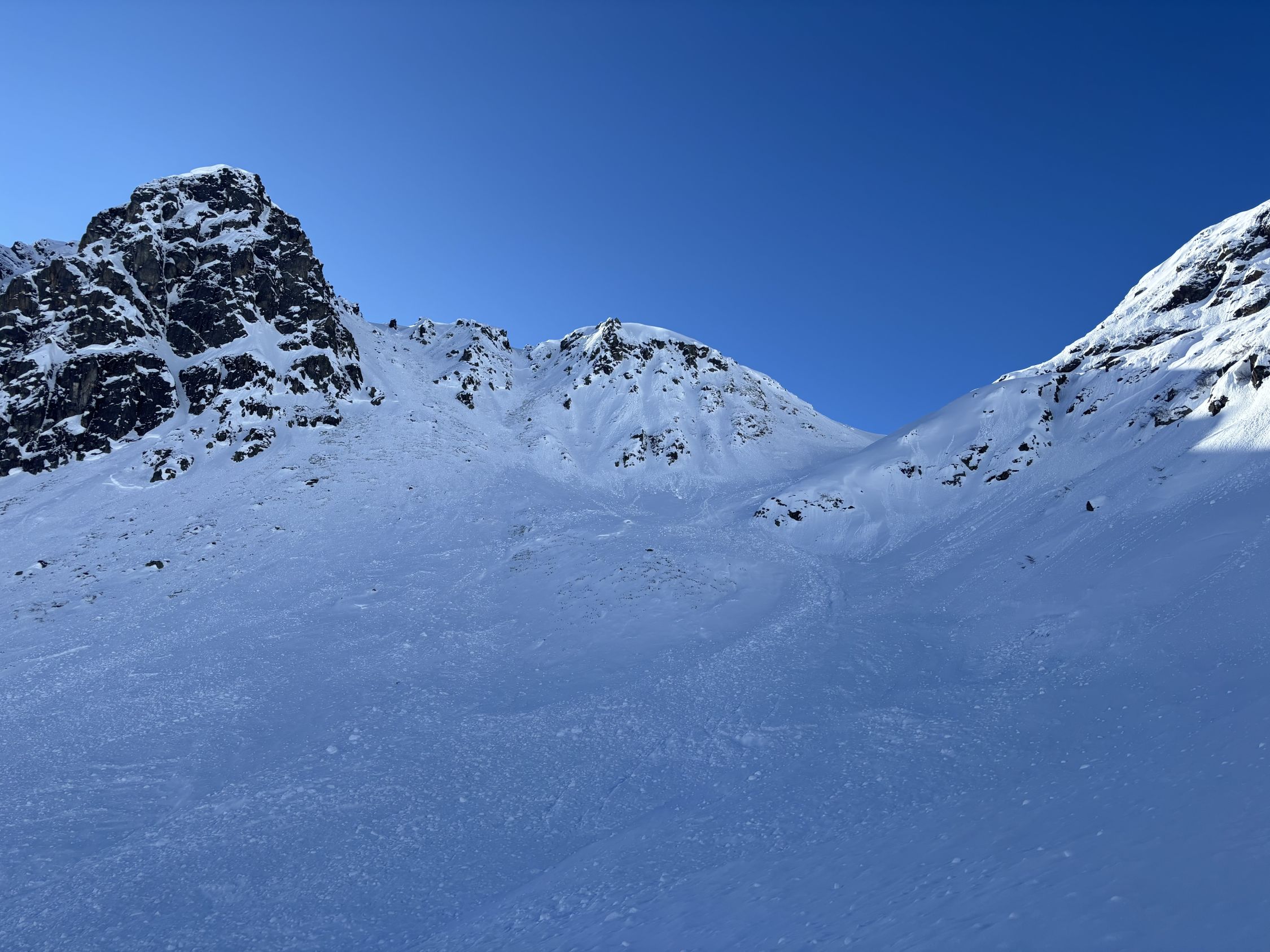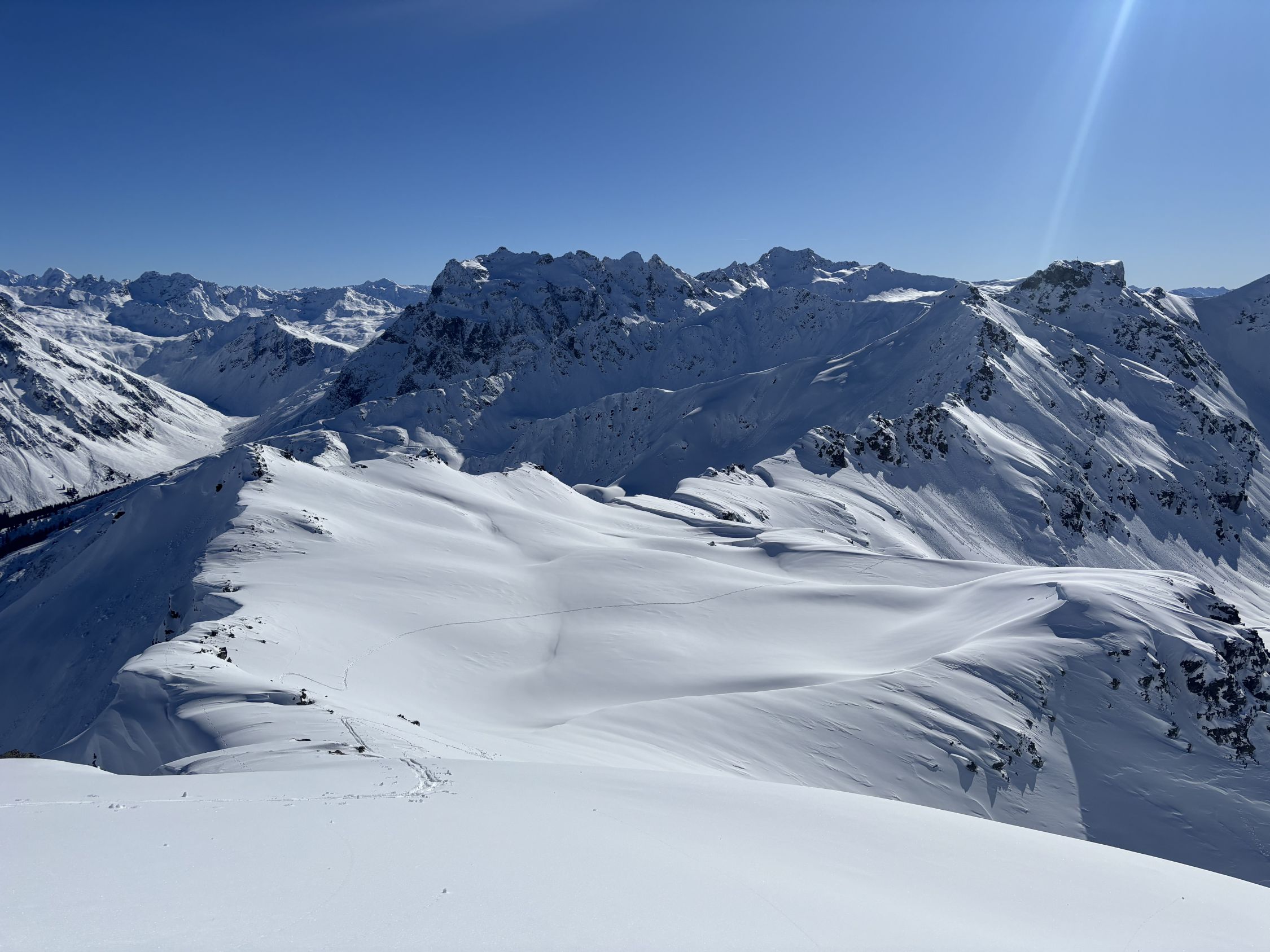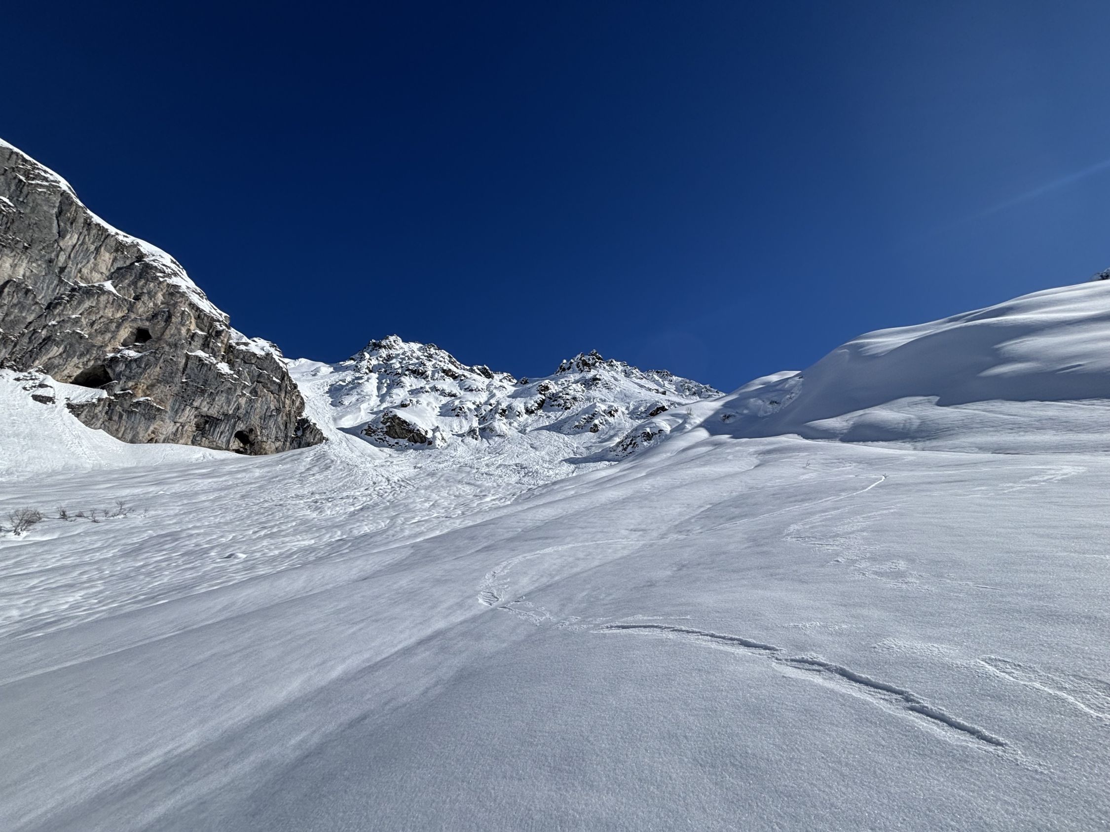 Auf der Nordseite vom Schlappinerjoch hatten sich bereits die meisten Hänge selbst entladen. Entsprechend war es m.E. vertretbar. Nichtsdestotrotz waren dir Lawinenkegel beeindruckend. Tragende Schneedecke bis zum Skigebiet Gargellen. Vom Skigebiet bis zum St. Antönierjoch wiederum tragend. Habe danach noch den Rotspitz angehängt und bin dann auf angenehm harter Unterlage nach Partnun abgefahren. Ab ca. 1900müm dann zunehmend weich. Strasse bis zum P4 mit Schnee bedeckt.