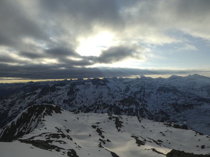 Aufstieg vom Berghaus beim Schweizer Zoll (nicht wie im Routenbeschrieb vom Skigebiet her). Beim Start 4.5° C und bedeckter Himmel. Das Wetter war eindeutig schlechter als vom SRF-Meteo angesagt. Der Pizzo Tambo hielt sich anfangs noch hinter Wolken versteckt. Trotzdem gut tragende Schneedecke. Aufstieg durch die Südostflanke problemlos. Erst kurz vor dem Gipfel durch eine Rinne in die Südflanke und über Felsen zum Gipfel. Pickel und Steigeisen waren v. a. für diese Rinne dienlich. Der ganze Normalaufstieg ist nach wie vor sehr gut eingeschneit. Abfahrt durch das N-Couloir war offen gestanden nicht das Gelbe vom Ei. Ganz oben noch recht gut (1-2 cm Neuschnee auf ziemlich harter Unterlage), weiter unten dann zunehmend ruppig (von Steinschlagrinnen und Lawinengleitbahnen durchsetzt, was die Abfahrt ziemlich anspruchsvoll machte). Bin weiter unten gegen Osten in die Nordflanke ausgewichen. Aber Vorsicht: Man muss zwingend wieder zurück ins Couloir, weil ein Felsriegel ganz unten die Nordflanke durchzieht. Der Auslauf des immerhin 600 m hohen Coulis ist auf der ganzen Breite ein riesiger Lawinen