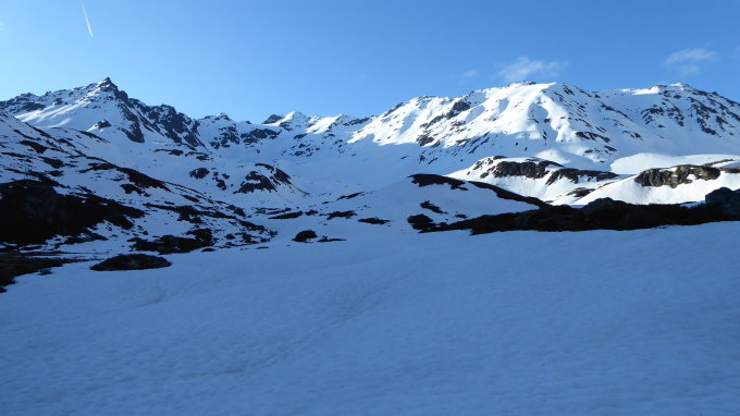 Ab Dürrboden 7h + 4°C 5 min Skitragen, erst ab 2200 griffigem Hartschnee, Gipfel Schlussaufstieg zum Chüealphorn zu Fuß wenig Schnee und weich, Firn Abfahrt Scaletapass ca. 2500m Aufstieg Scalettahorn Firnabfahrt zum Scalettapass da nicht so weich, nachher weich und Bremsschnee