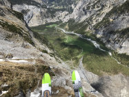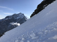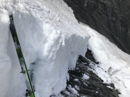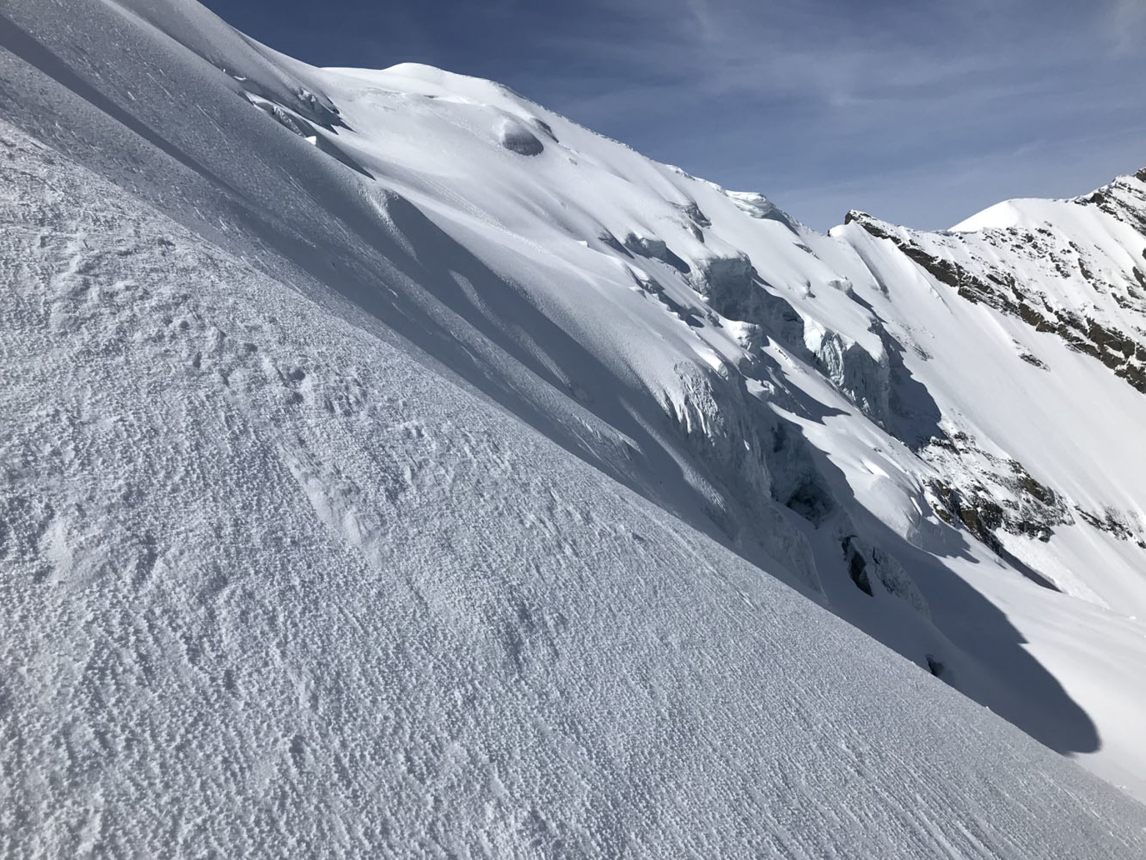 Der Hüttenweg zur Balmhornhütte war gut begehbar. Ab ca. 1900m war die Schneedecke, welche dank der guten nächtlichen Abstrahlung tragend gefroren war, durchgehend mit Skis begehbar. Der Gletscher war sehr gut eingeschneit, jedoch haben sich auf den Felsplatten auf ca. 2300m grosse Fischmäuler geöffnet. Im linken und rechten Wandteil hingen auf ca. 3500m Seracs. Die Linie in der Mitte des Gletscherkessels schien jedoch recht sicher. Beim Aufstieg querte ich zu Pt. 3402 auf dem Nordgrat und stieg von dort exponiert mit den Skis weiter auf den Gipfel. Für eine Portage war der Schnee zu weich. Abgefahren bin ich in der Gipfelfalllinie, der Abbruch auf ca. 3500m war problemlos, jedoch steil (gut 45° auf 120 HM).
