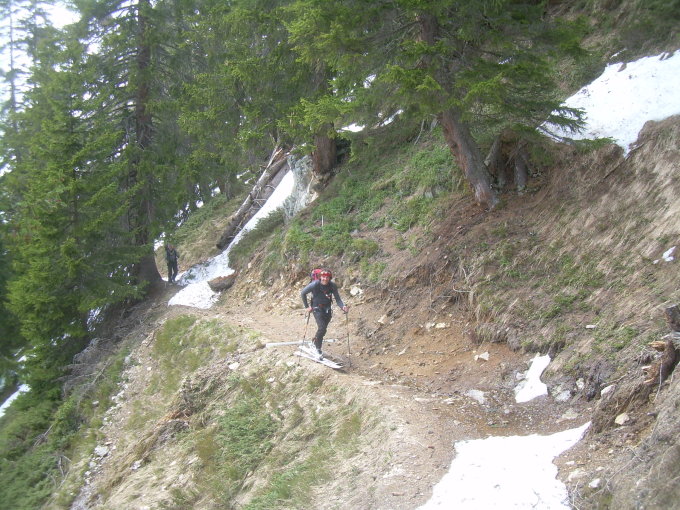 Dachte ich im Aufstieg noch, über den harten Firn sehr gut mit Steigeisen vom Gipfel aus in den Gehrenpass zurückkehren zu können, wurde ich eines Besseren belehrt, denn trotz mangelnder Sonneneinstrahlung wurde der Hang allein durch warmen Lufttemperaturen aufgeweicht und trug somit nicht mehr gut. Anders dann mit Wechsel zurück auf Schneeschuhe ab Gehrenpass: gelegentlich konnte ich die Hänge hinuntergleiten, wie auf Kurzskiern.