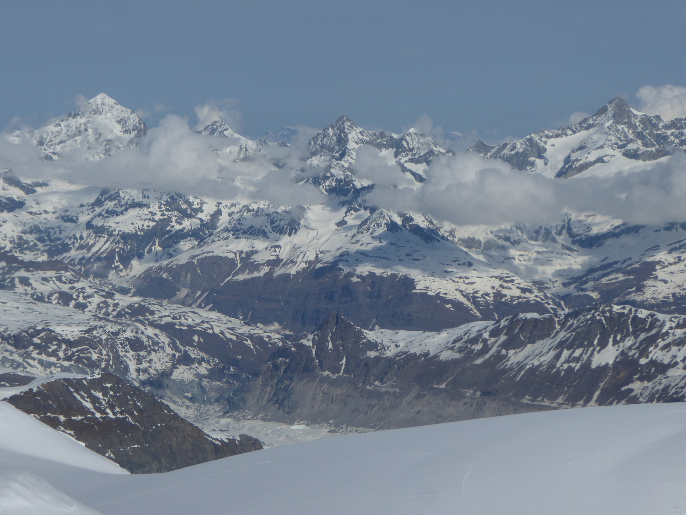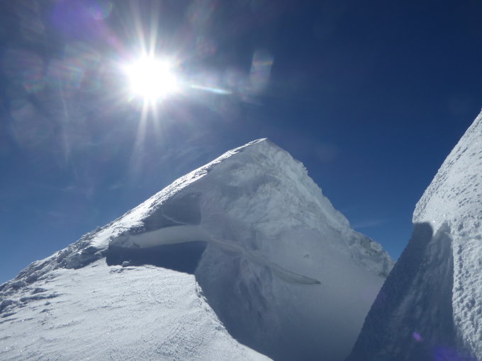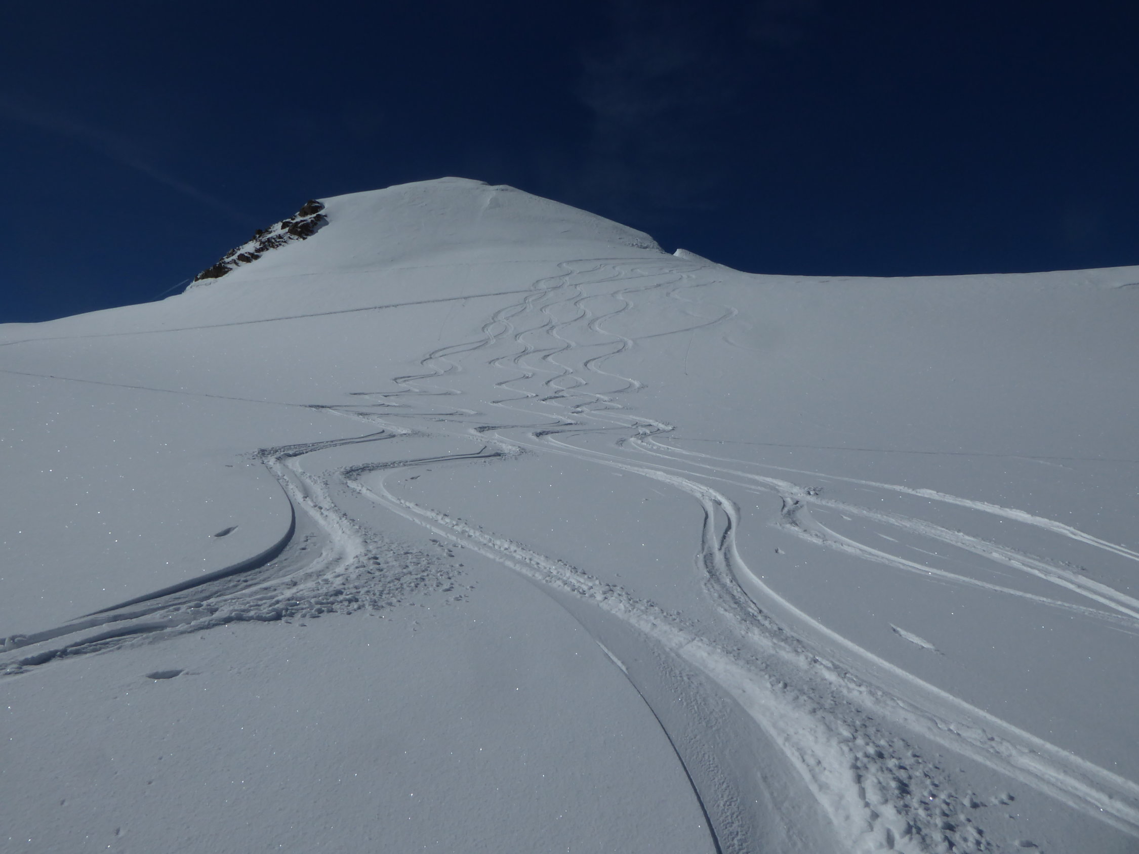 Letzte 10 Meter Steigeisen, sonst alles mit Ski machbar. Tolle Schneeverhältnisse, im oberen Teil (über 4000 m) Pulverschnee.