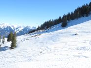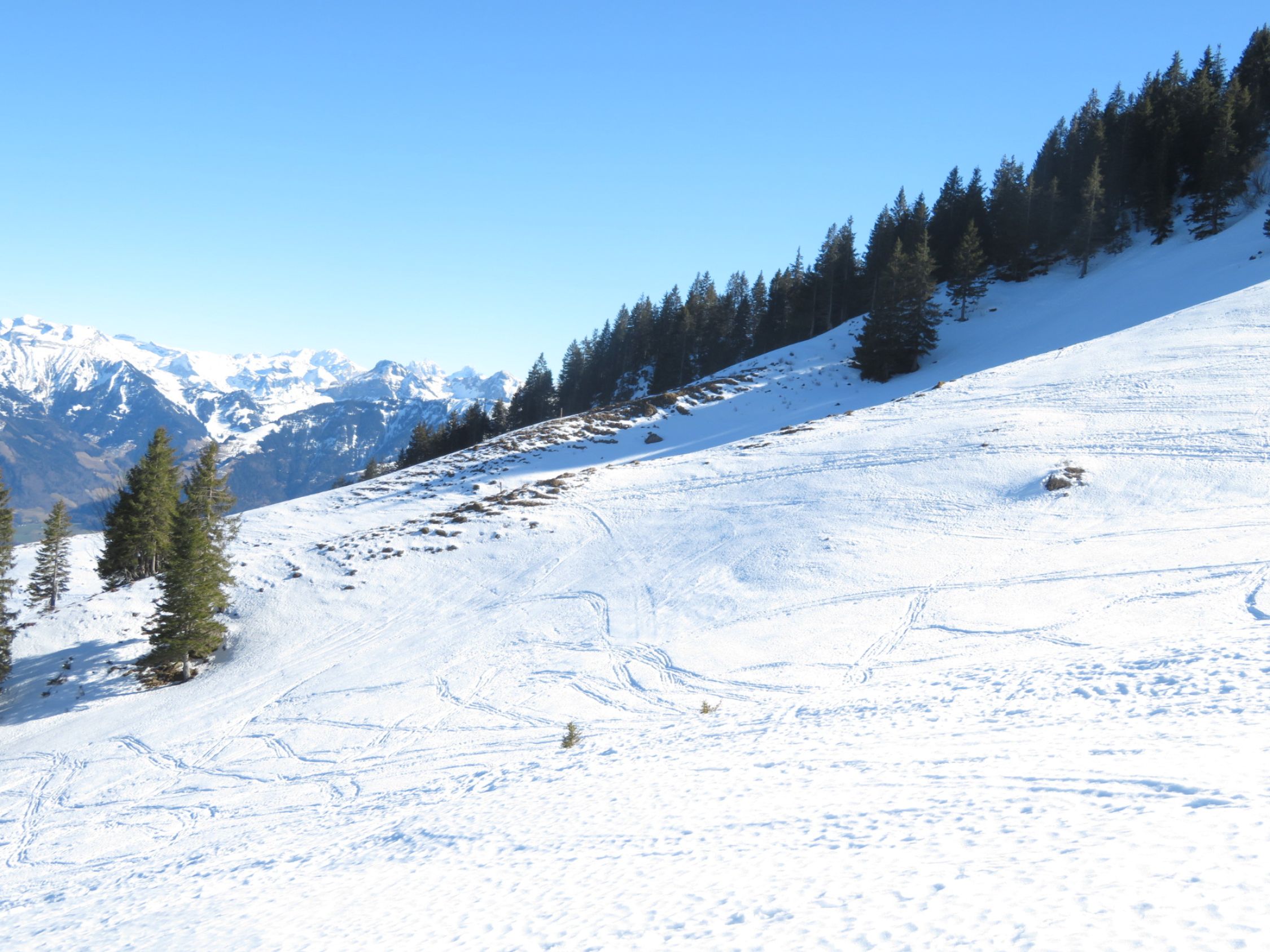 Die Wärme setzt dem Schnee zu. Besonders die Abfahrt zur Ochsenalp wird schwierig, da der Schnee zunehmend fehlt.