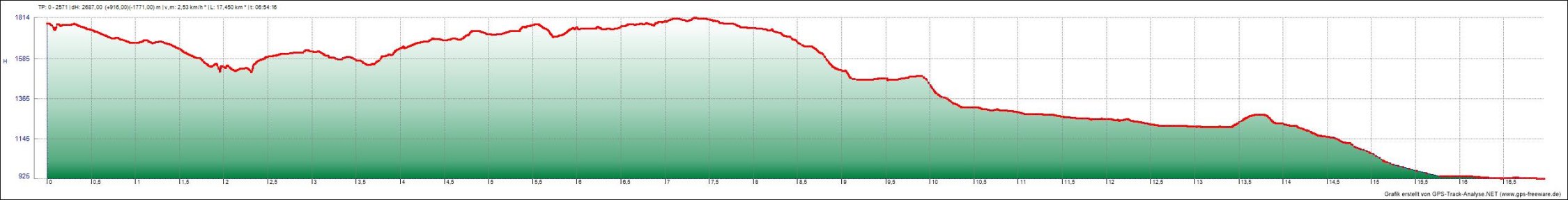 Trotz Bergbahnauffahrt doch gut 900 Aufstiegshöhenmeter, ca. 1770 Abstieghöhenmeter bei ca. 17 km Gehstrecke.