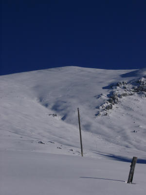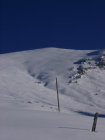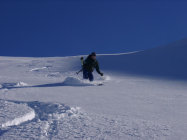 In der Gipfelflanke Pulverschnee mit fiesen versteckten Steinen. Die linke Seite ist abgeblasen und zahlreiche Steine gucken aus der Schneedecke. Allerdings ist das am Wiriehorn selten anders.