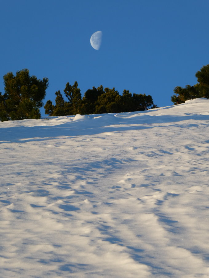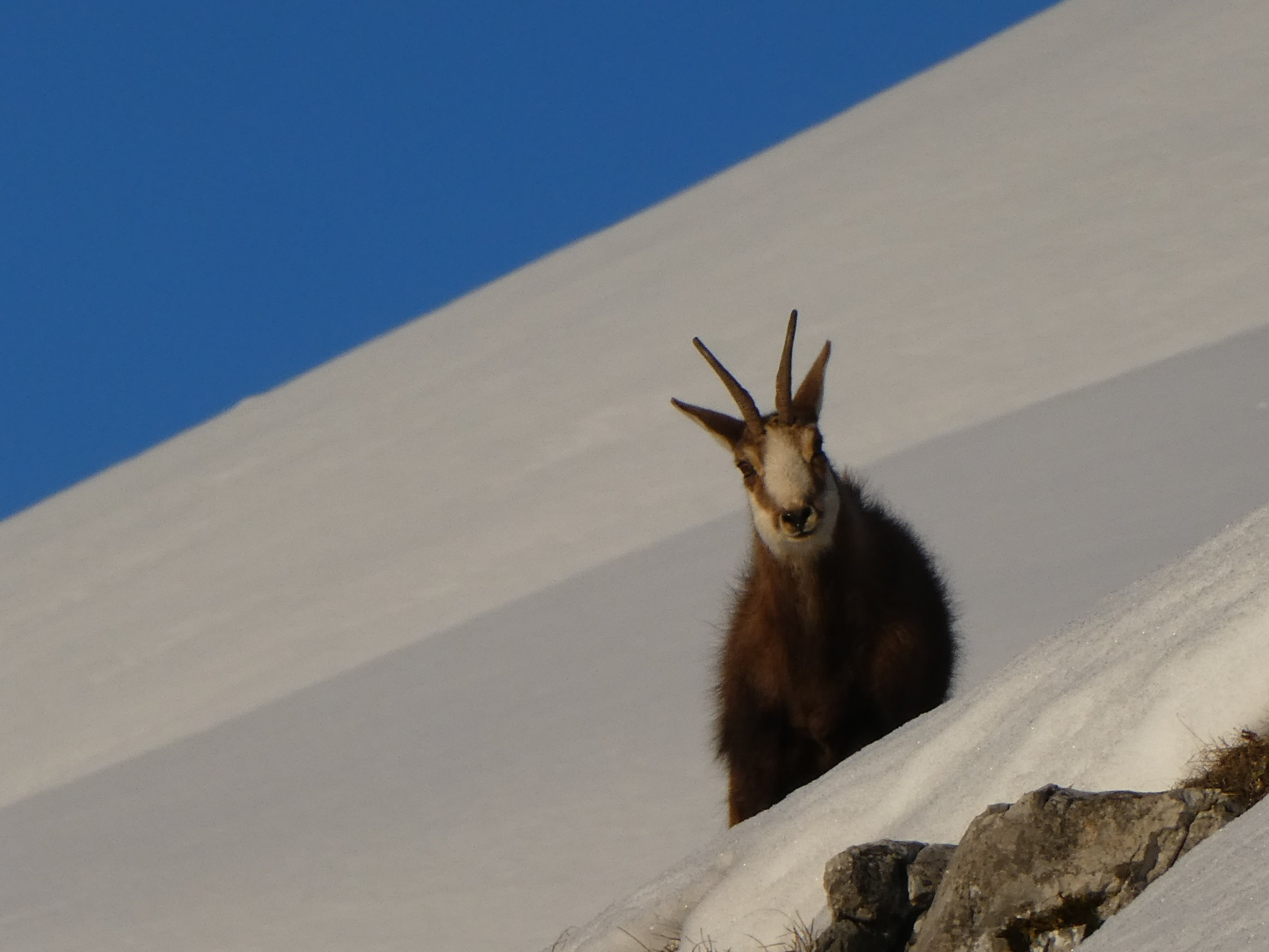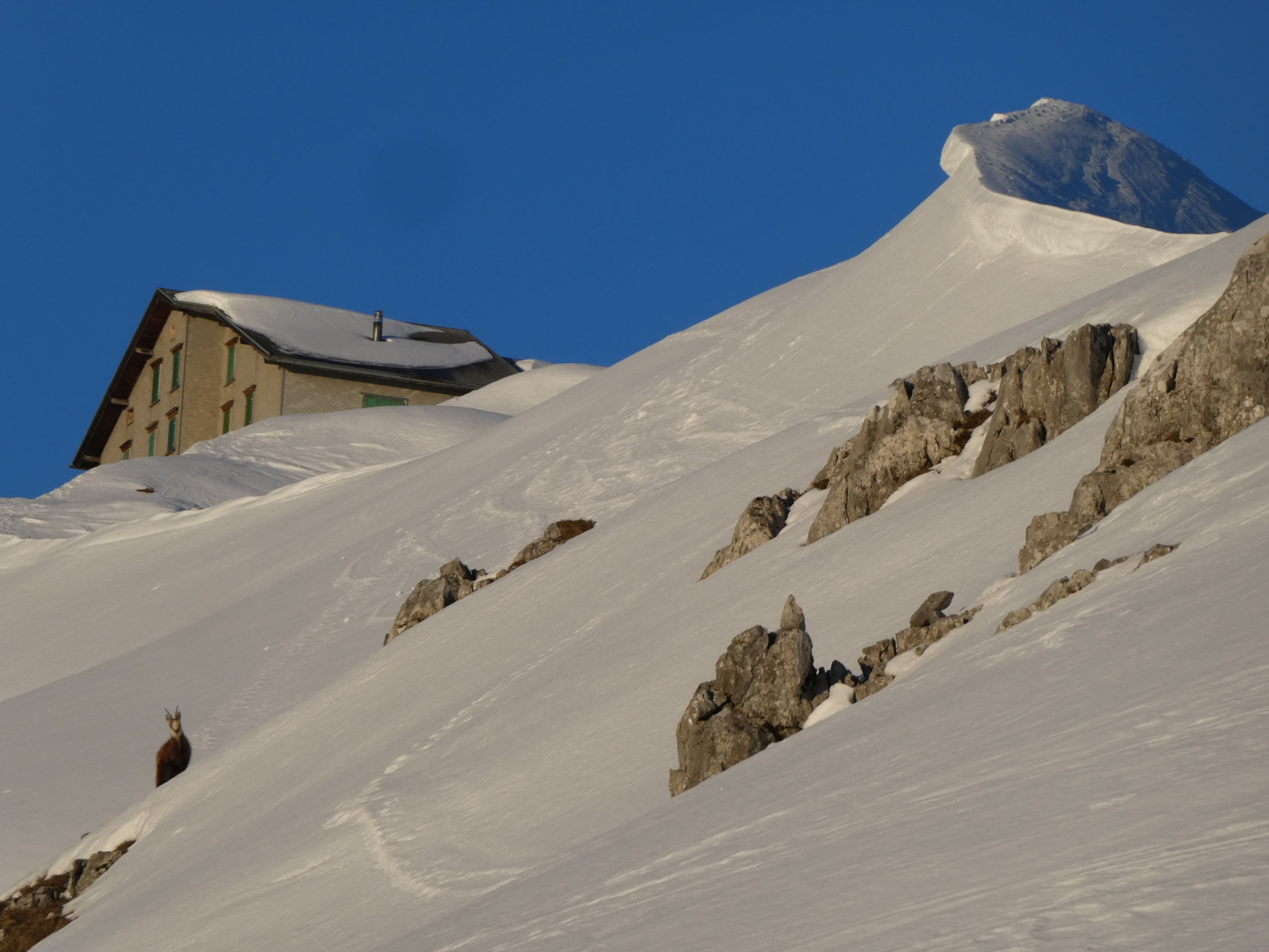 Wunderschöne Morgentour! Oben traumhafte Schneeschuh-Verhältnisse mit sehr viel Schnee! Unterhalb Eugst kaum Schnee. Keine Menschenseele unterwegs, dafür Gämsen und Schneehühner.