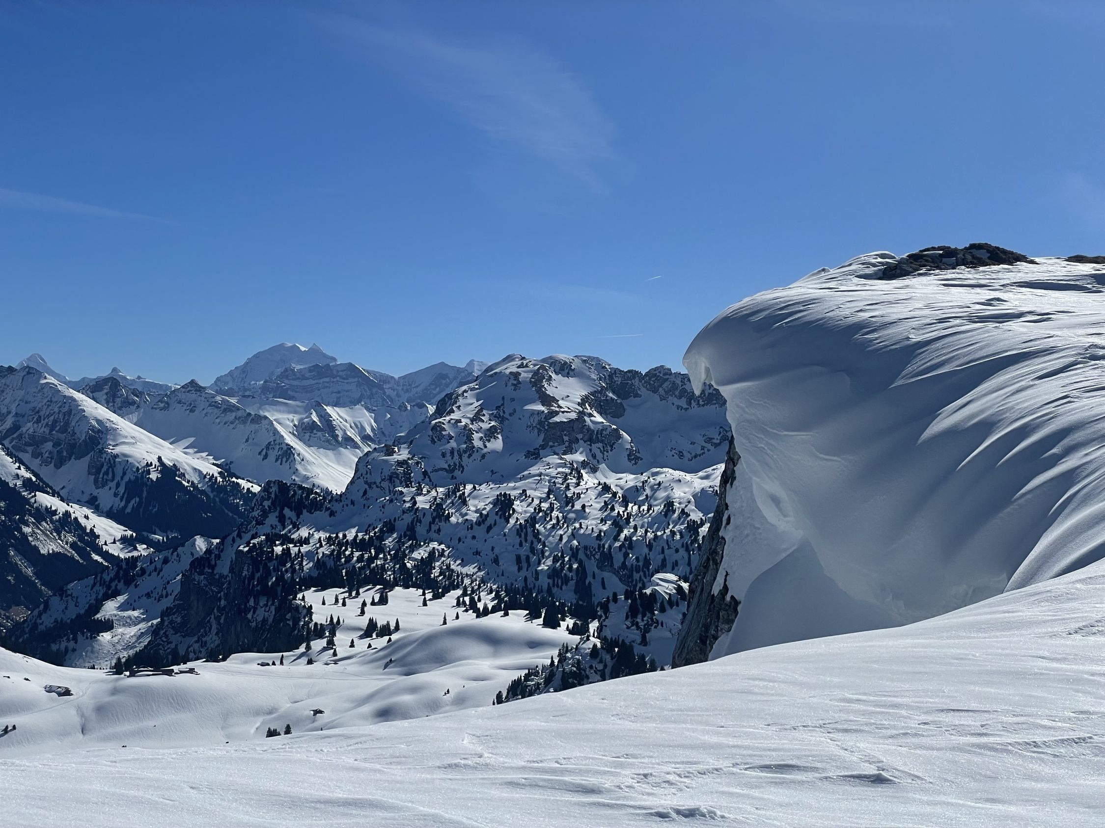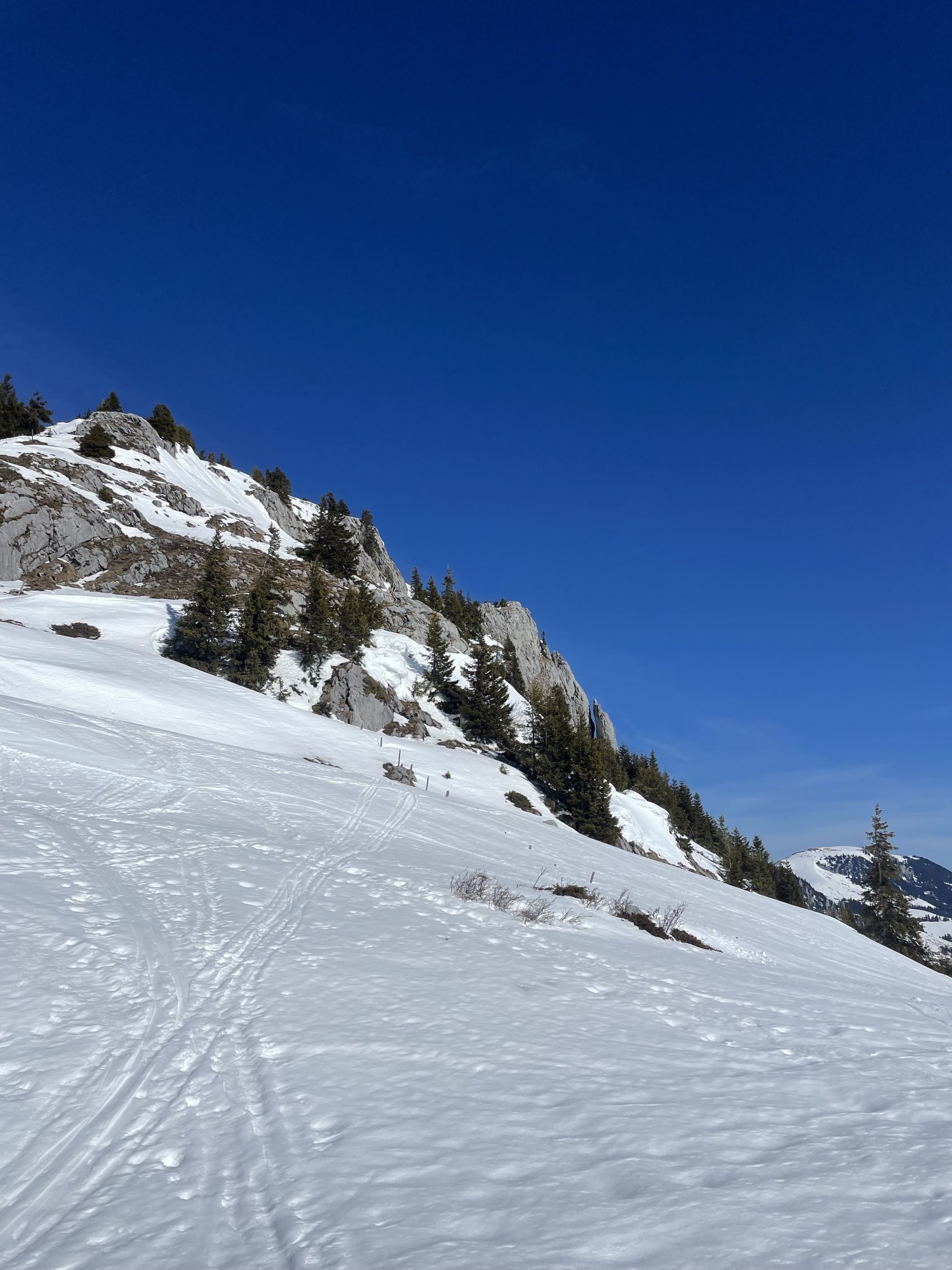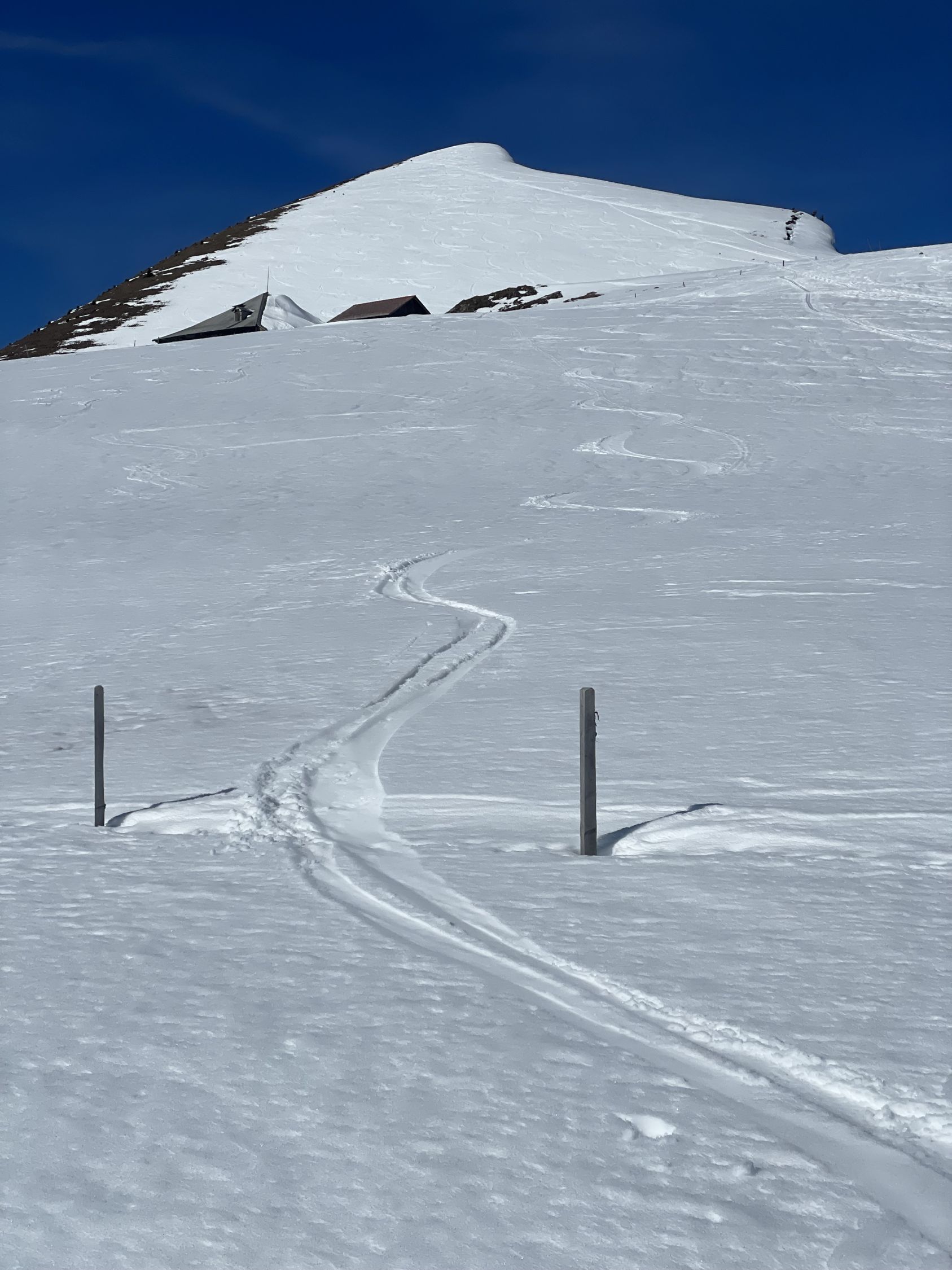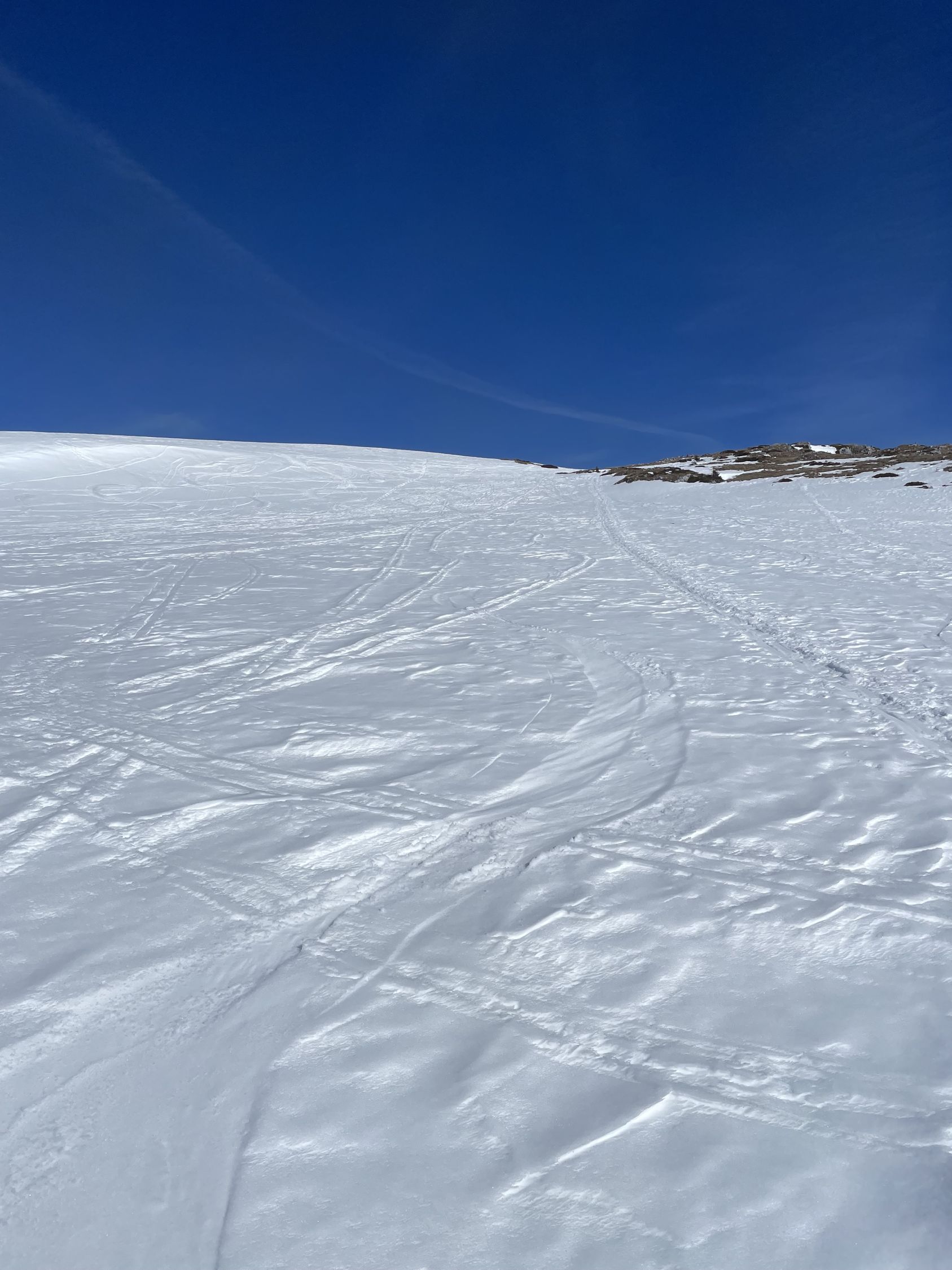 Start am PP Meniggrund um 10.00 bei 3 Grad und grand bleu. Schnee hat es vom Start ab genügend. Abkürzung gut zu gehen. Ich erwartete viele Leute, es waren aber eigentlich nur zwei grosse Gruppen Schneeschuhgänger und einige Türeler. Aufstieg bestens, am von unten gesehen rechten Rand des Chäli. Ich hoffte hier auf umgewandelten Firn dank Westexposition. Oben waren schon drei, ich fuhr sofort runter, da ich noch auf den Lueglespitz wollte (südliche Expo). Abfahrt Chäli war effektiv recht schöner Firn, nicht immer ganz tragend, aber gut. Dann rasch auf den Lueglespitz, und dort schöne Rast alleine. Die Abfahrt hier war top mit schönem Firn bis fast Obergestelen. Dann bin ich den vielen Spuren bis zum Brüggli ausgewichen (hihi!), hier nicht mehr top aber fahrbar. Ab Brüggli dann die Alpstrasse, guter Schnee bis zum PP, aber viele Löcher von Fussgängern, schade.